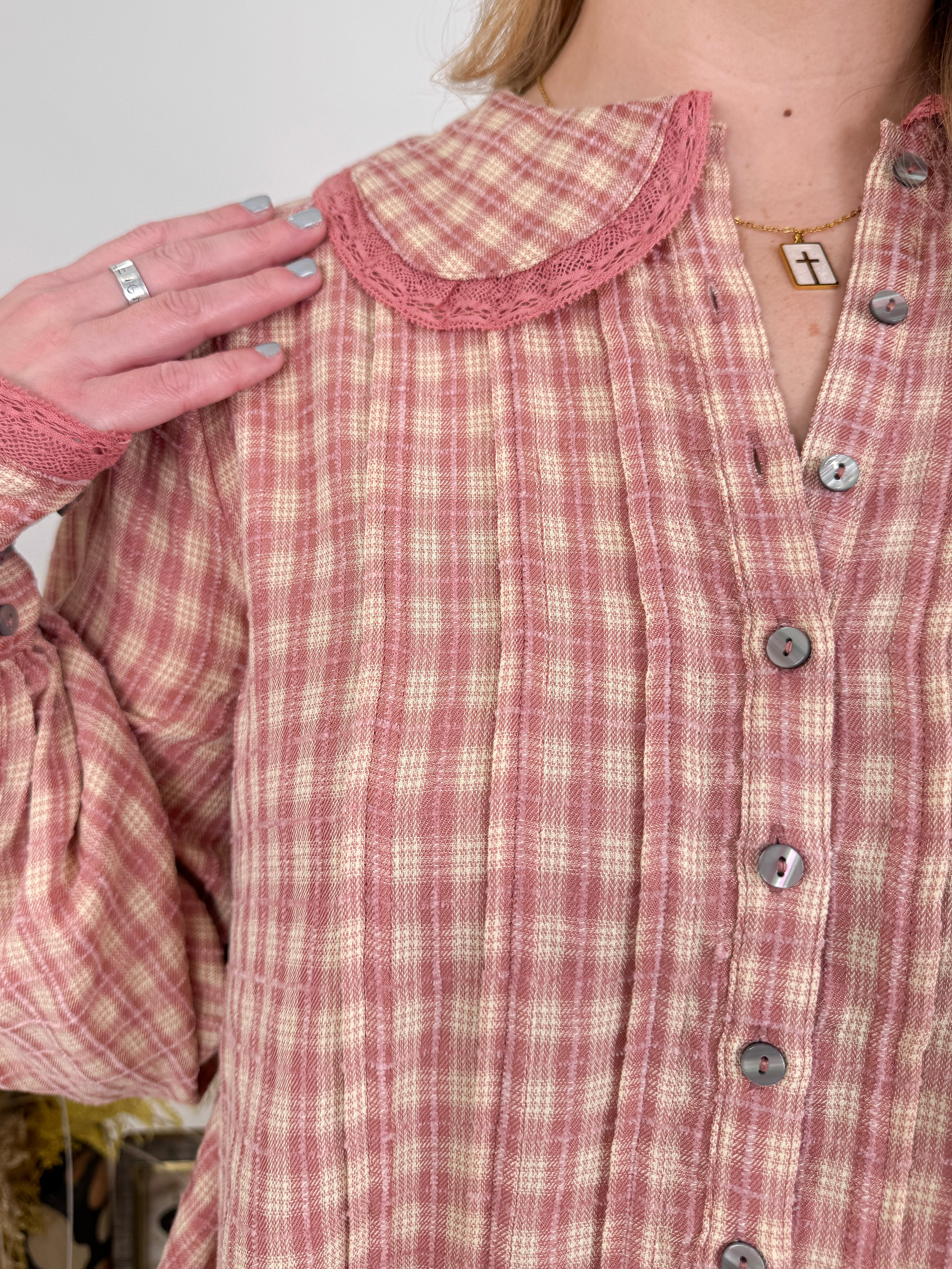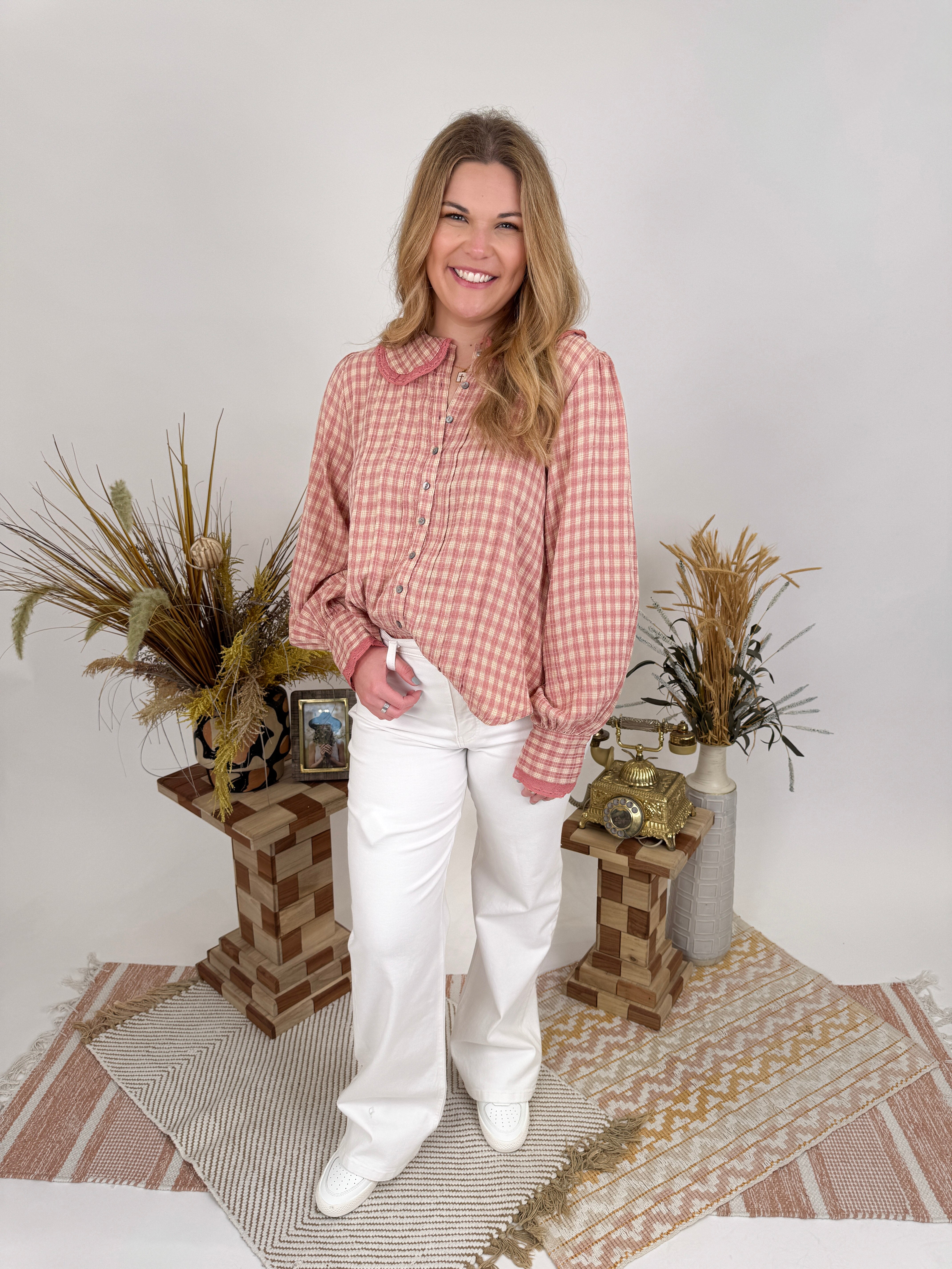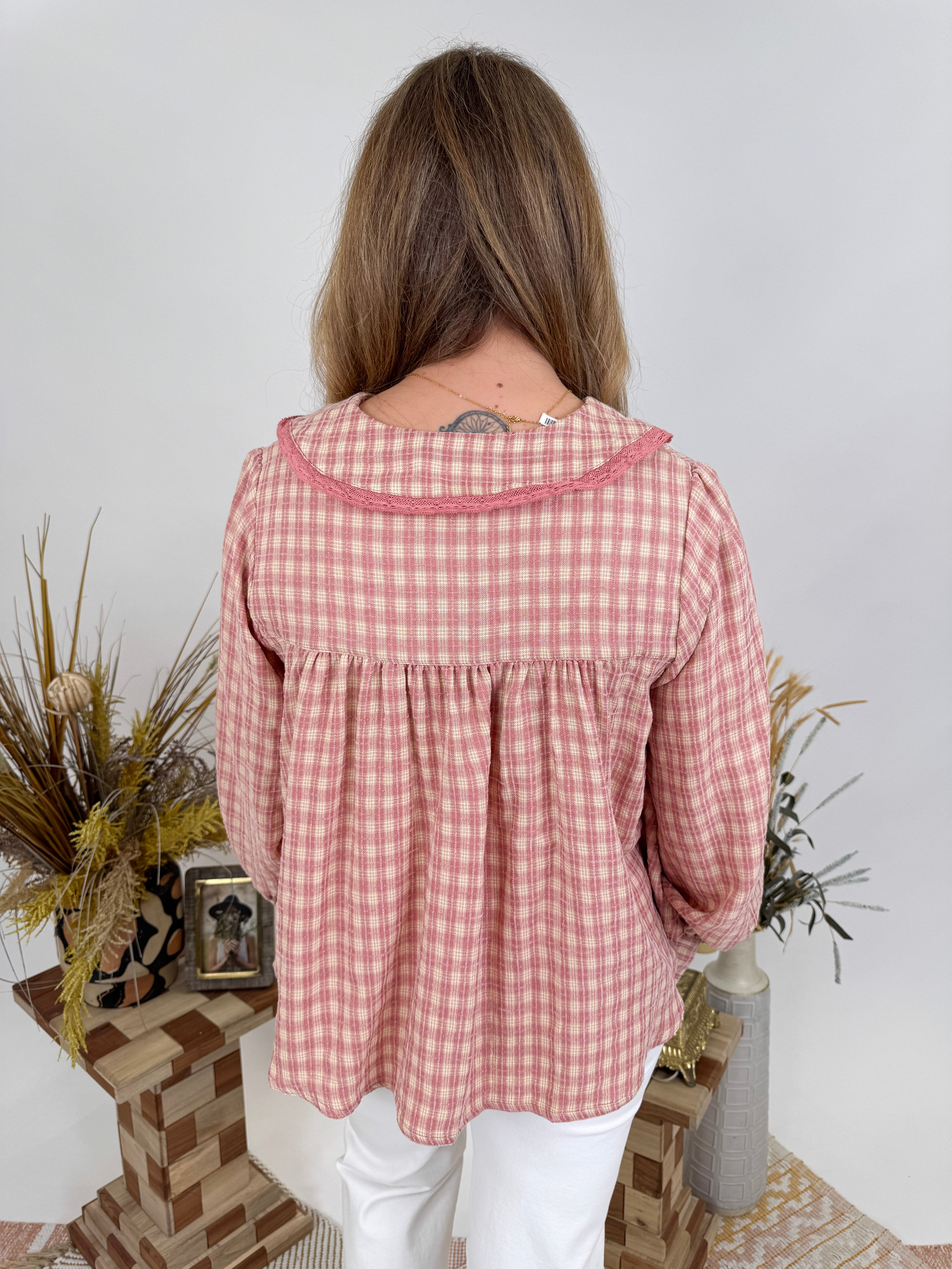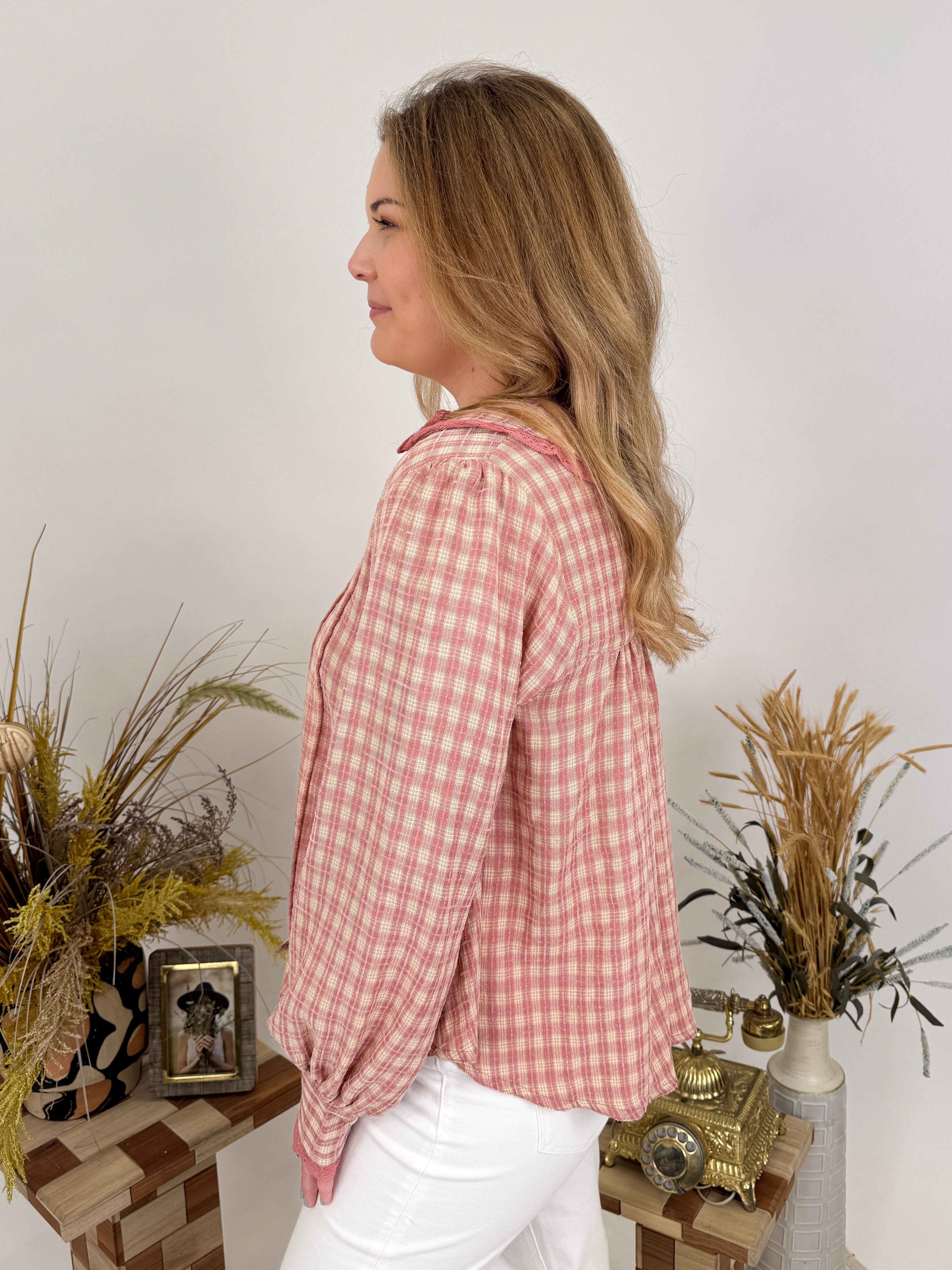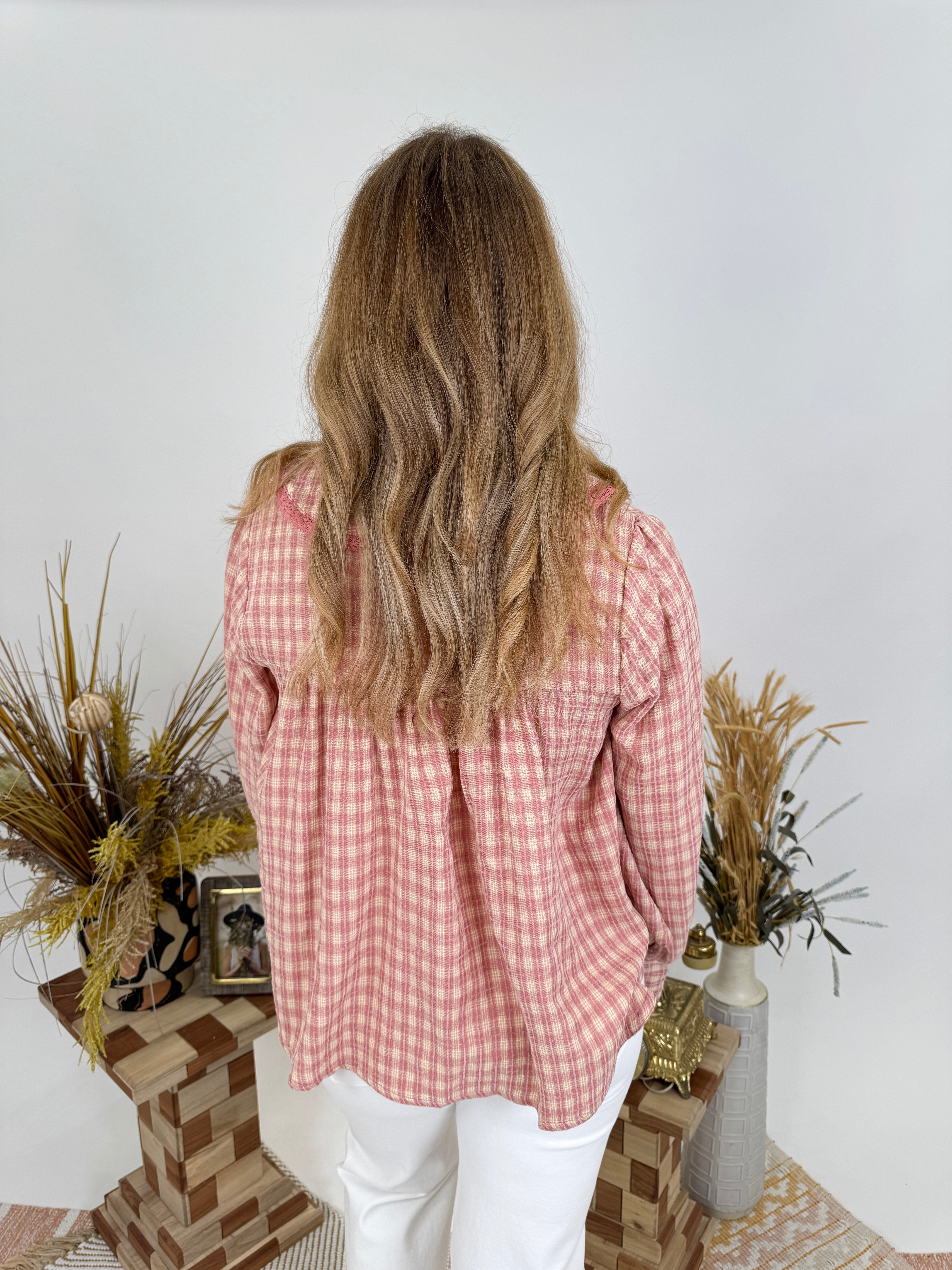 Give it all you've got in the sweetest plaid blouse. Soft rose plaid, romantic puff sleeves, and vintage-inspired details β the All You Got Blouse brings cottage-core charm to your everyday style.