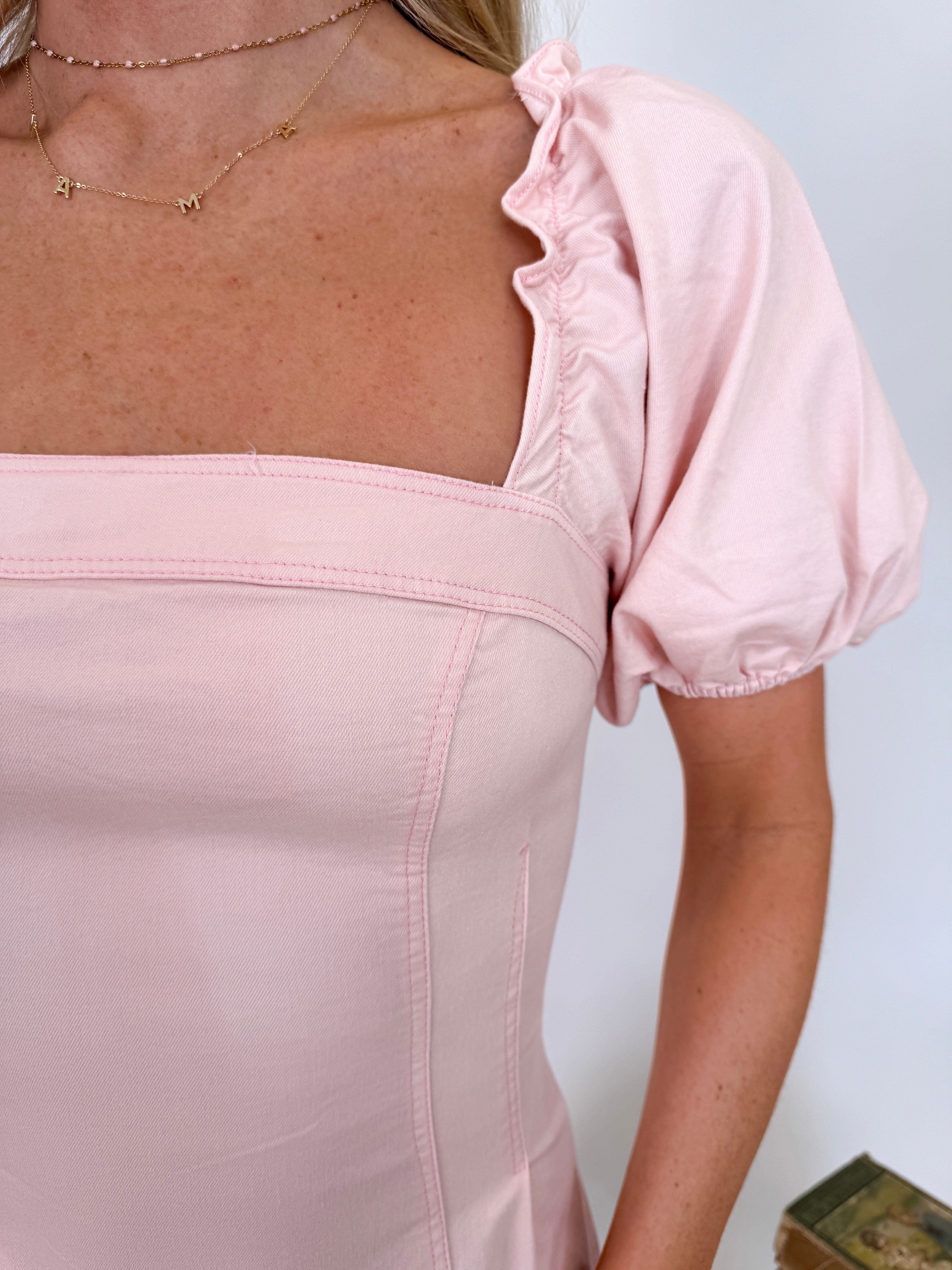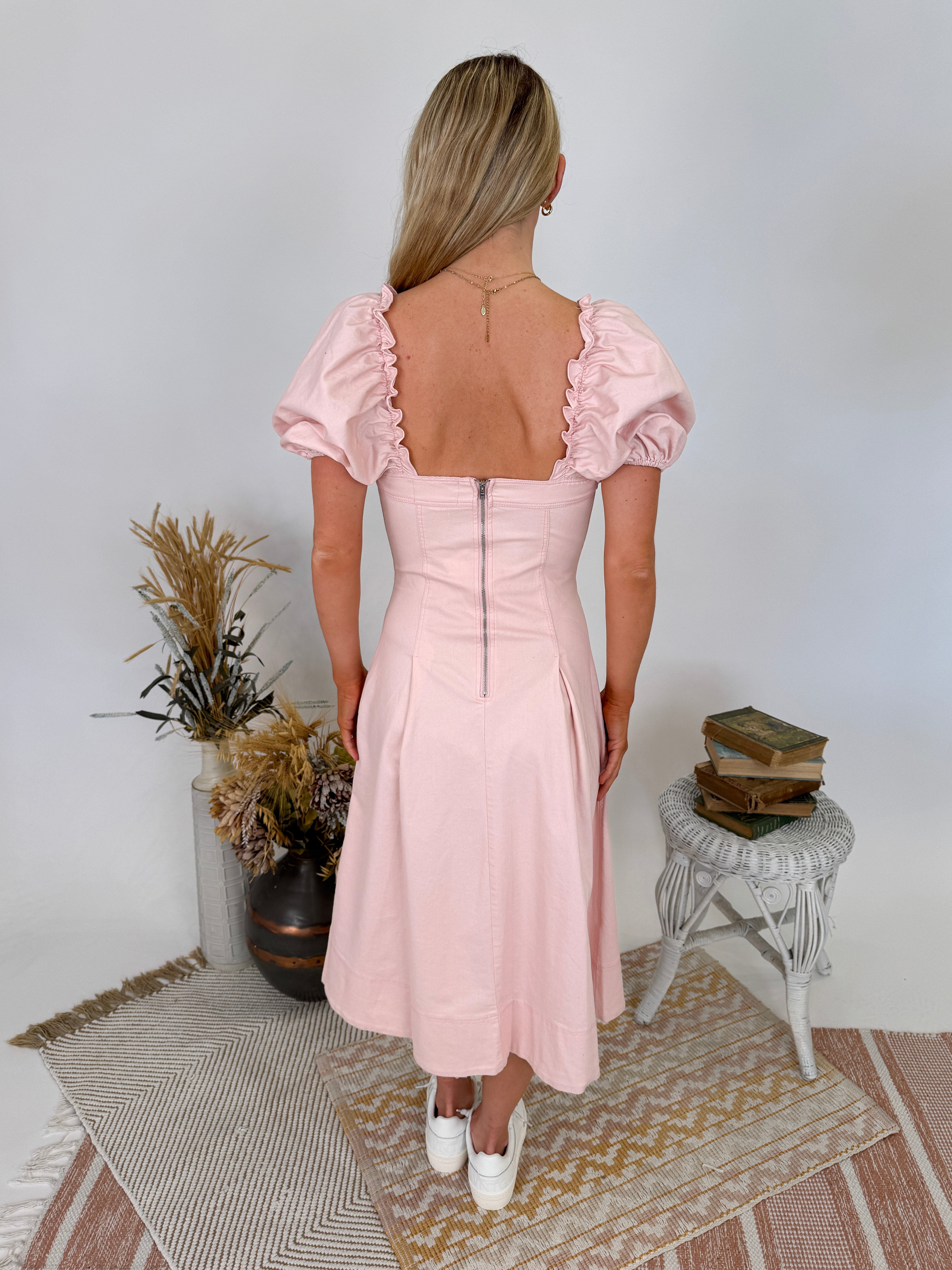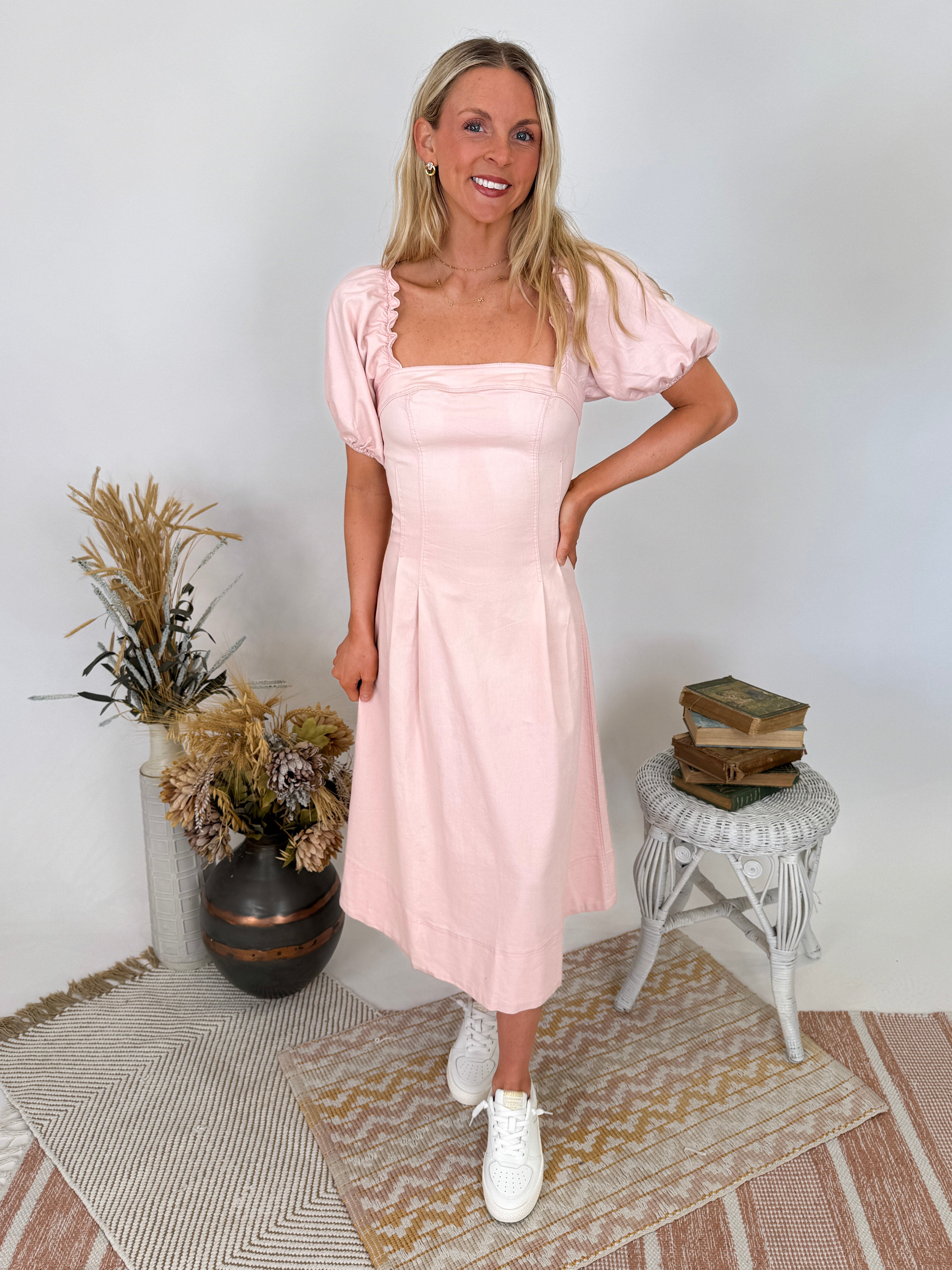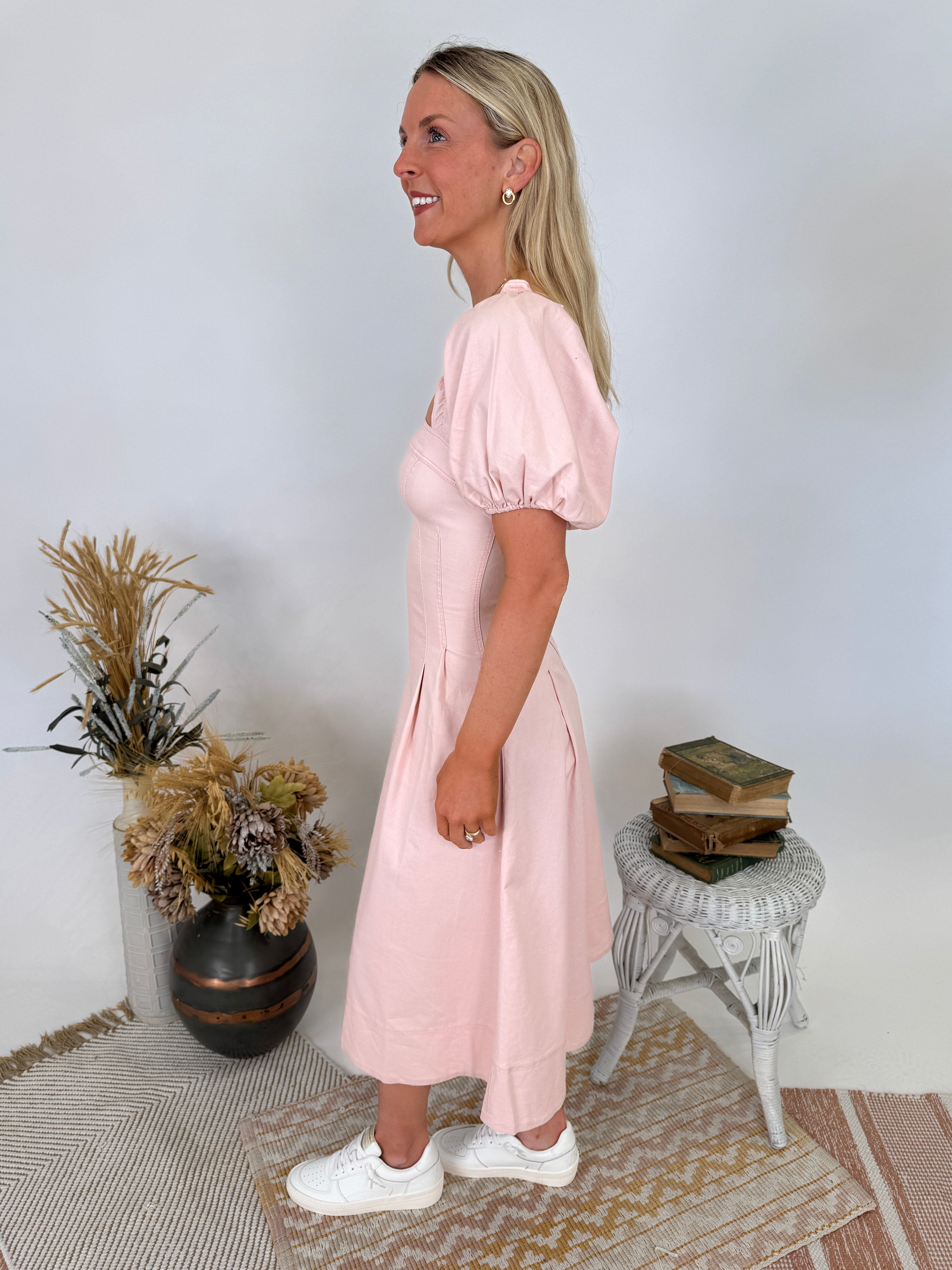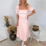 Step into effortless elegance with the Bella Midi Dress. This stunning blush pink dress features romantic puff sleeves, a flattering square neckline, and a feminine midi length that's perfect for any special occasion. The structured bodice and flowy skirt create a timeless silhouette that makes you feel beautiful from the moment you slip it on.