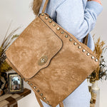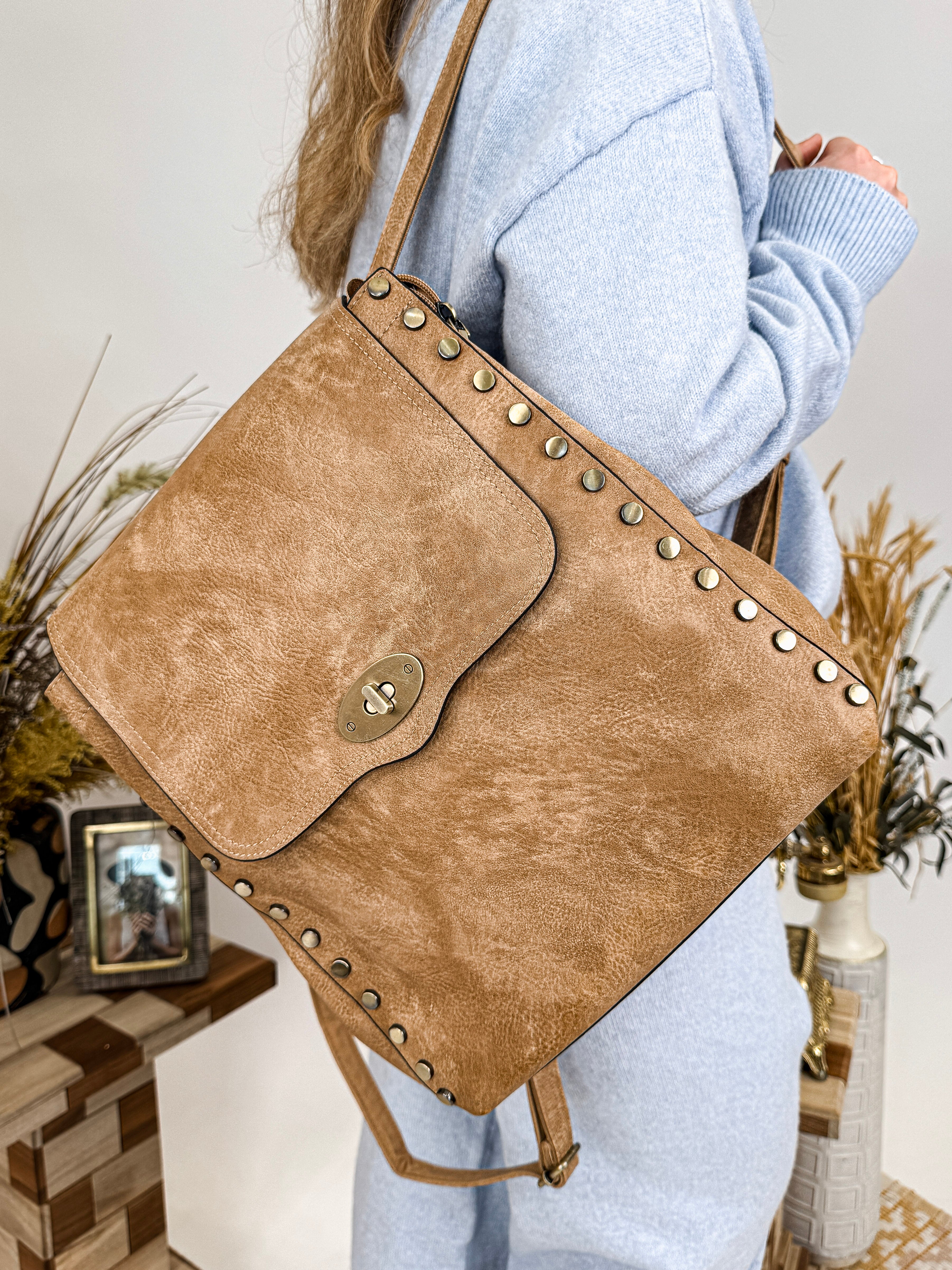Features: Twist-lock closure, stud details, convertible straps, inside divider, inside pockets