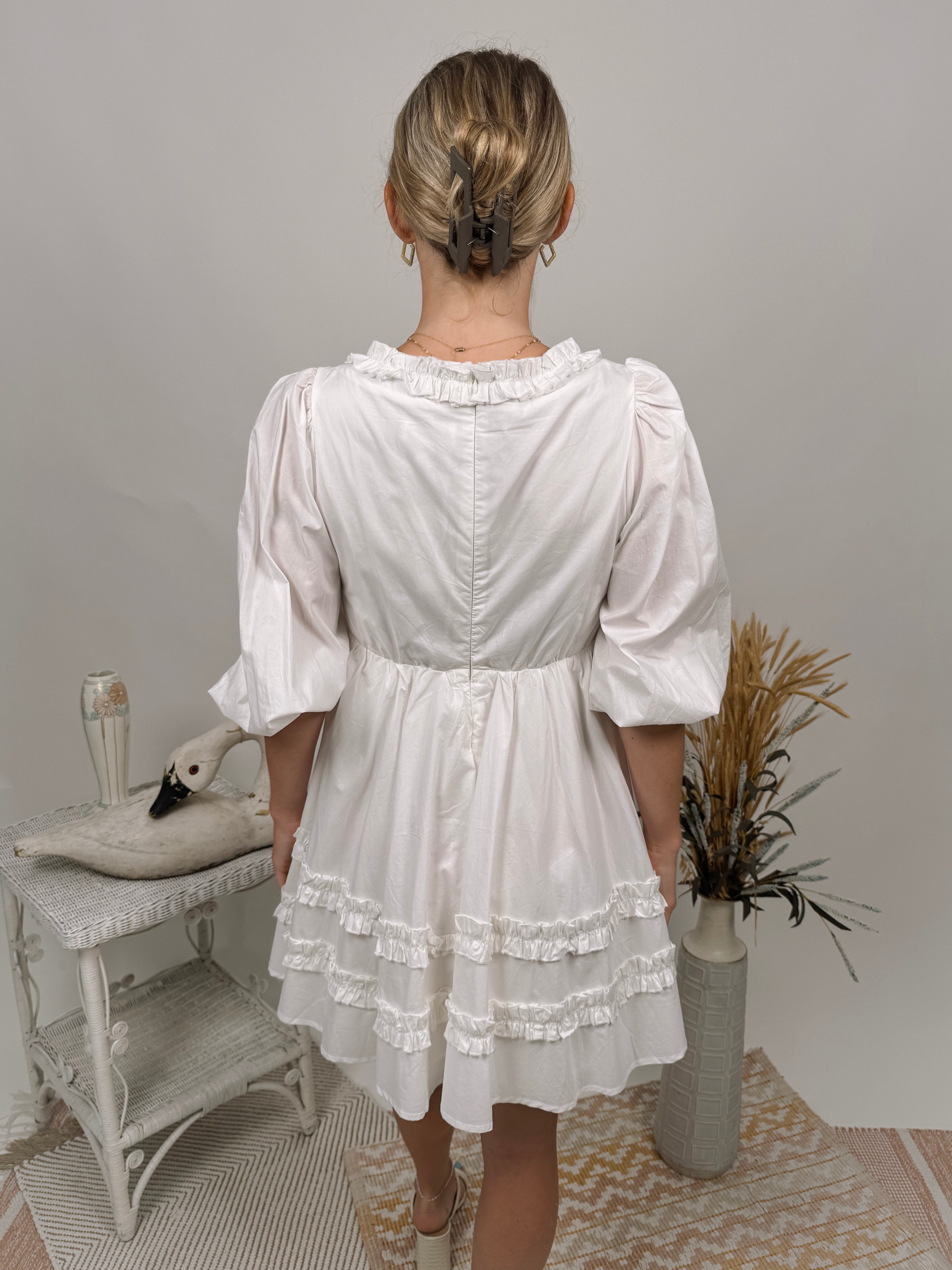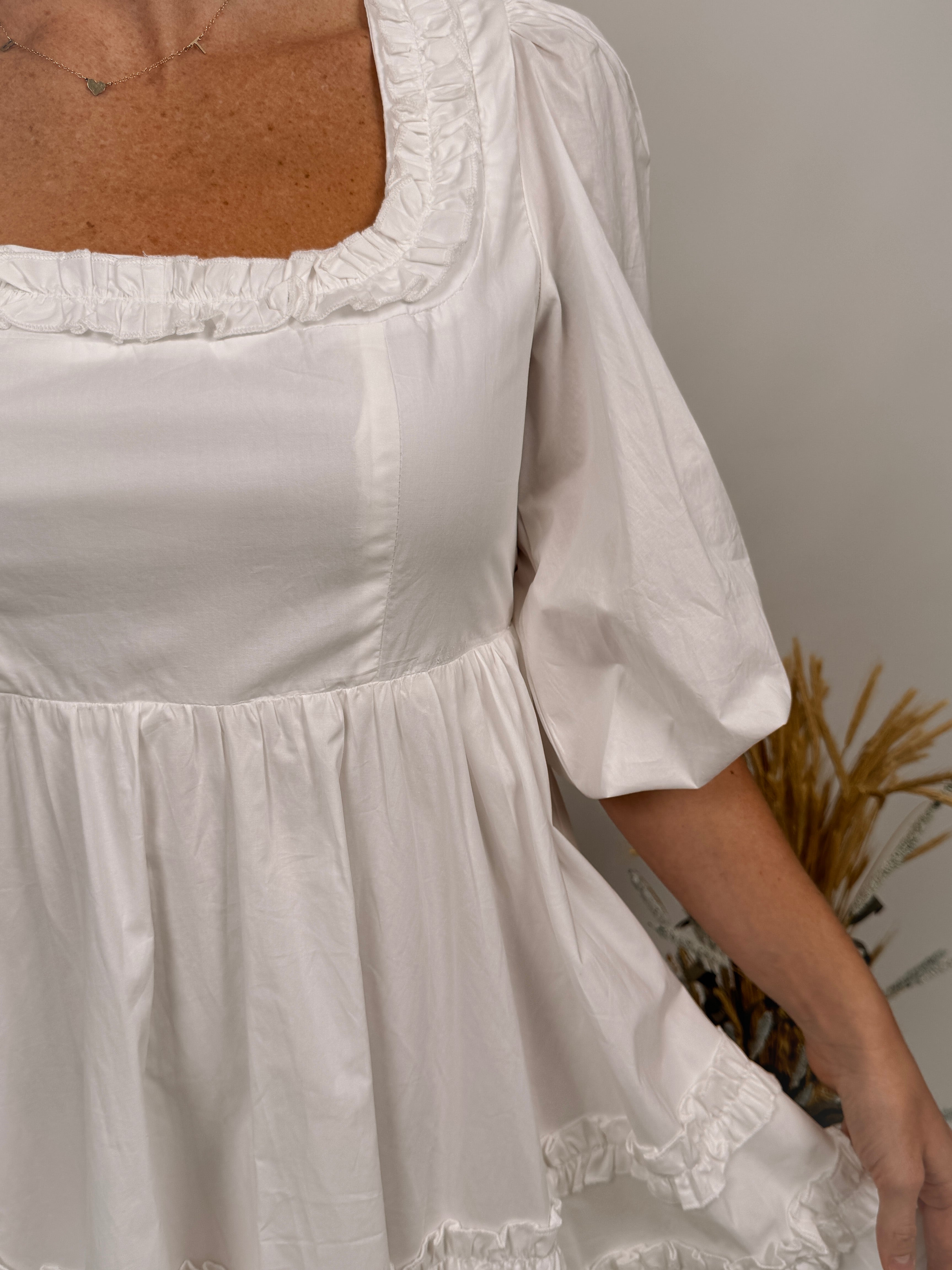The Chelsea Dress is perfect for those special pre-wedding moments! It offers a sweet square neckline, intentional ruffle detail moments, 3/4 sleeve, and is lined. Macie has paired a neutral heel to elevate the look. We just know you'll be stunning in it!