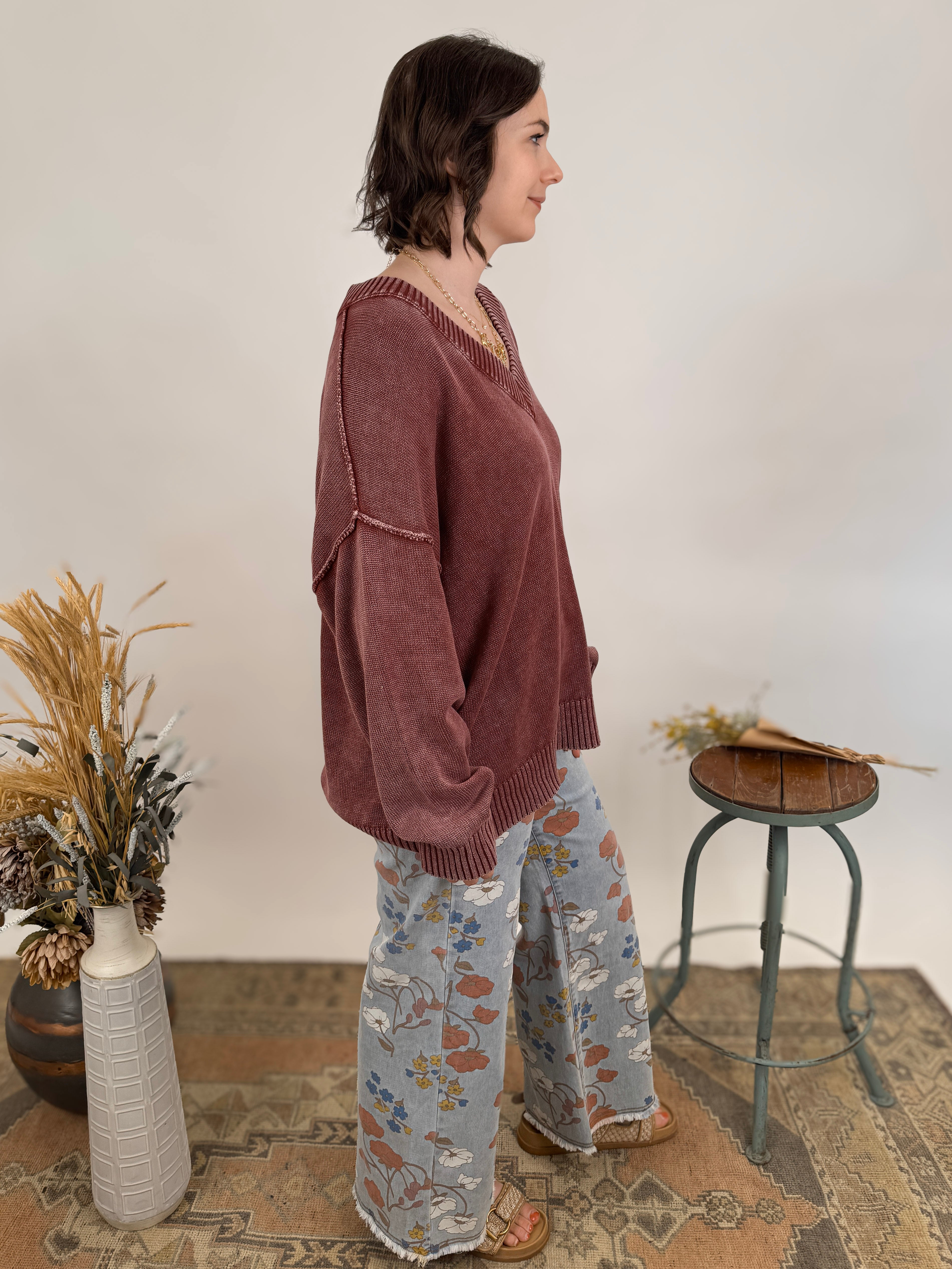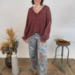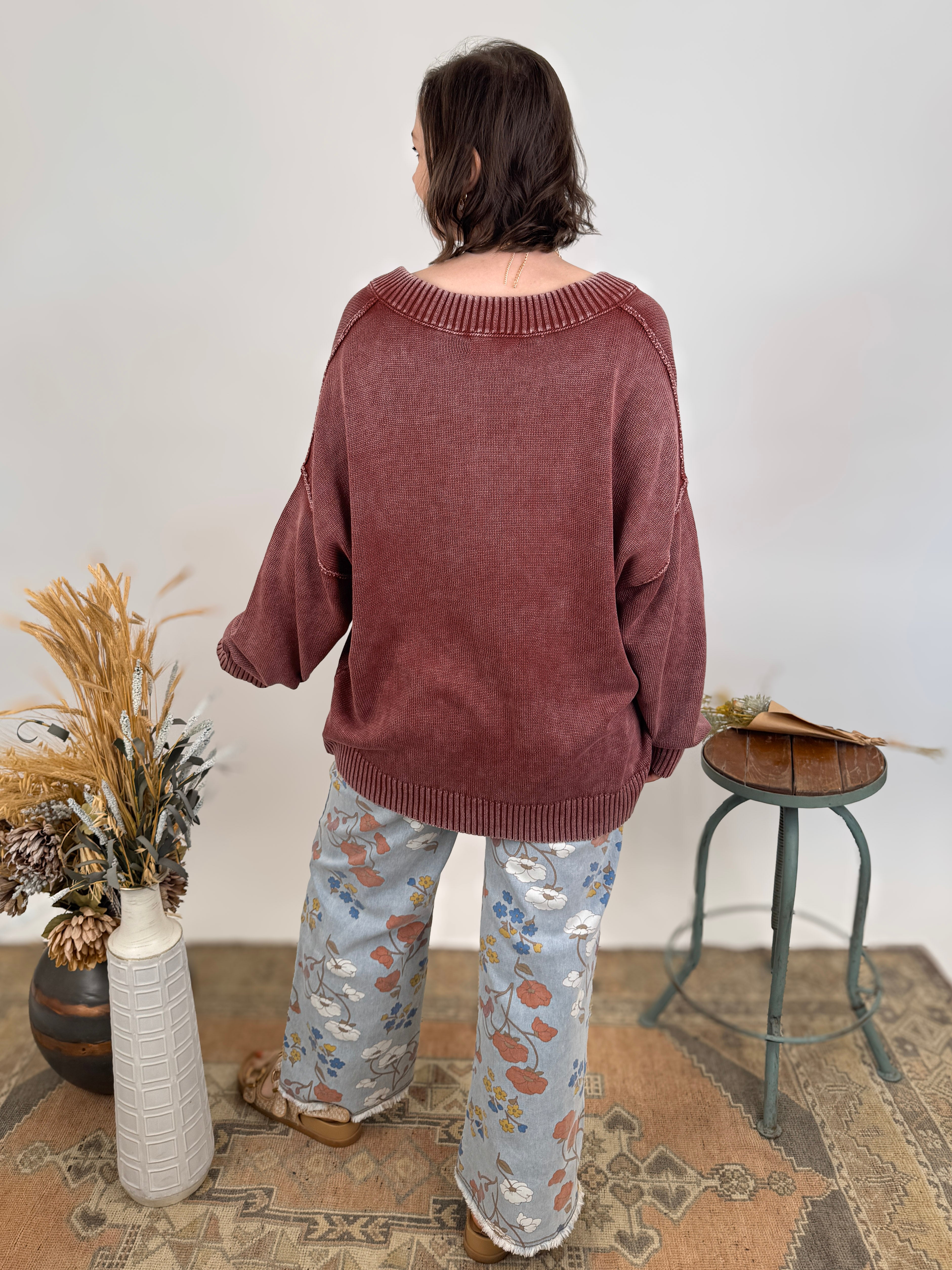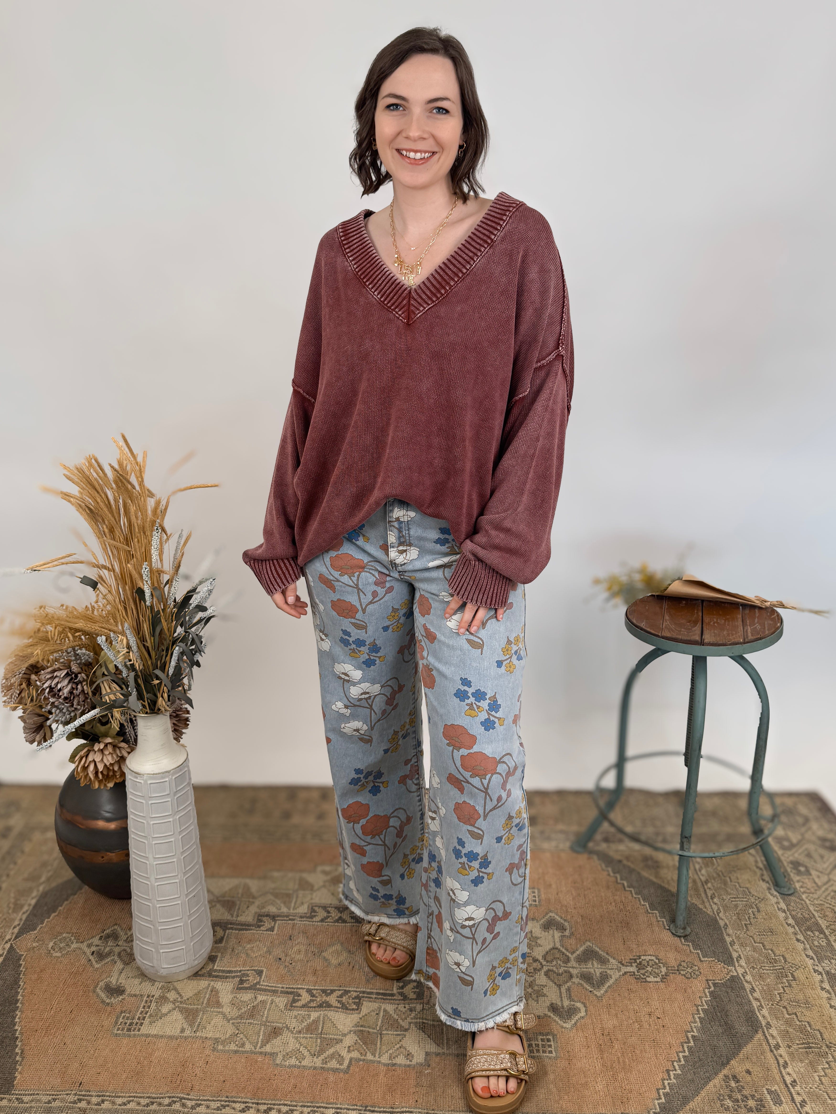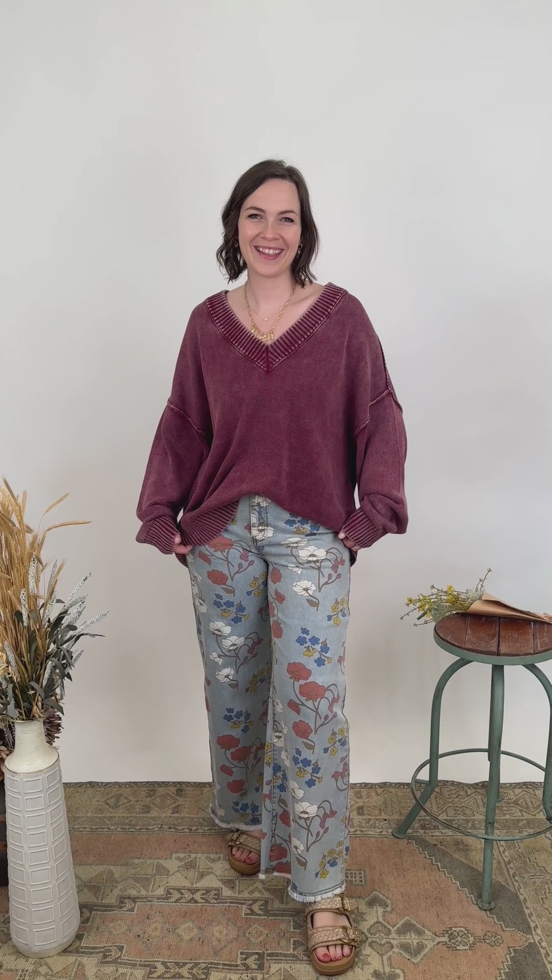 This is soft comfy oversized sweater is just what you need for Fall! We love the mineral washed fabric, v-neckline, and rich colors. We've styled this sweater with a fun floral pant, but think this would be perfect for a casual look with leggings.