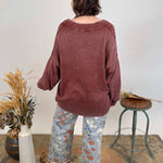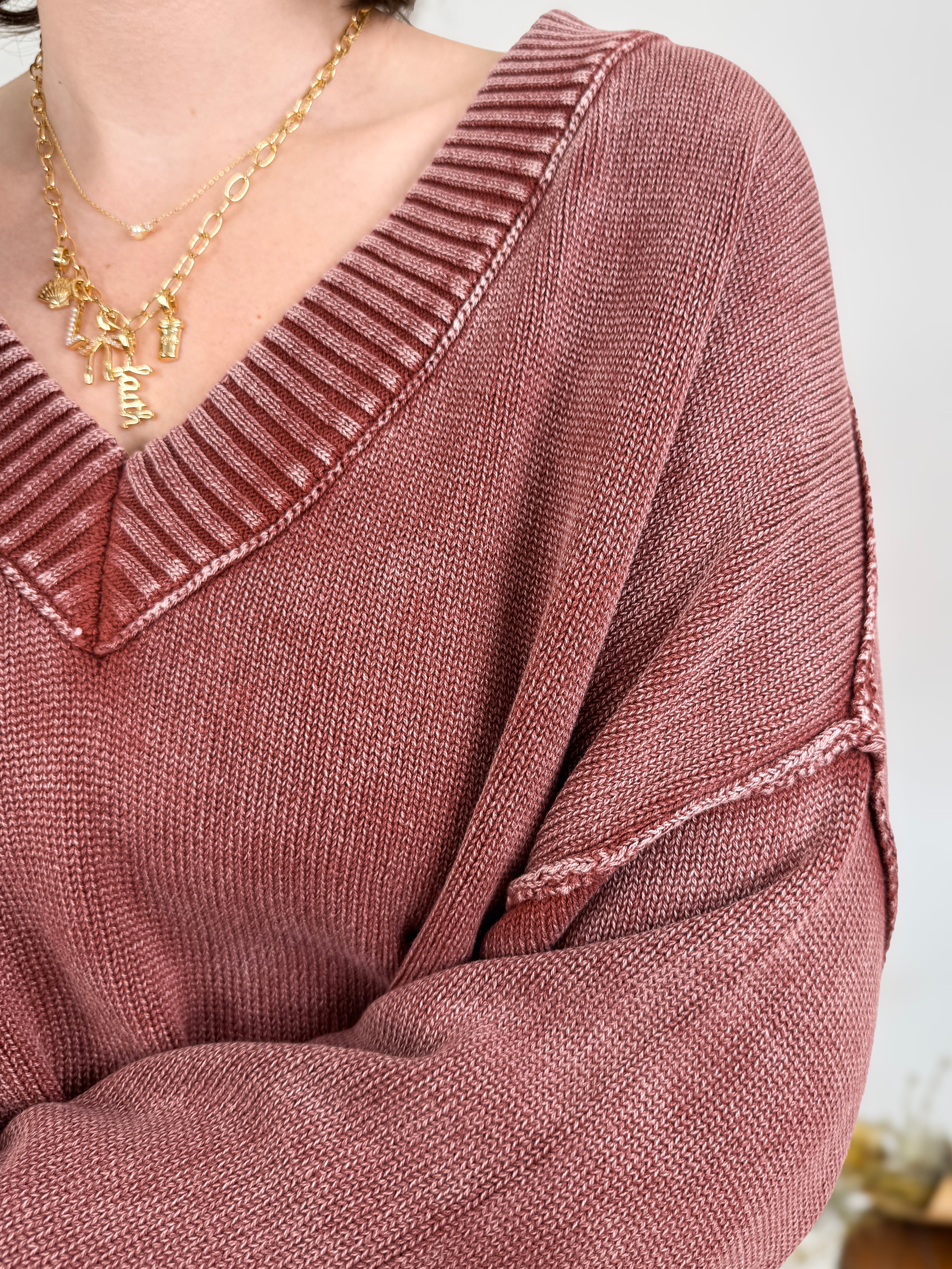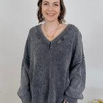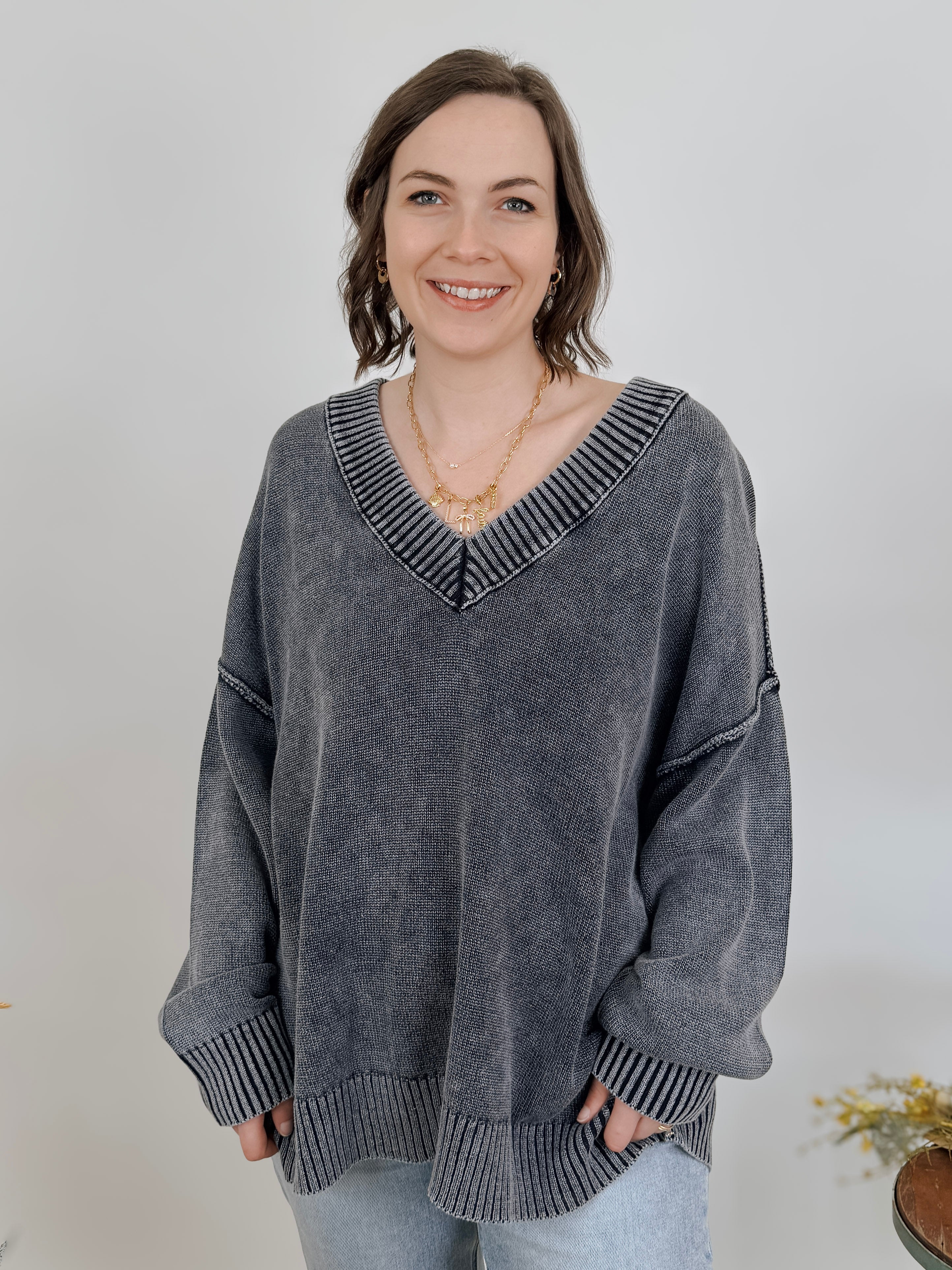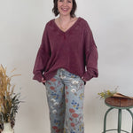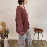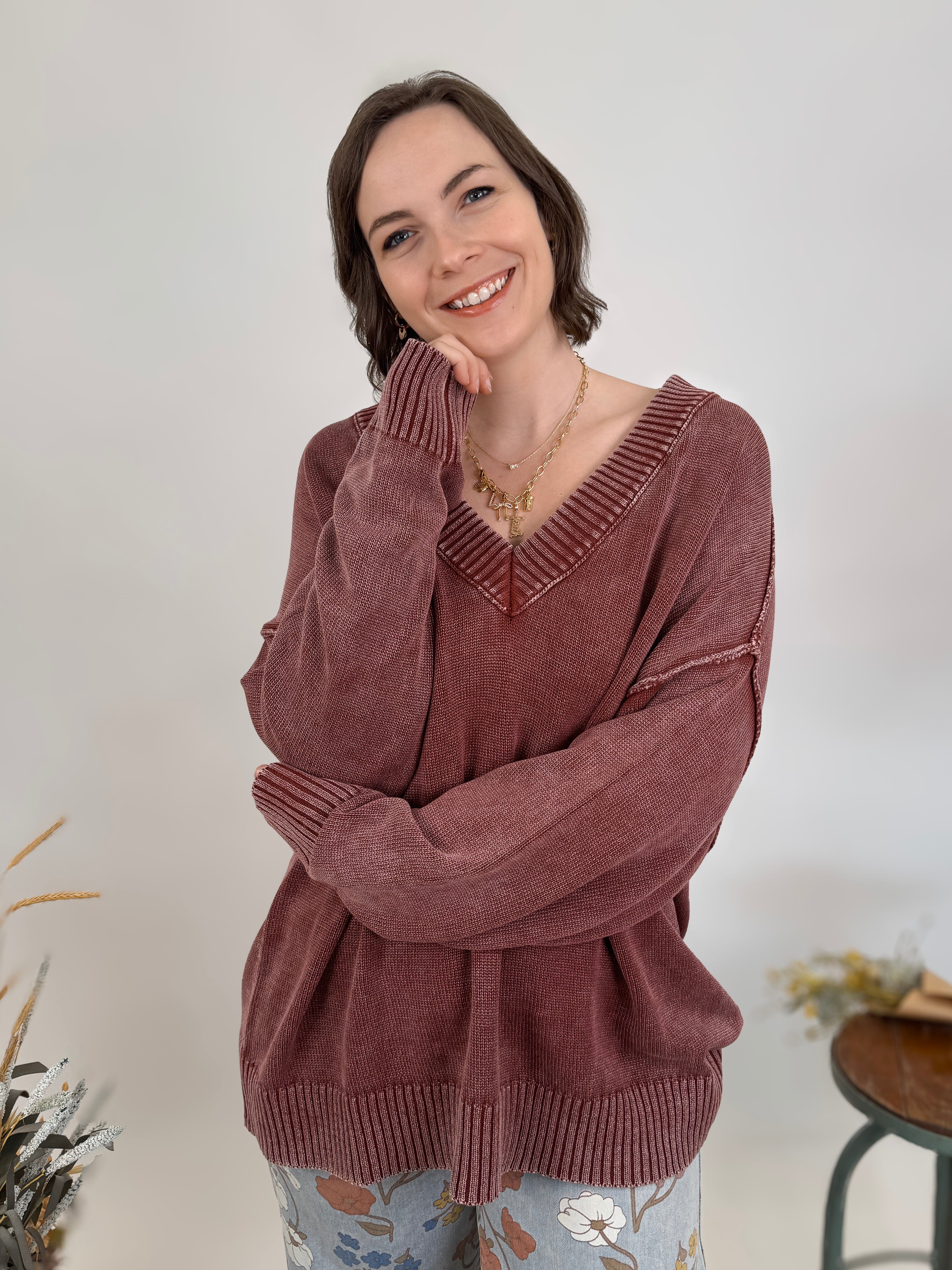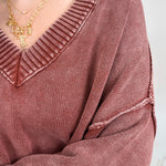 This is soft comfy oversized sweater is just what you need for Fall! We love the mineral washed fabric, v-neckline, and rich colors. We've styled this sweater with a fun floral pant, but think this would be perfect for a casual look with leggings.