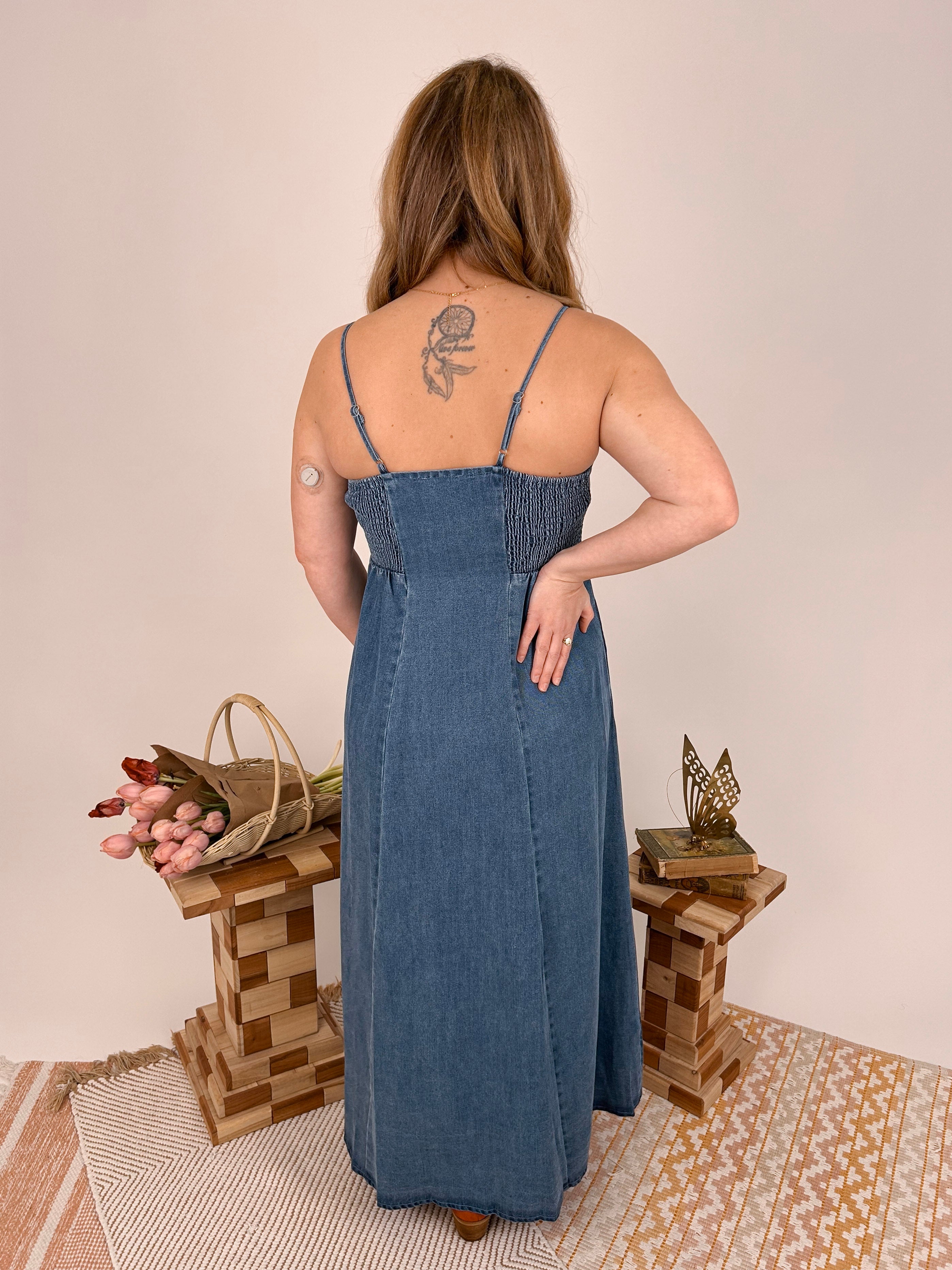Denim dreams. Medium wash chambray with button-front styling, adjustable straps, and flowing maxi silhouette—the Colsie Dress is effortless cool perfected.