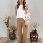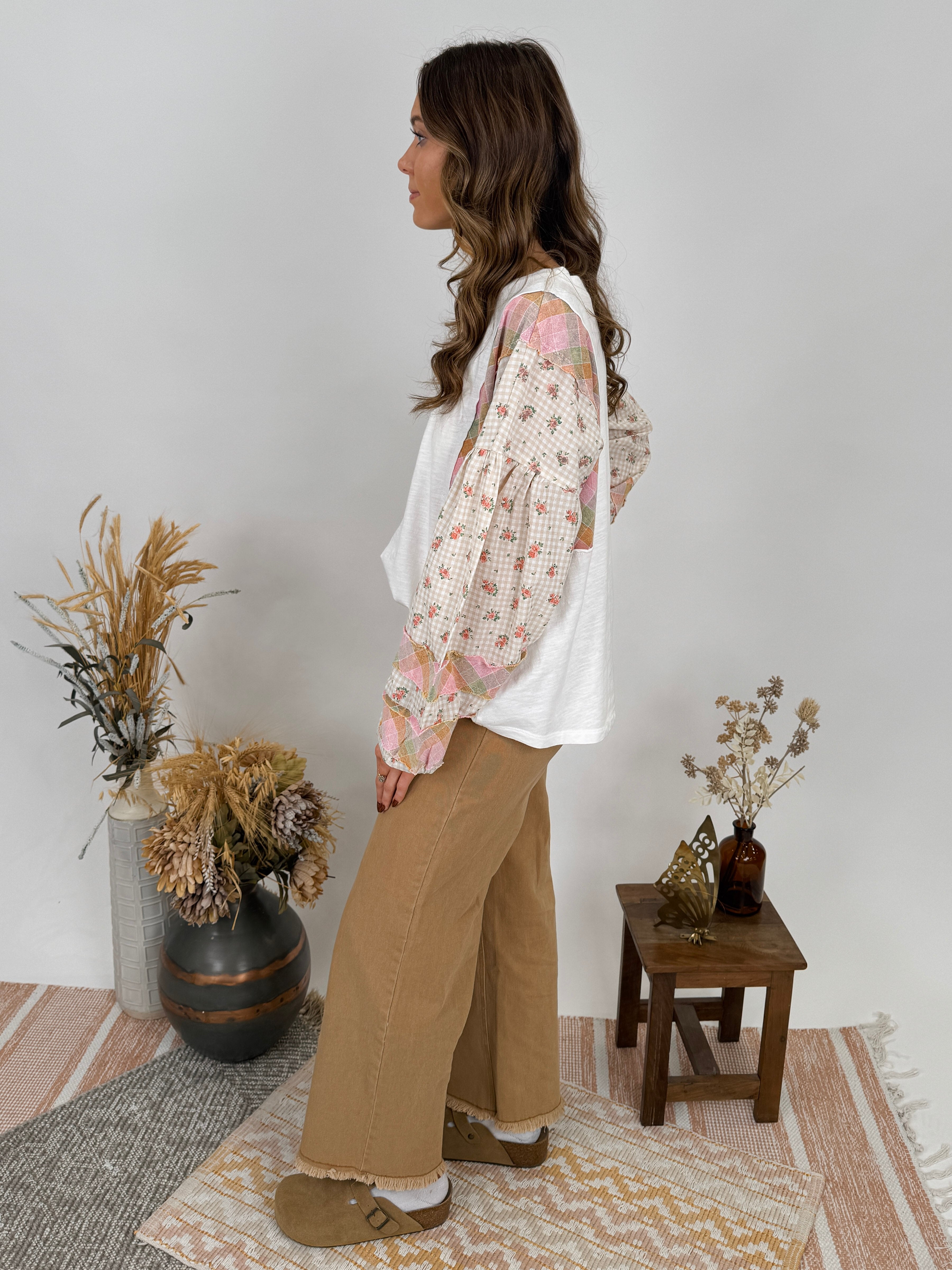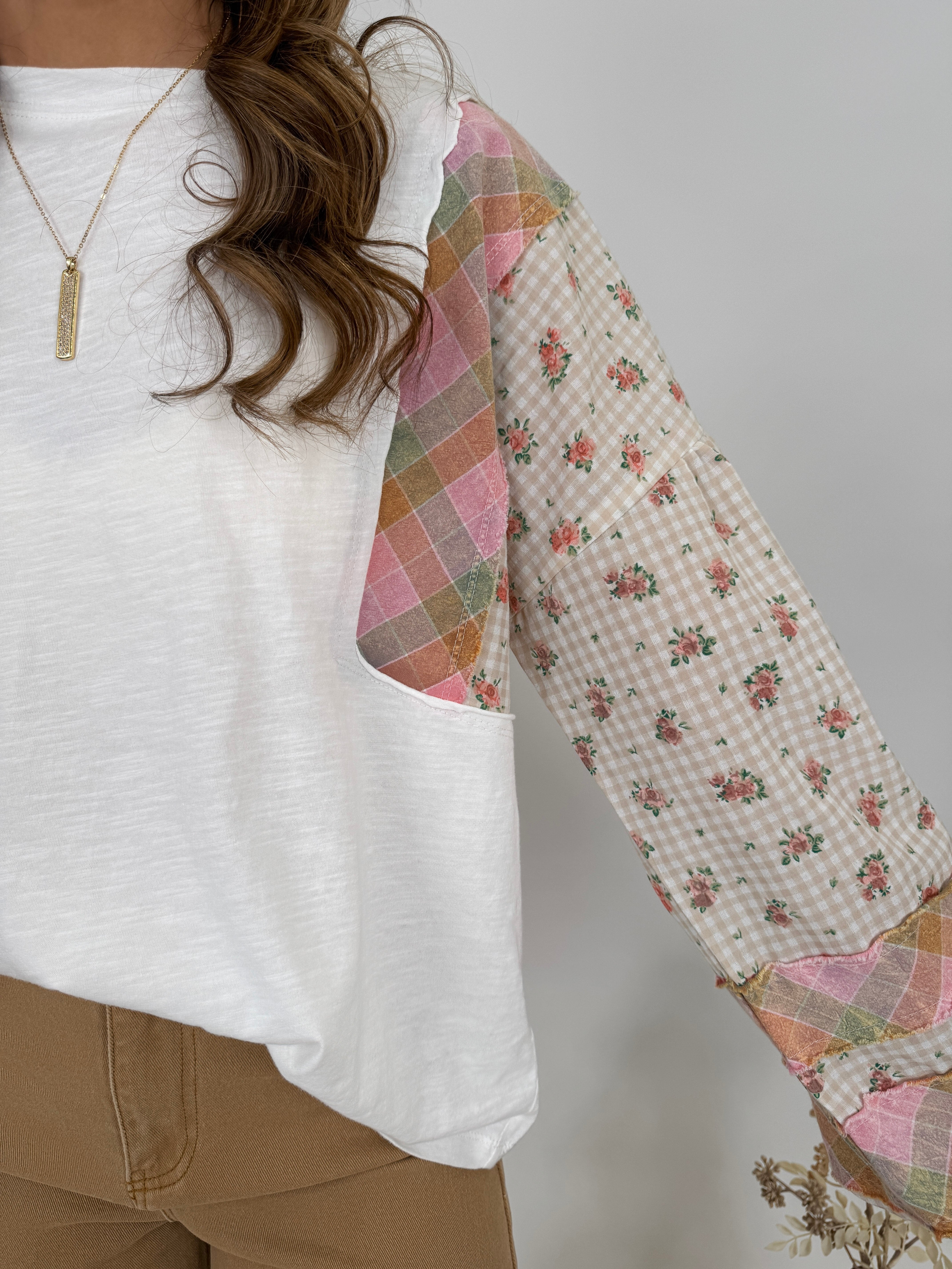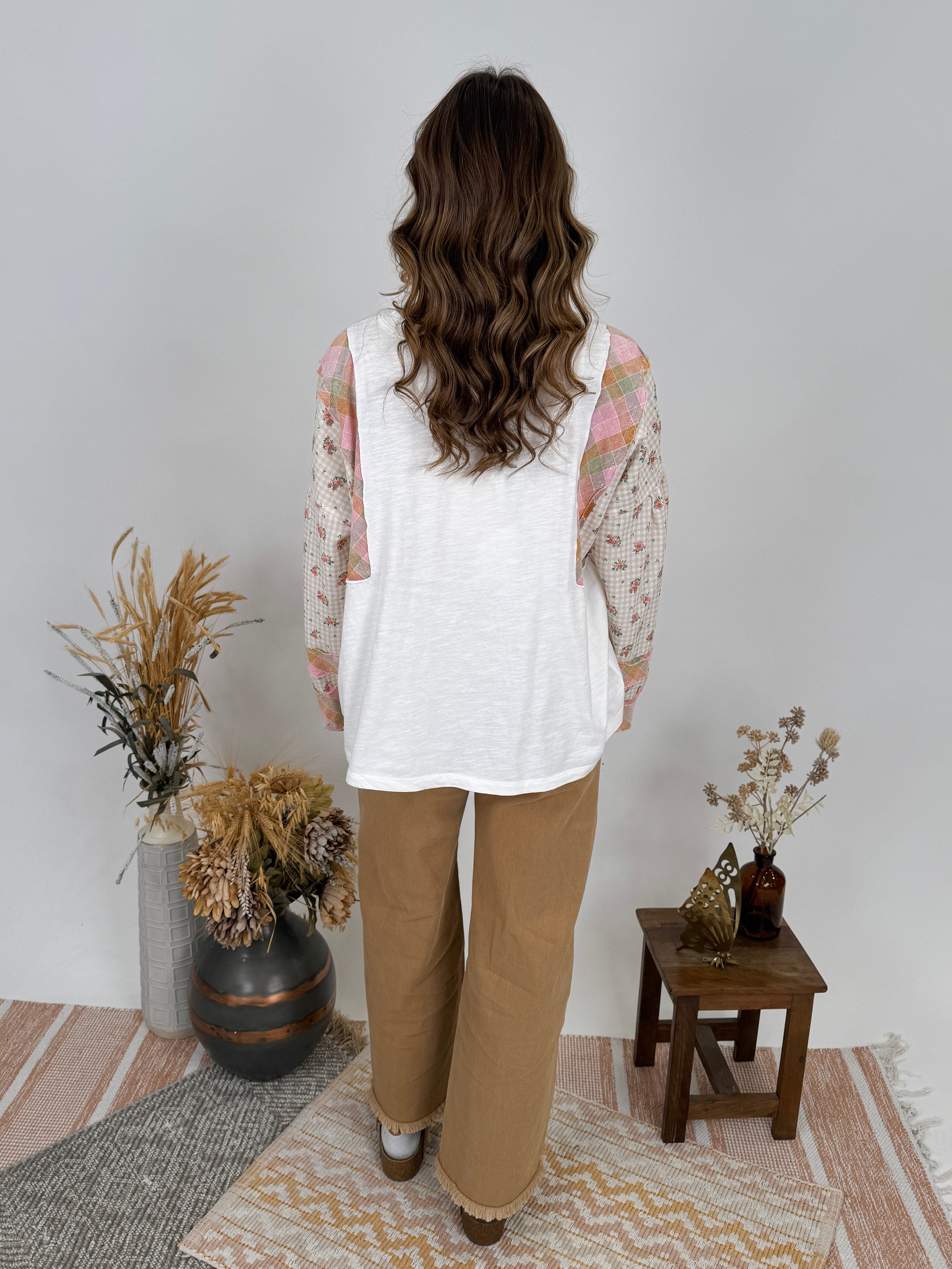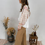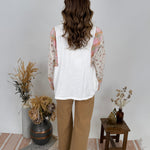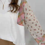 Styling Tips: Pair with high-waisted denim and ankle boots for a casual boho look, or tuck into a flowy midi skirt for feminine flair. The neutral white base and soft pastel sleeve details make this top incredibly versatile. Add simple jewelry to let the patchwork sleeves be the statement piece, or layer under a denim jacket for cooler days.