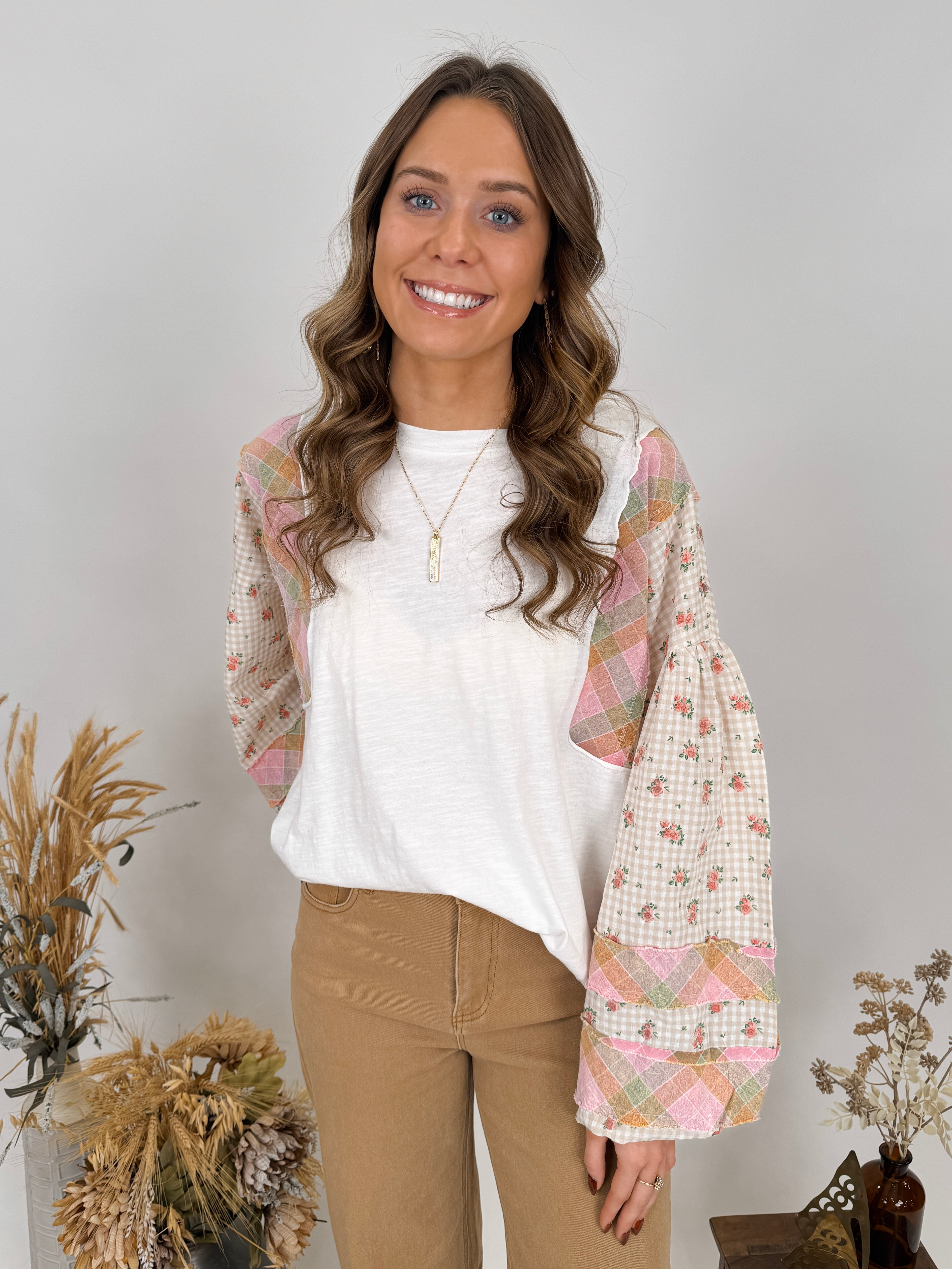 Embrace bohemian charm with the Emmie Patchwork Knit Top. This unique piece features a blend of vintage-inspired patterns including floral gingham sleeves, diamond patchwork details, and a soft white knit body. The statement balloon sleeves add a romantic touch that makes this top truly one-of-a-kind.