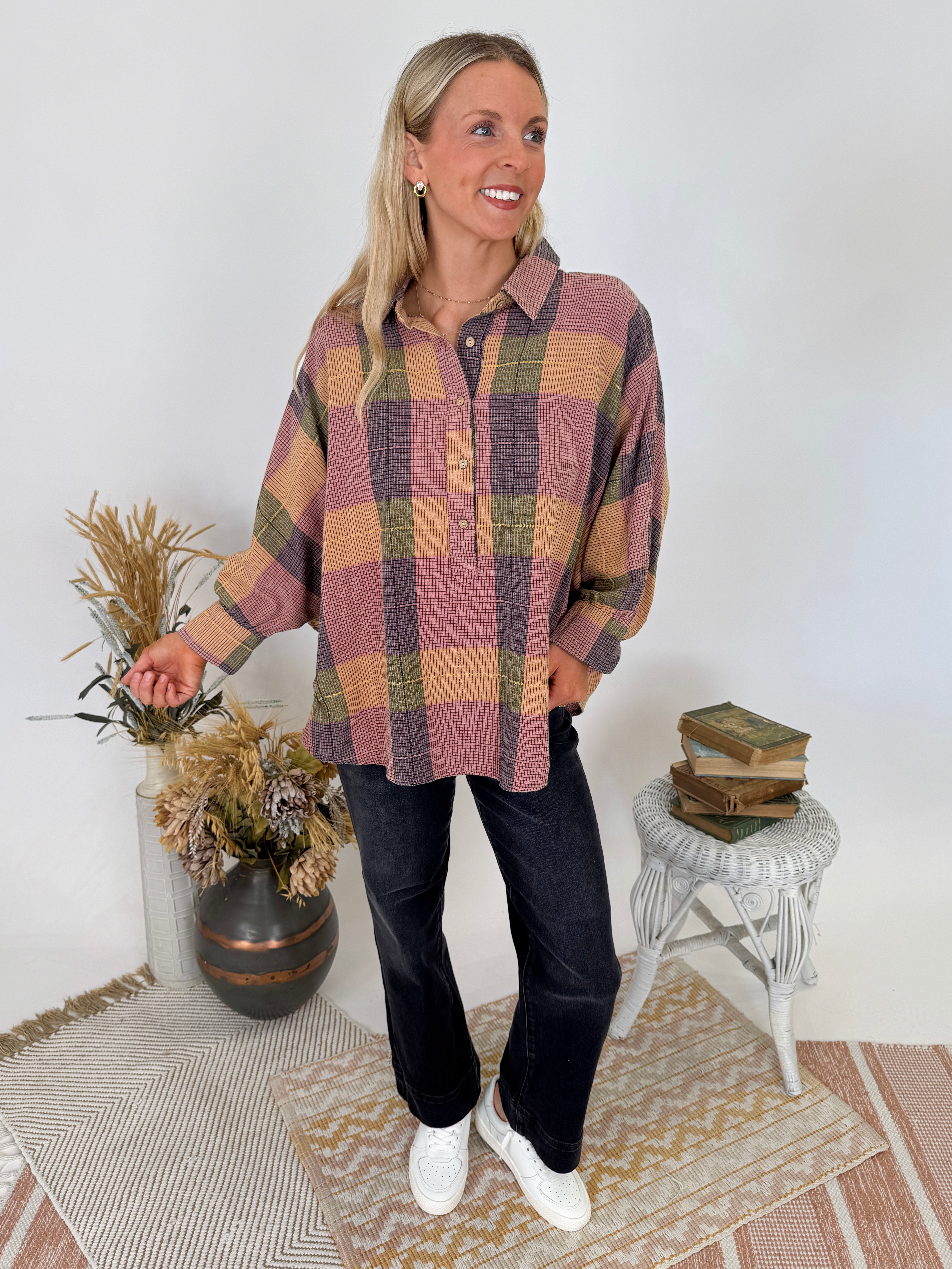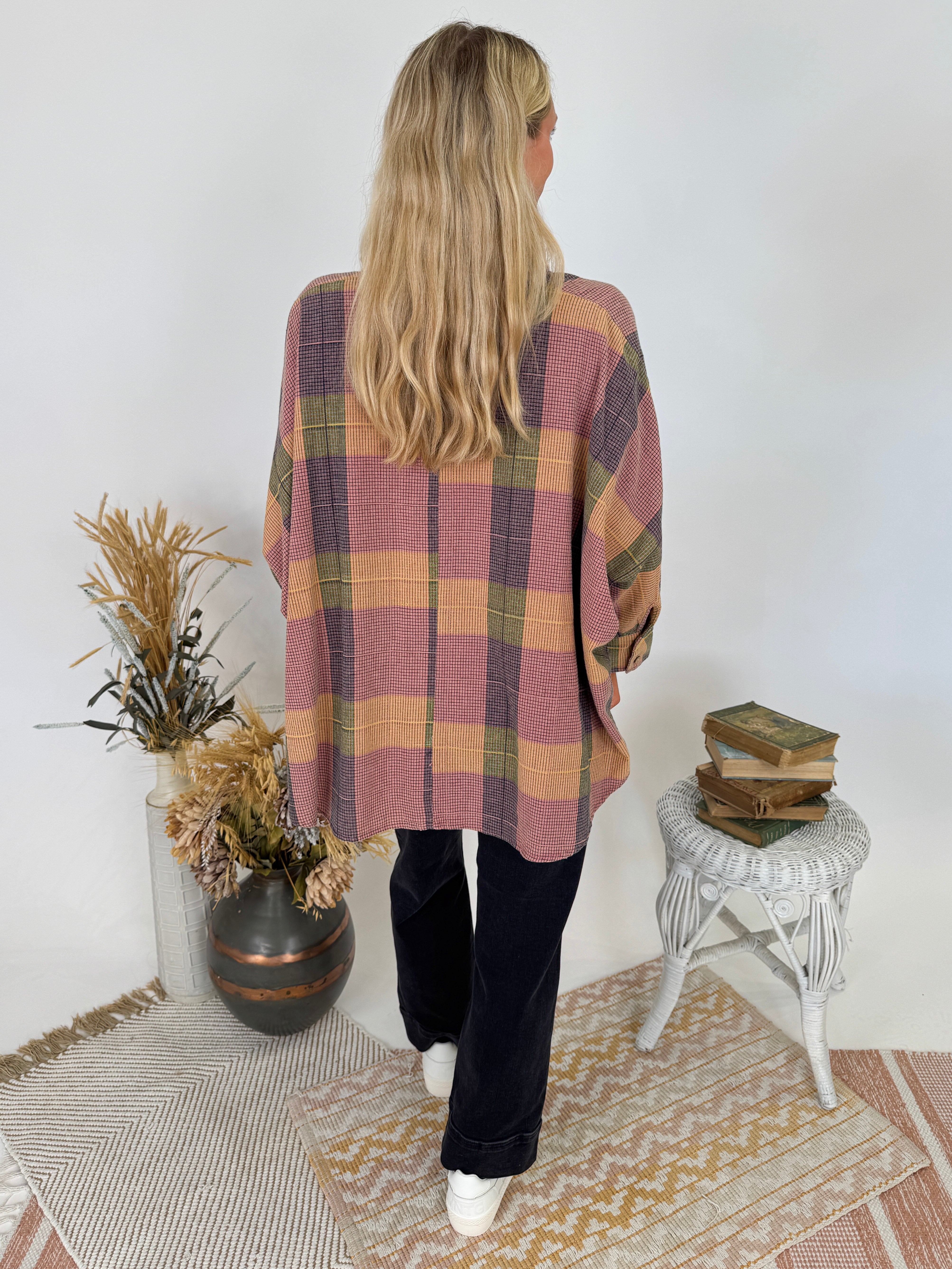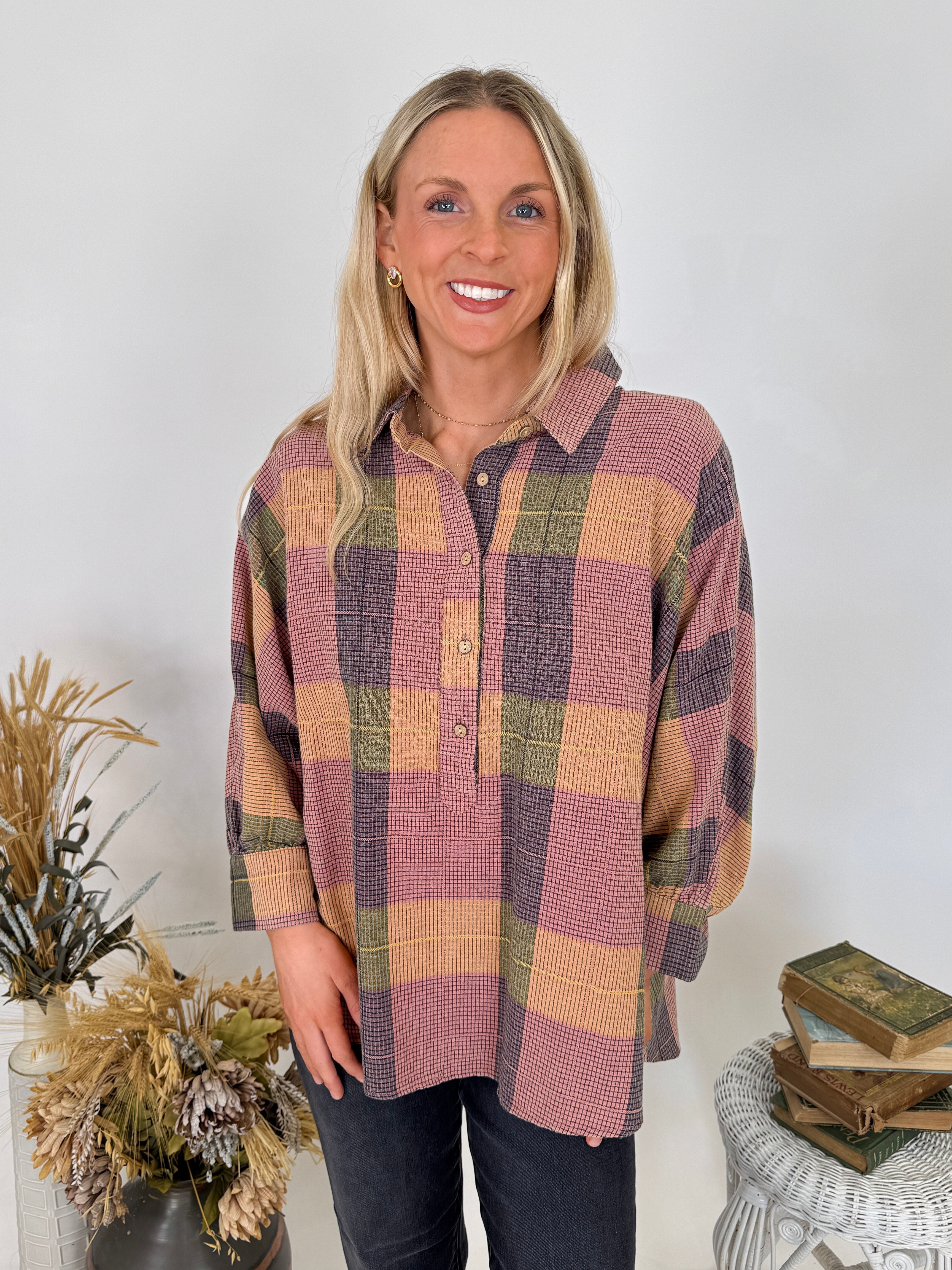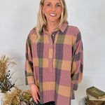 Add a touch of vintage charm to your wardrobe with the Just Saying Plaid Button Up Top. This oversized button-down features a beautiful multi-toned plaid pattern in warm autumn hues. The relaxed silhouette and soft cotton blend make it perfect for layering or wearing solo – it's the kind of piece that makes getting dressed feel effortless.