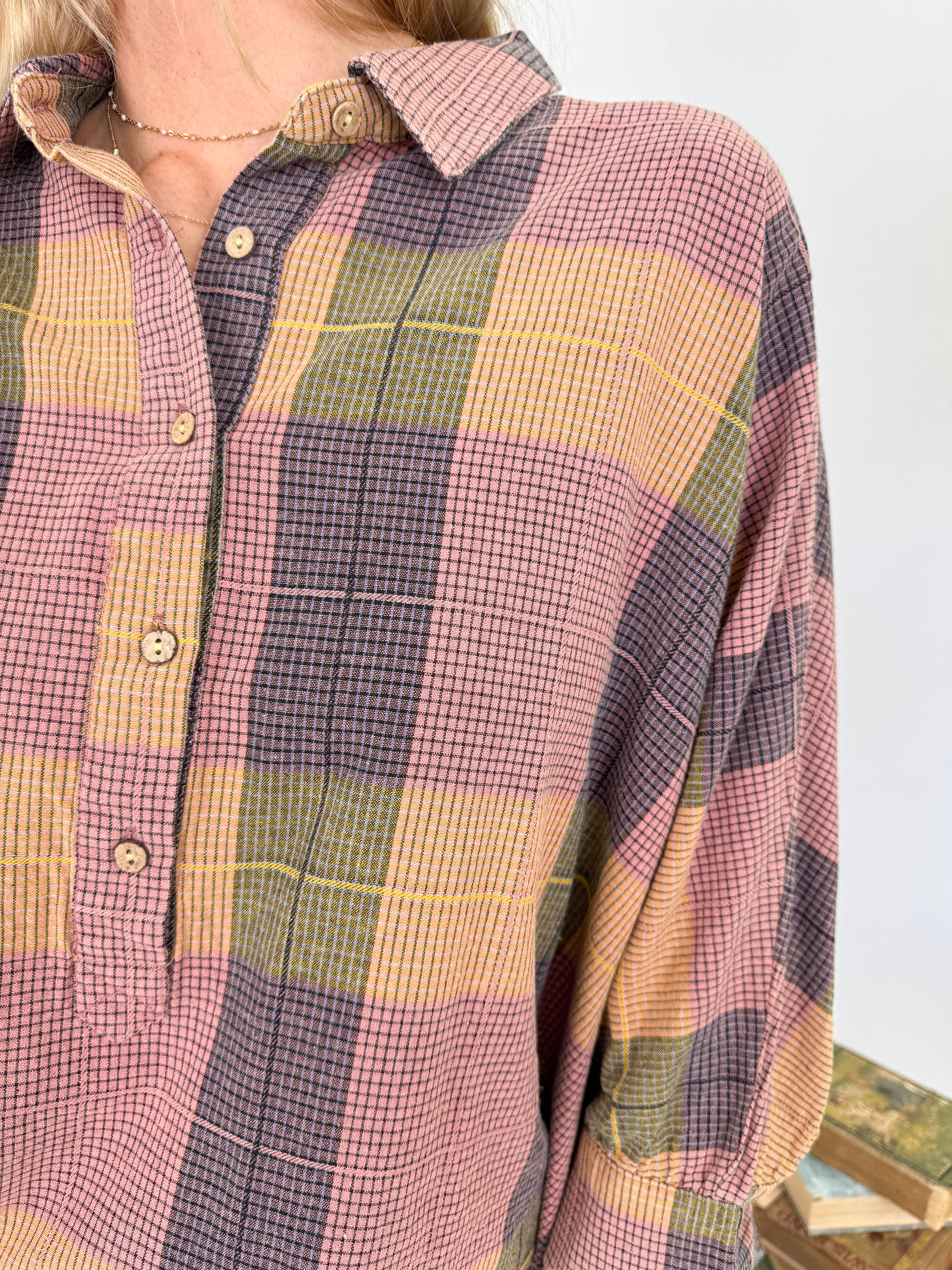 Styling Tips: Wear it open over a graphic tee and your favorite jeans for classic casual vibes. Tuck the front into high-waisted pants with the back out for a relaxed, flattering look. Layer over a turtleneck when temperatures drop, or tie it around your waist for an effortlessly cool detail. The multi-toned plaid makes it incredibly easy to style with neutrals or pull out accent colors for a more coordinated look.