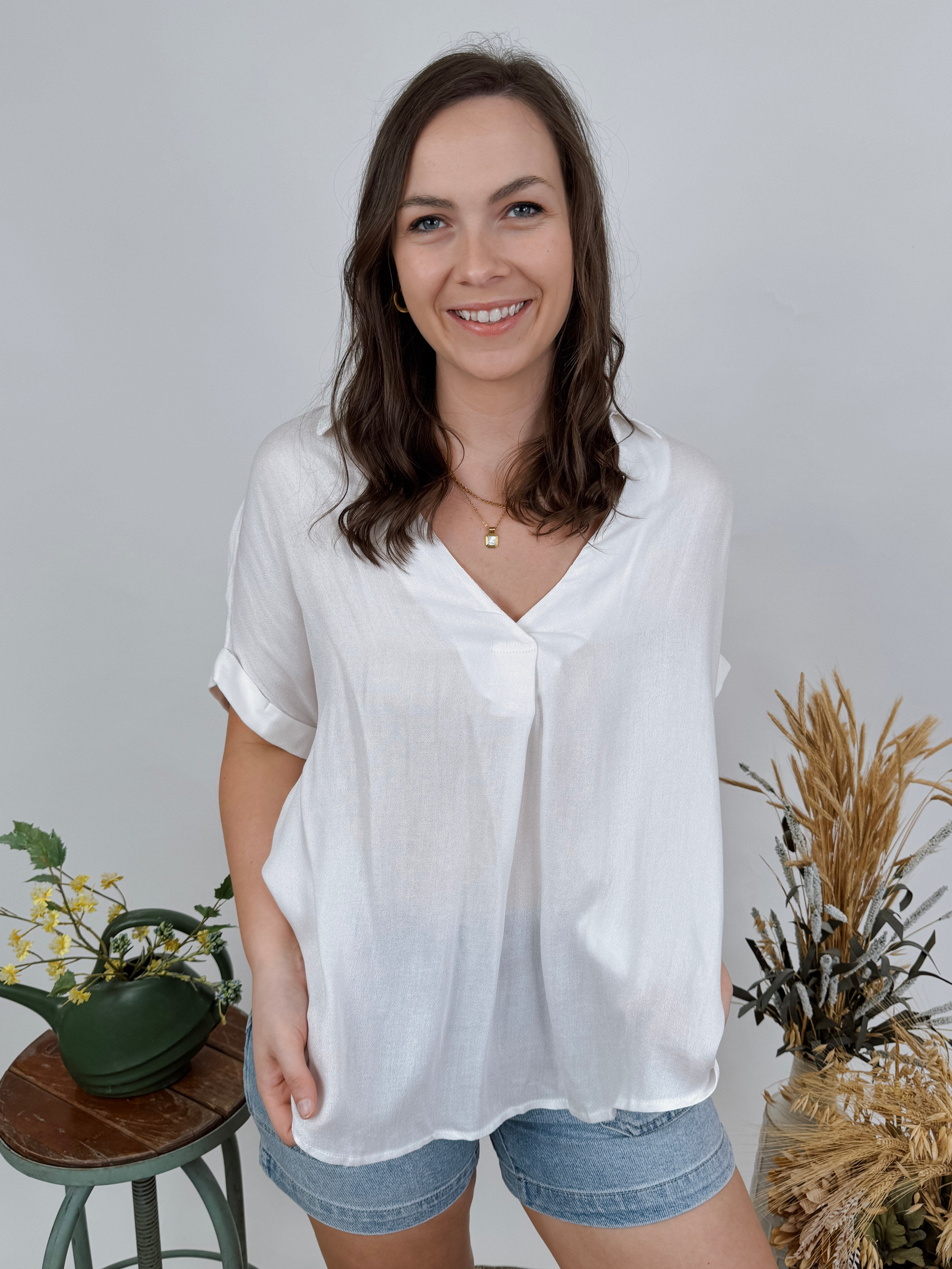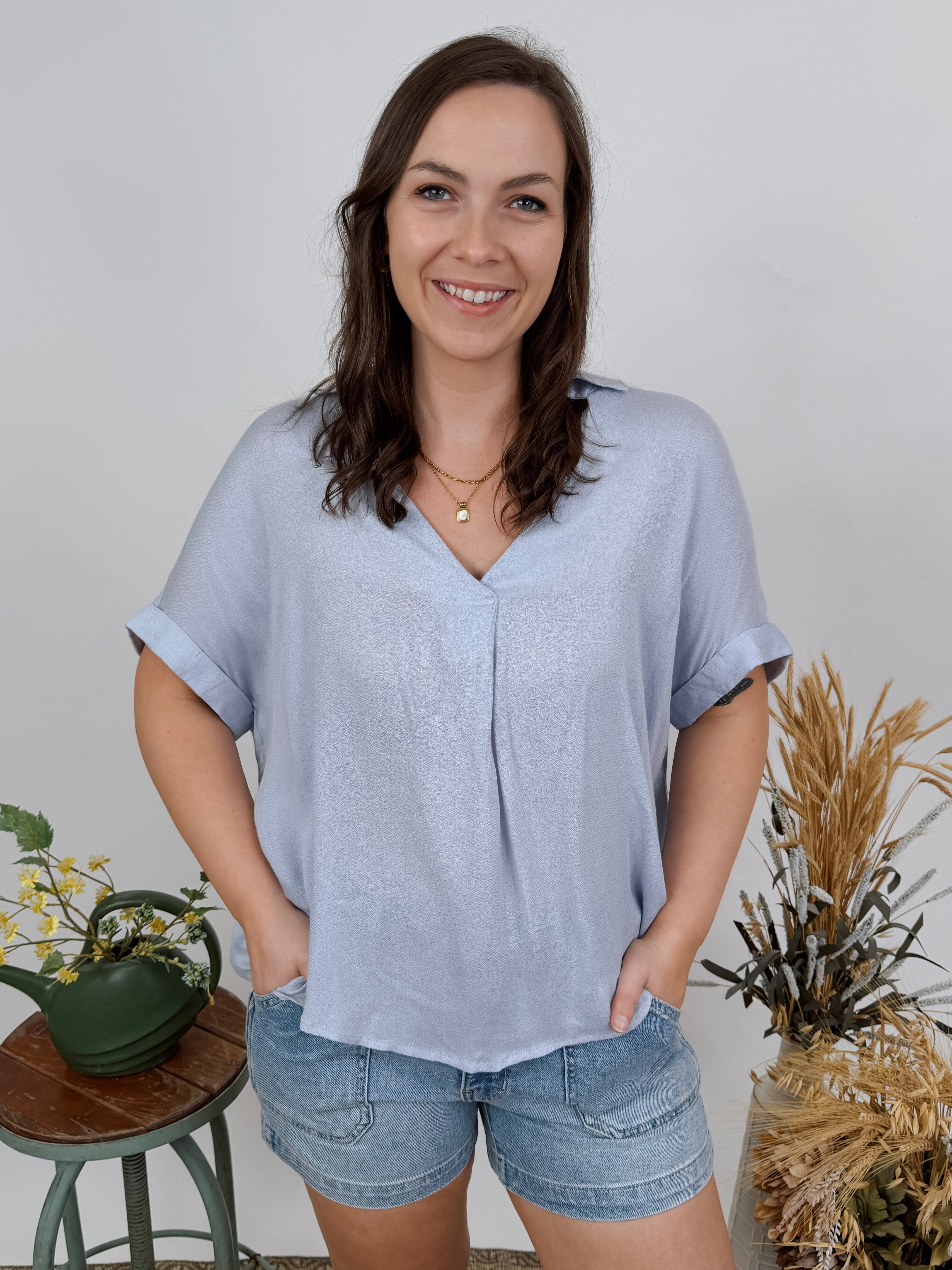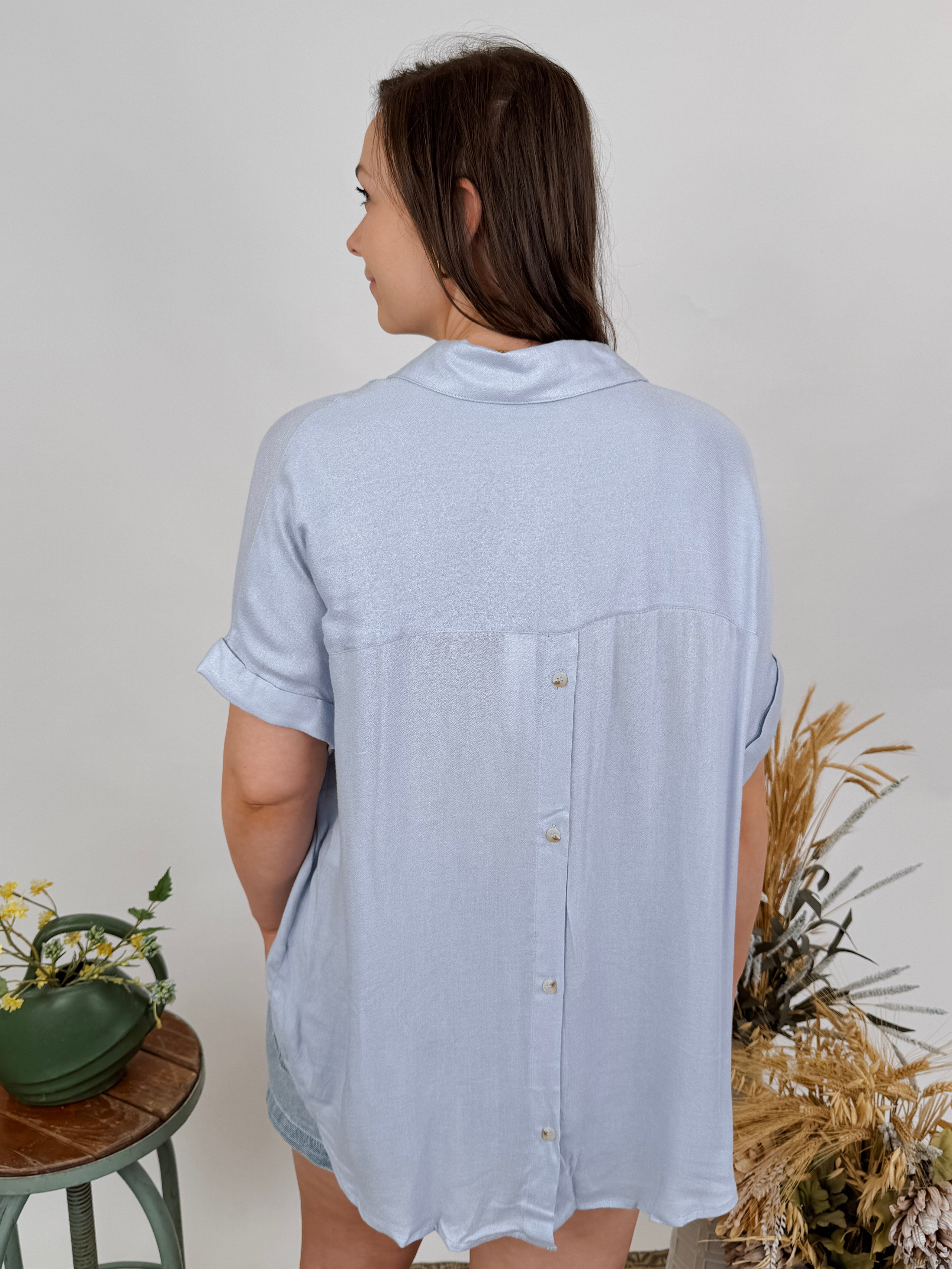 This lightweight easy breezy blouse is just what you need! We love the soft fabric, v-neckline, and back button detailing. Dress this up for work with a pair of slacks or keep it casual in the Royalty Shorts. Either way, you're going to love this blouse!