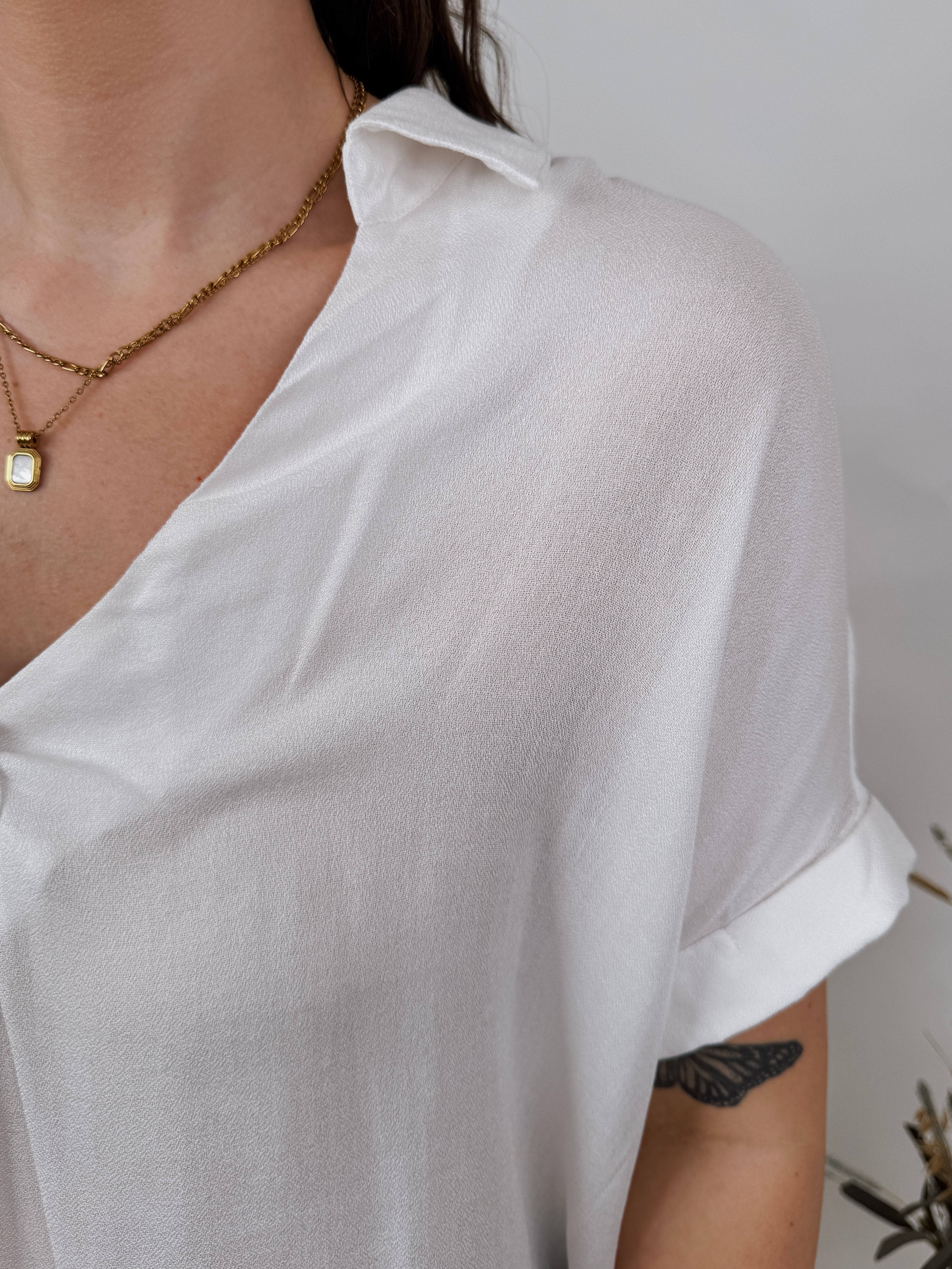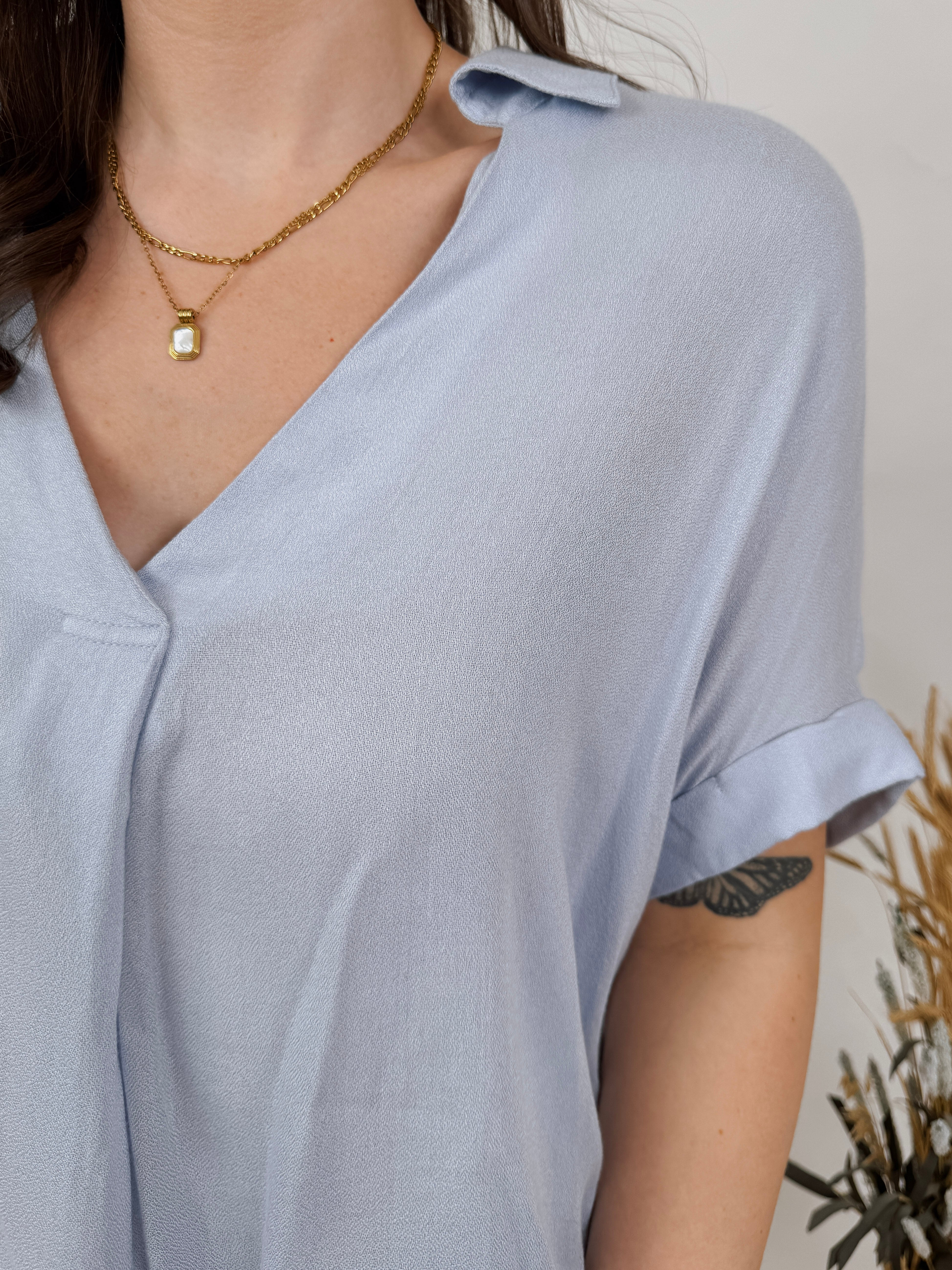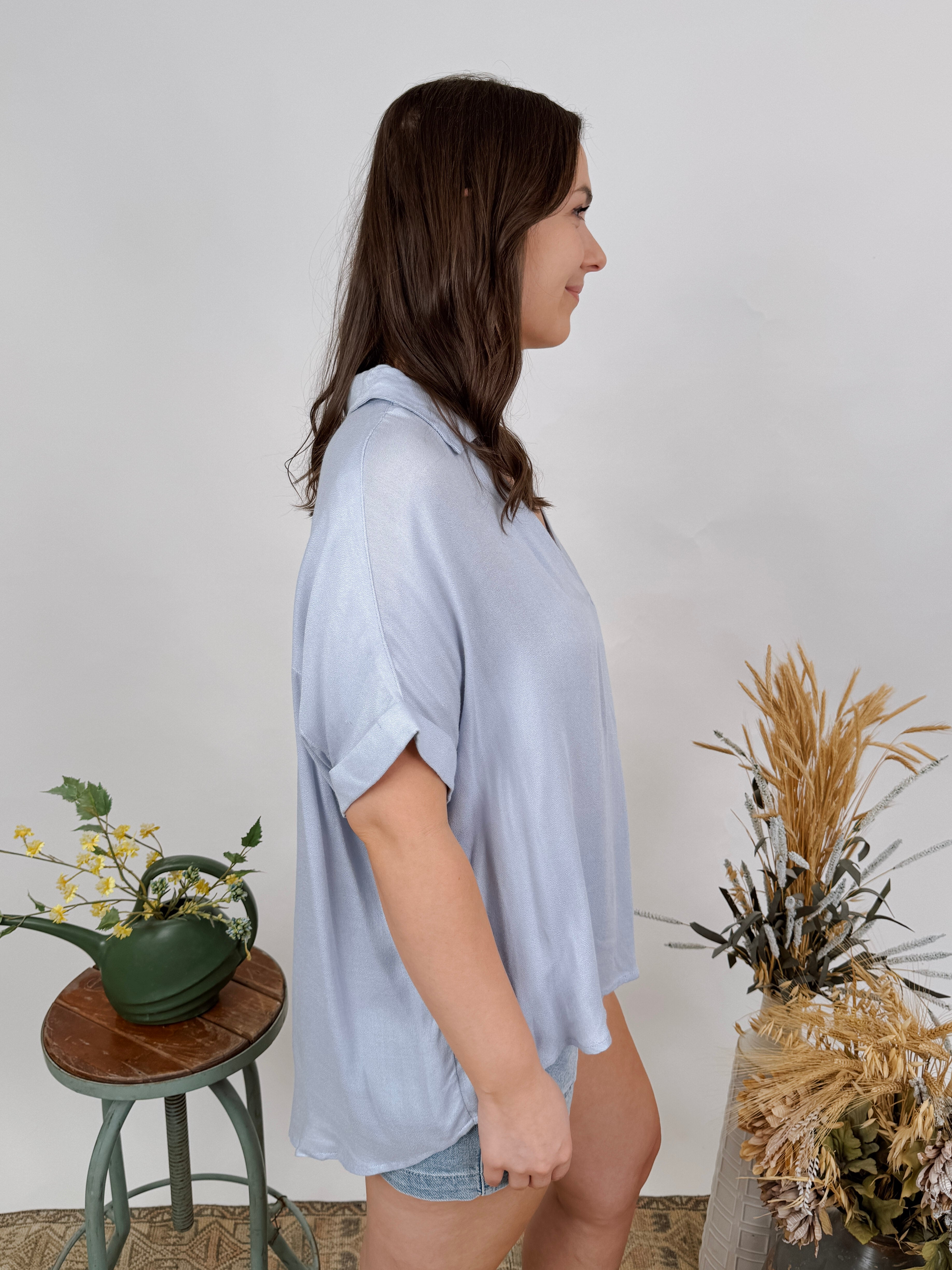 This lightweight easy breezy blouse is just what you need! We love the soft fabric, v-neckline, and back button detailing. Dress this up for work with a pair of slacks or keep it casual in the Royalty Shorts. Either way, you're going to love this blouse!