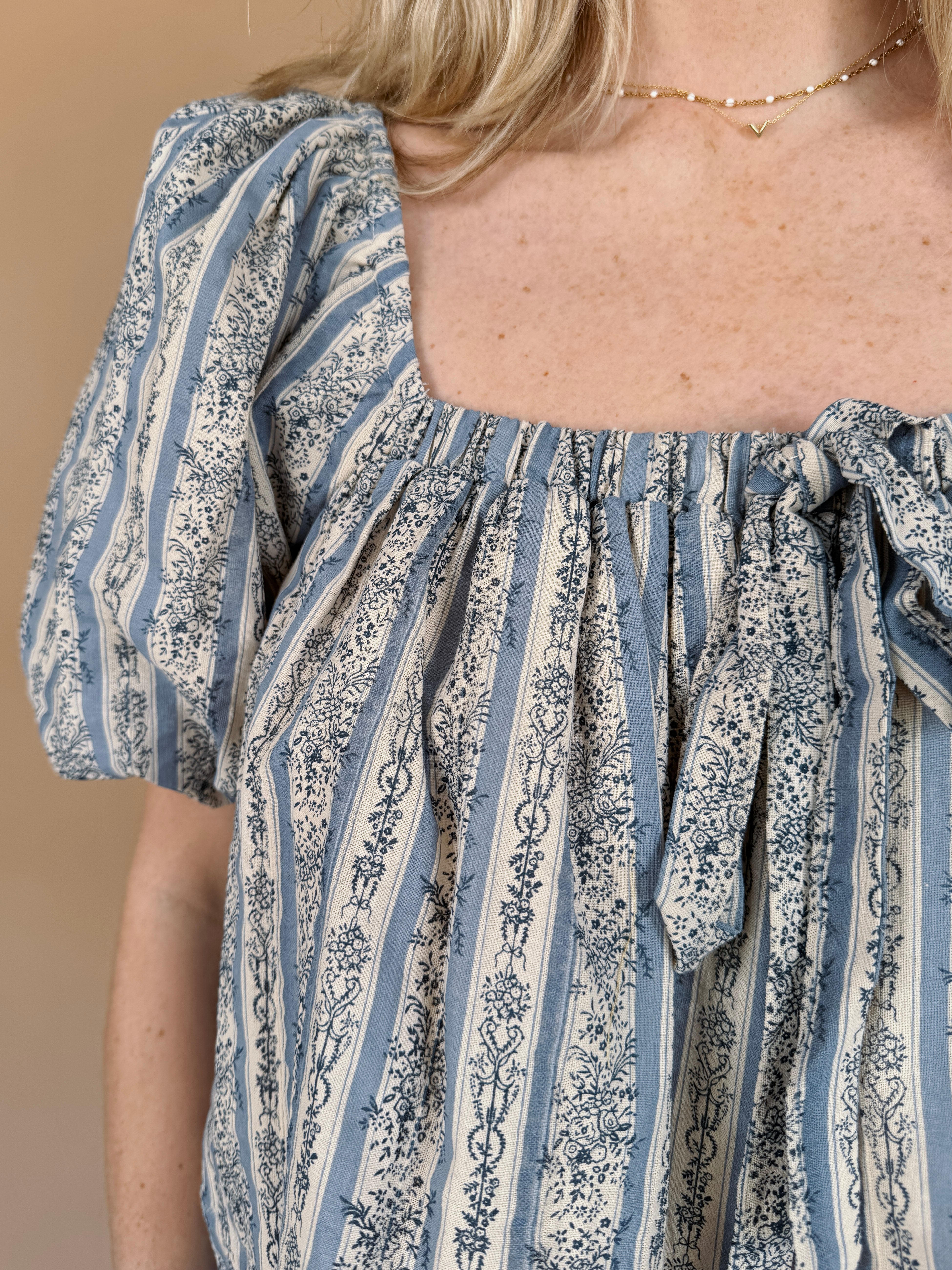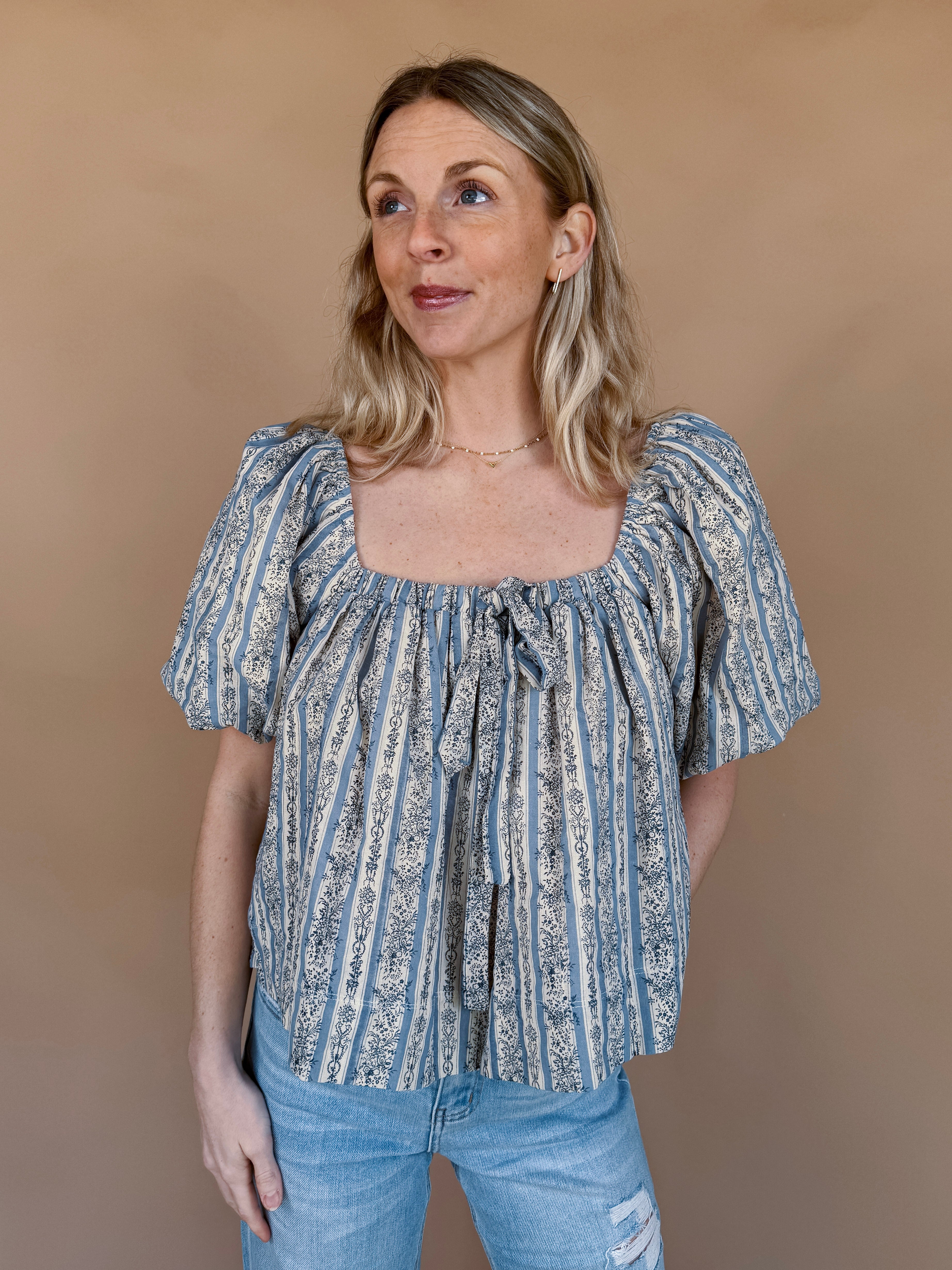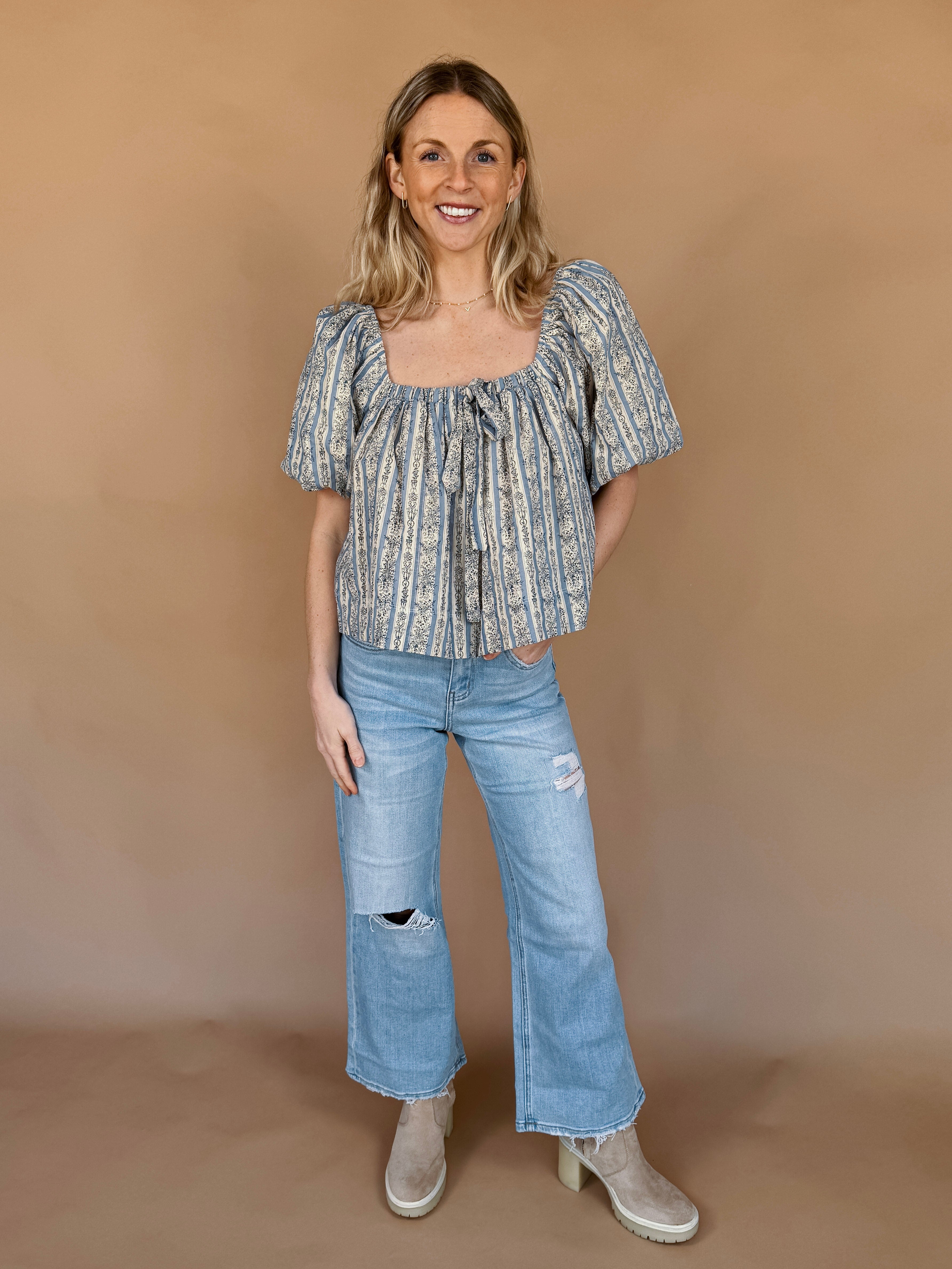 At the center of the chest is an adjustable bow, creating a darling focal point! The sleeves are slightly puffed & adds to the overall effect of whimsy. Perfect for pairing with jeans, skirts, & shorts, you'll love to have this one for this spring & summer!