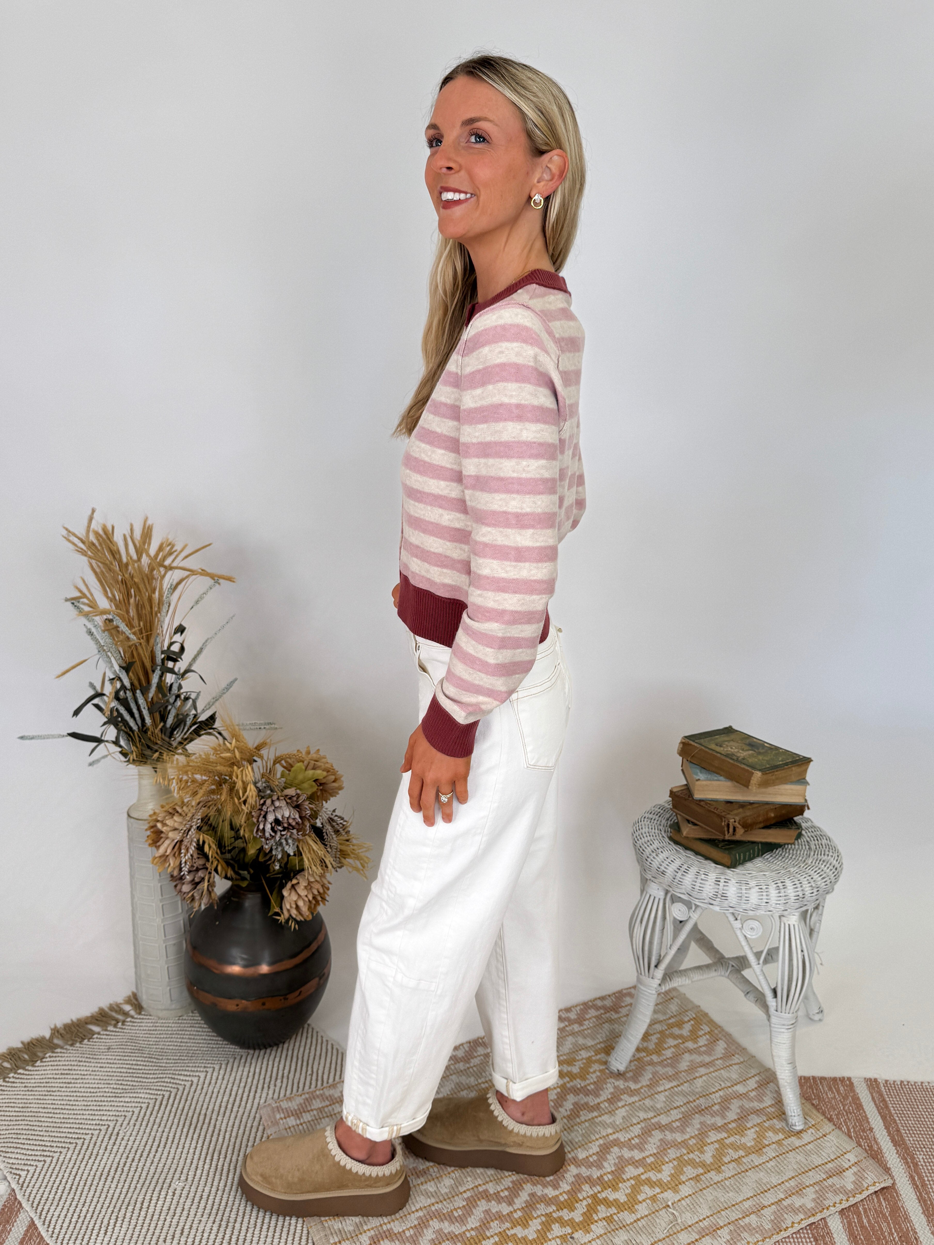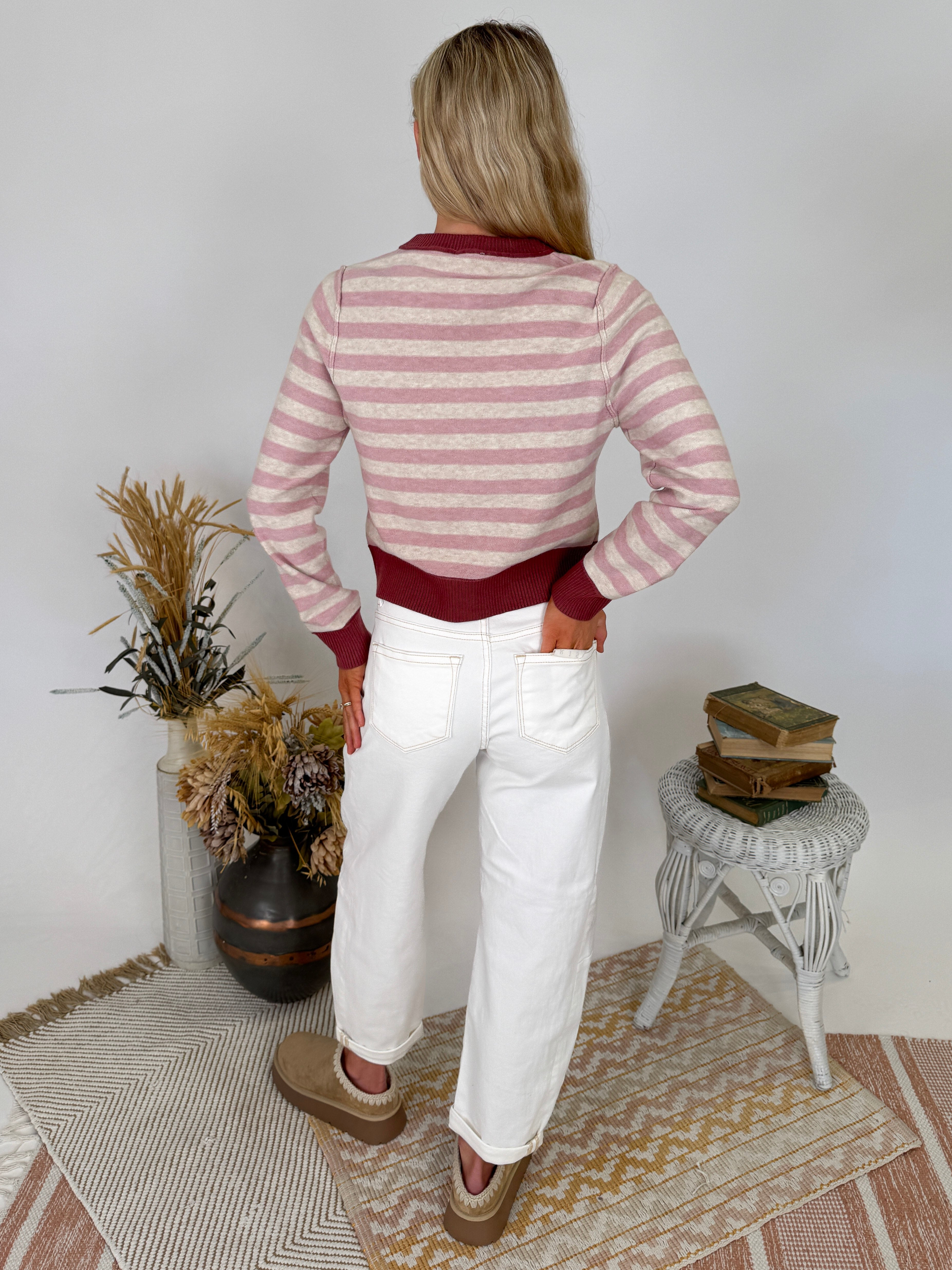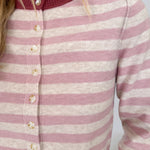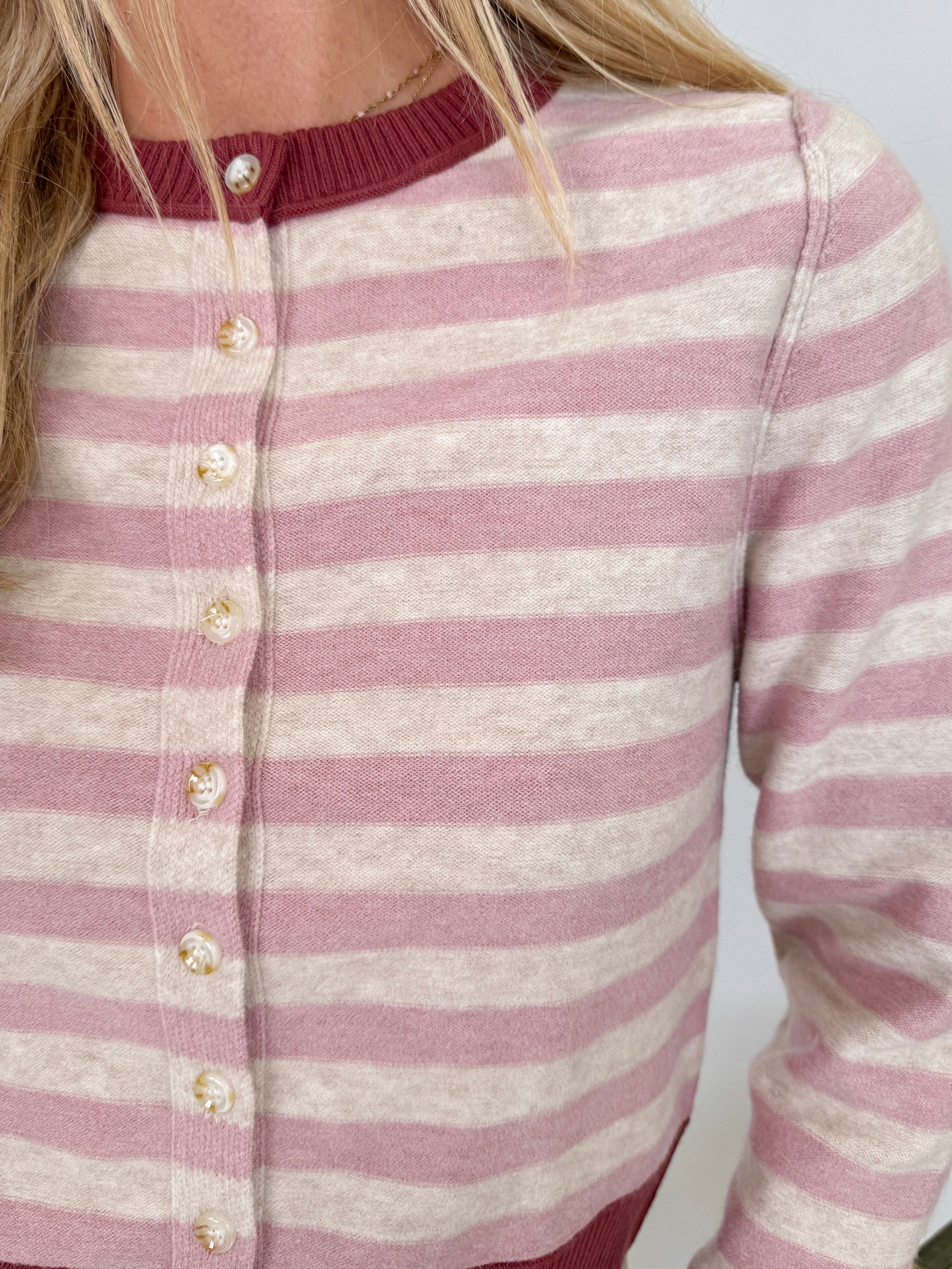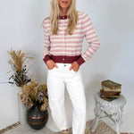 Wrap yourself in cozy style with the Key To Your Heart Stripe Cardigan. This sweet striped cardigan features vintage-inspired details and the softest knit fabric that feels like a warm hug. The pink and cream stripes with burgundy trim create a romantic color palette that's perfect for layering through every season.