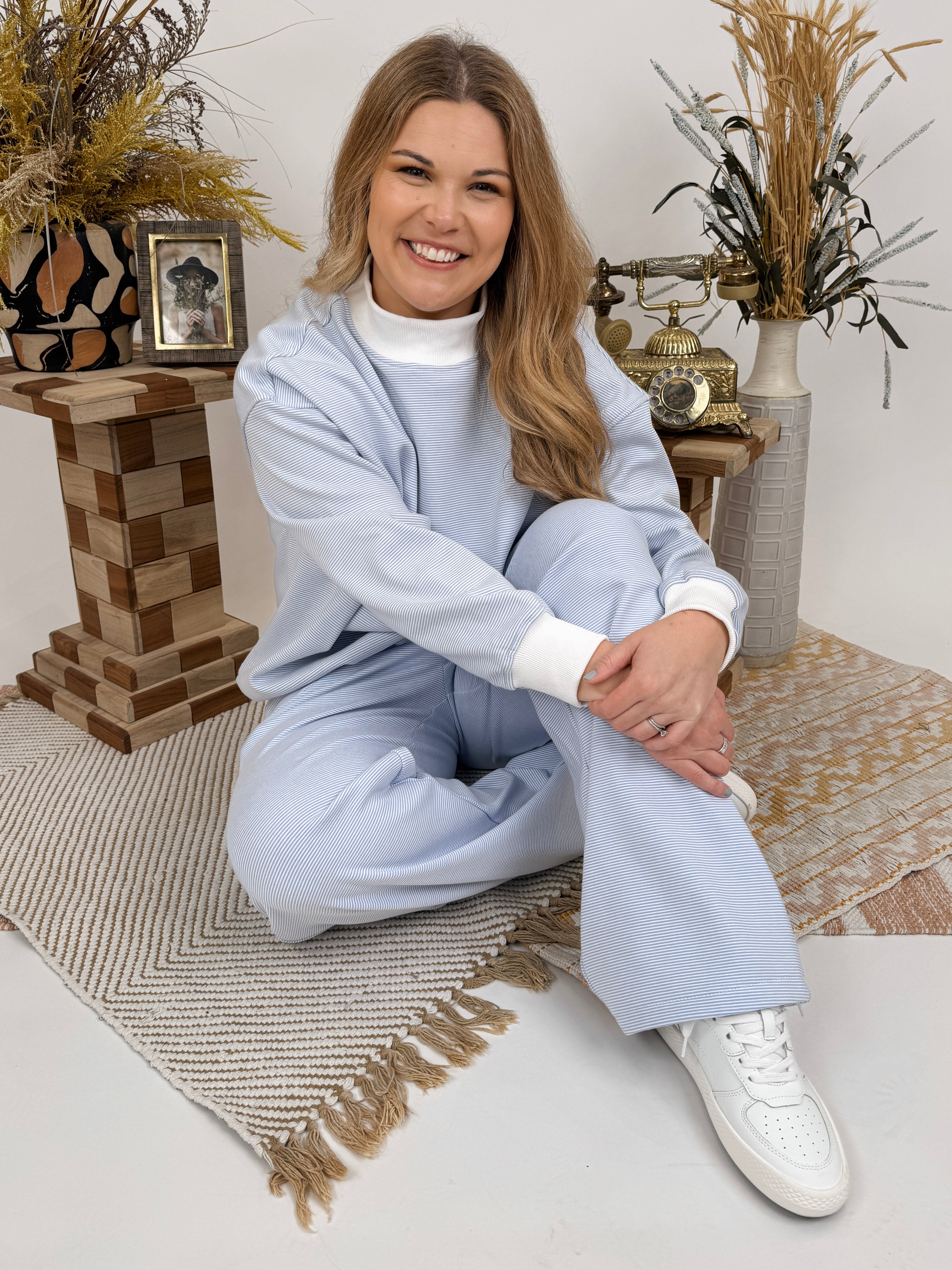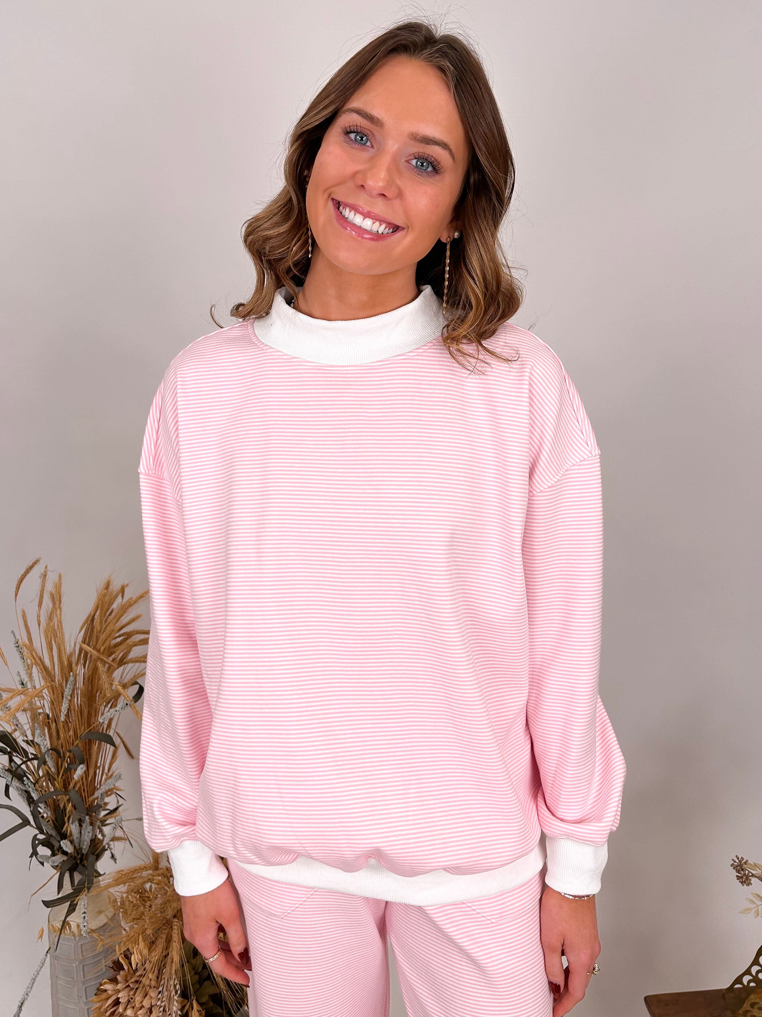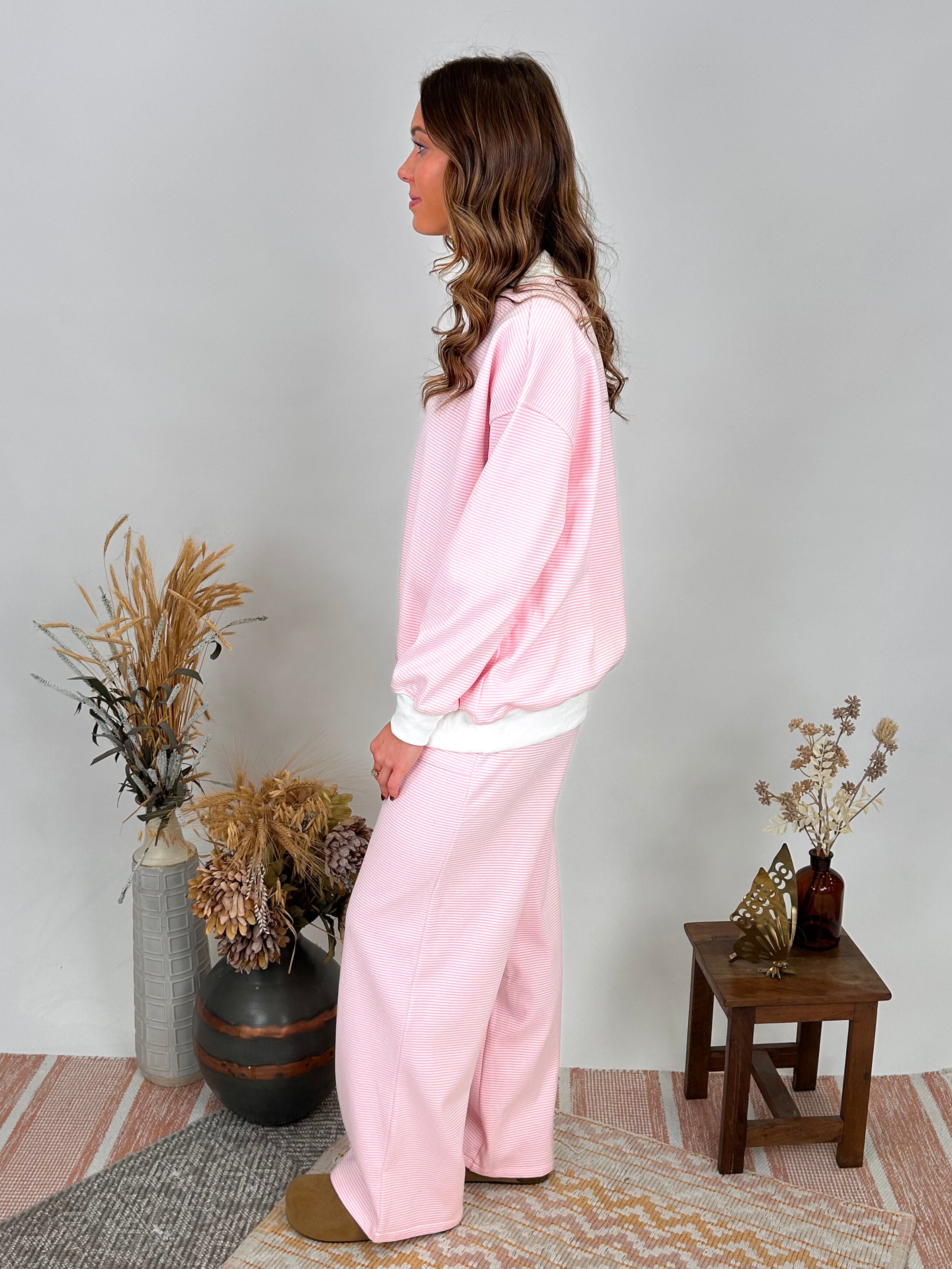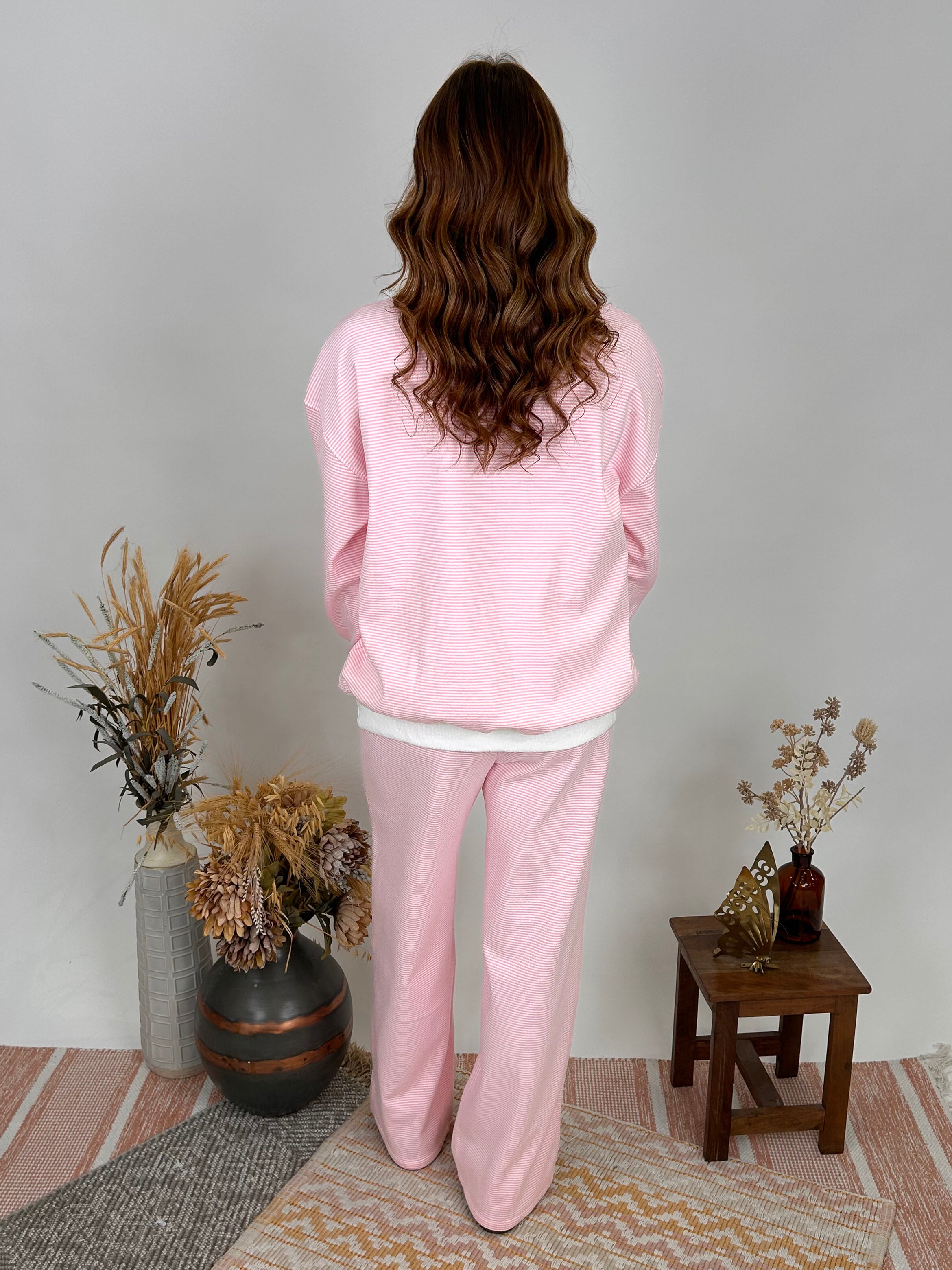 Cozy meets chic in the Kristi Striped Sweat Set. This matching set is everything you need for those days when comfort is non-negotiable but style is still a priority. Featuring soft pink and white stripes with contrasting white trim, this two-piece set is perfect for after church lazy Sundays, travel days, or just lounging in style at home.