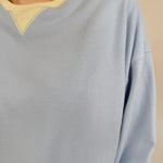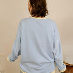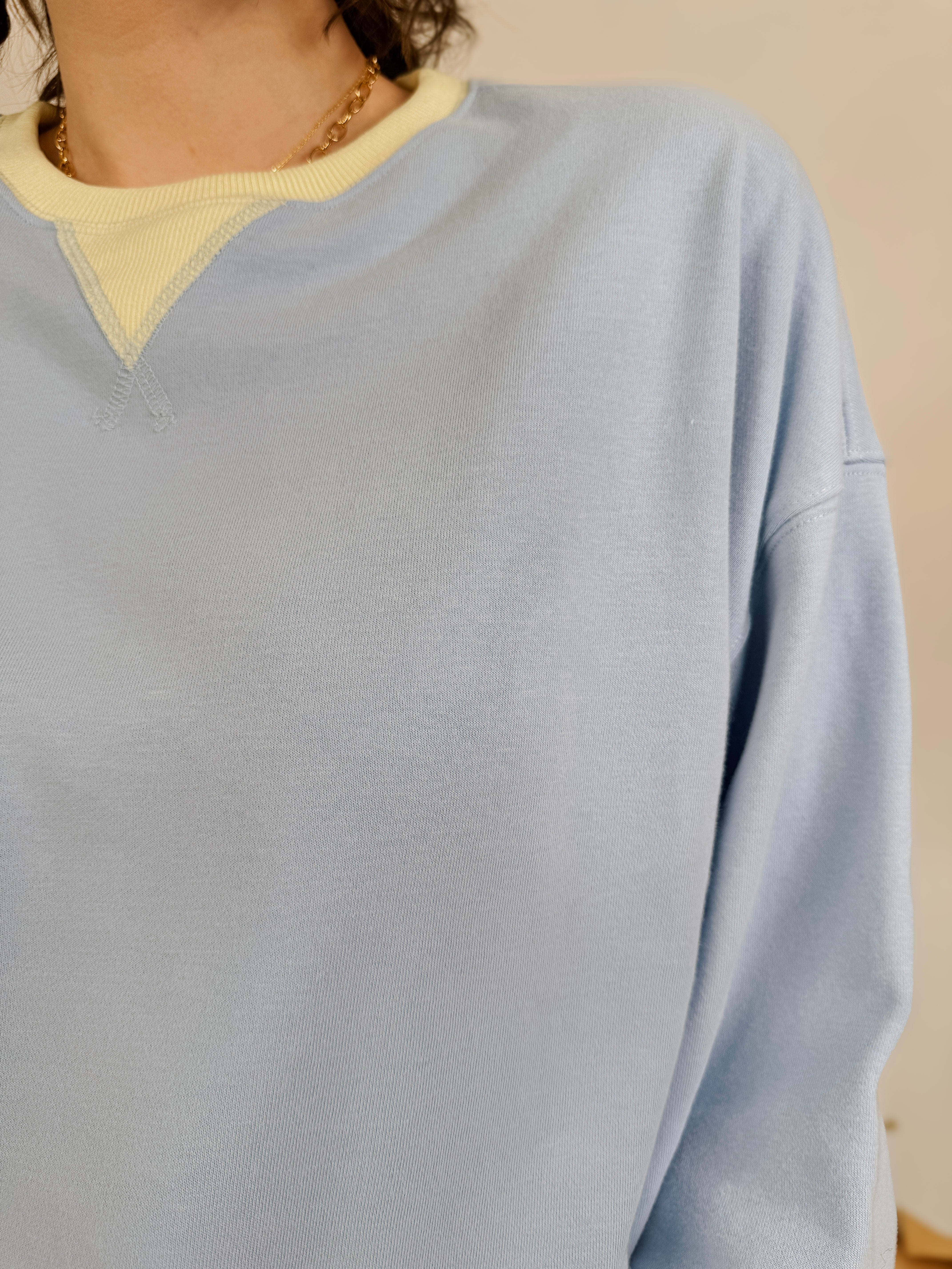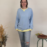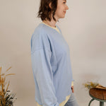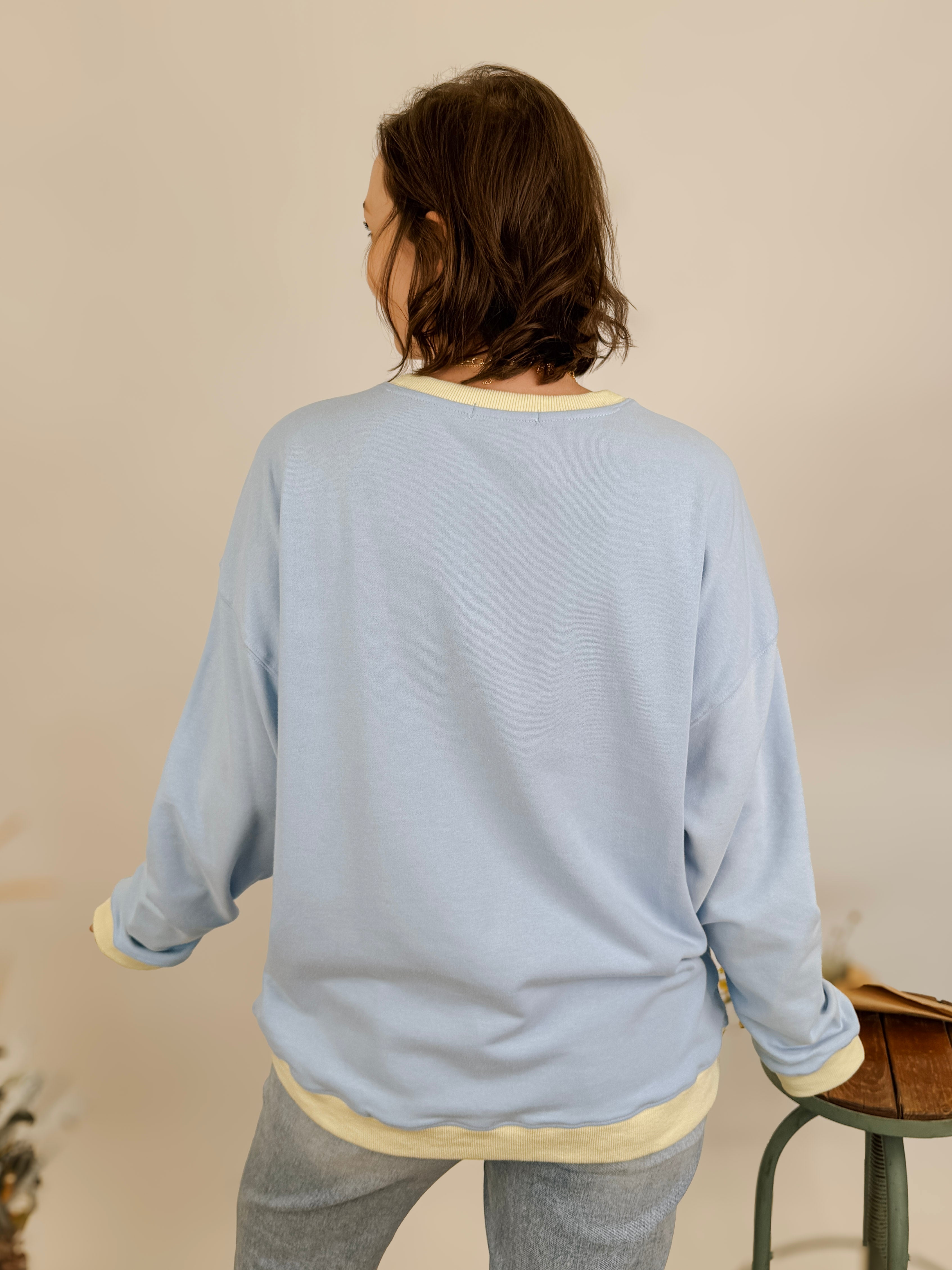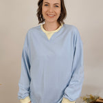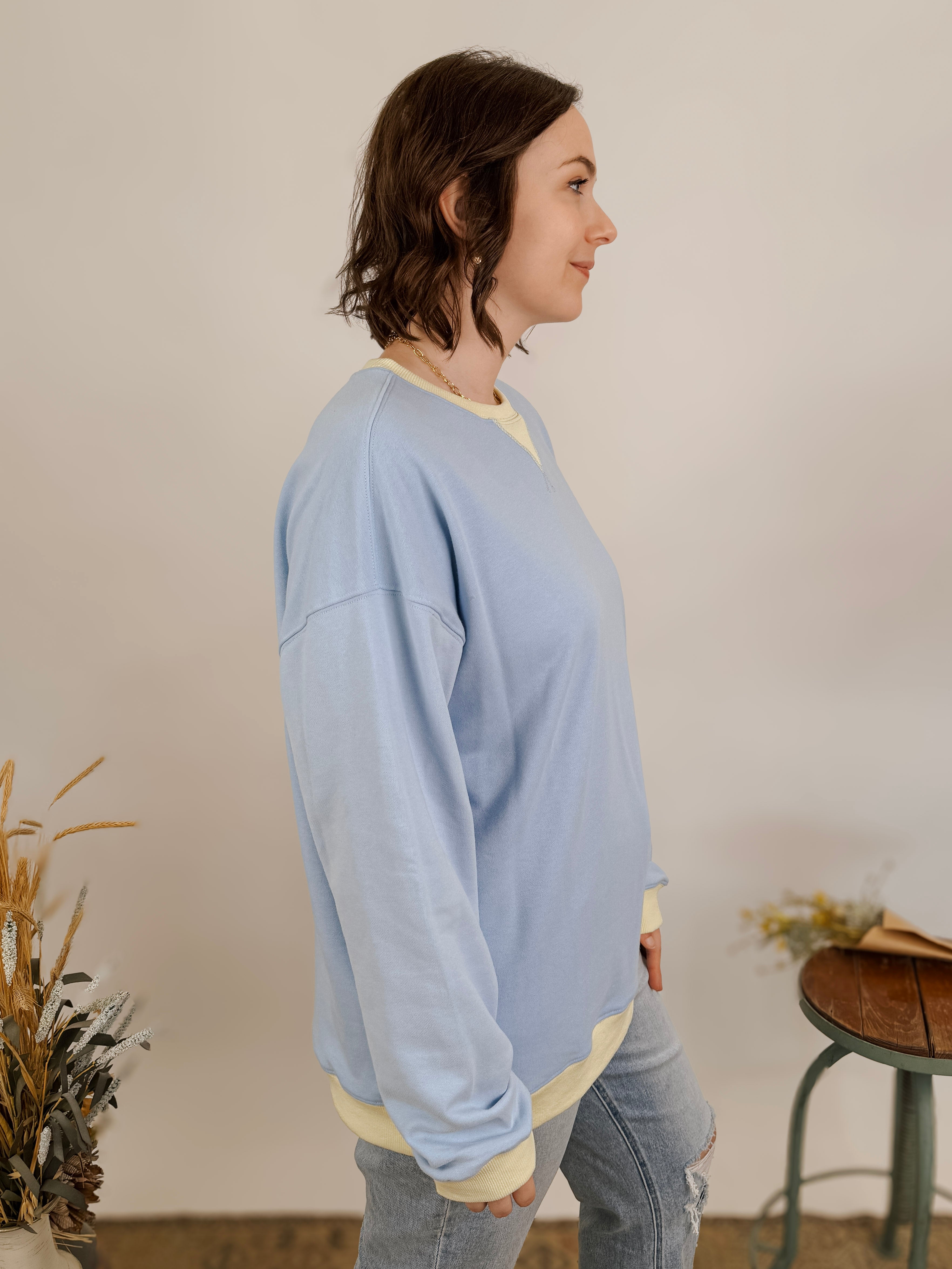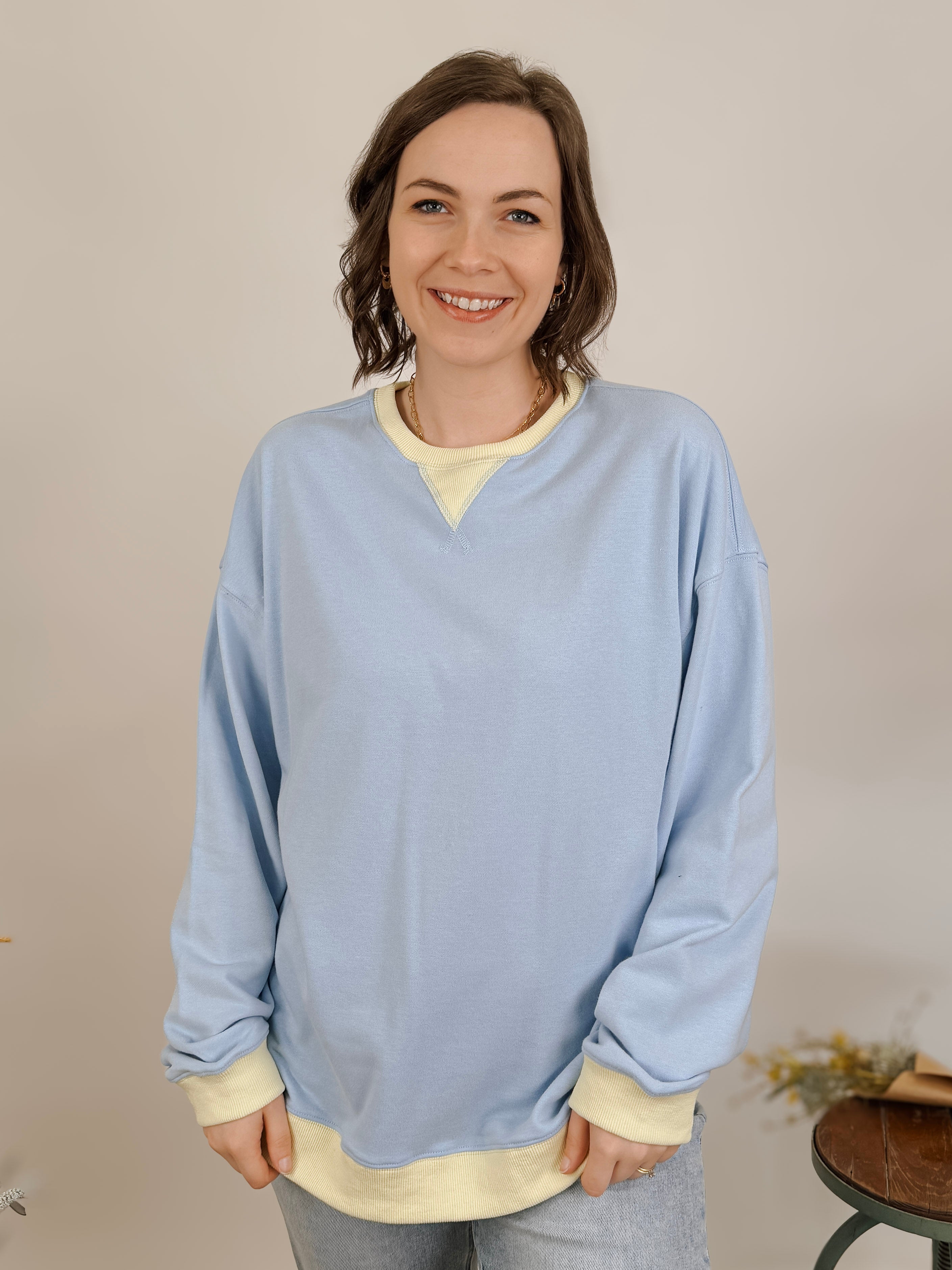 The Laney Pullover has light blue coloring with butter yellow contrasting around the trim. We love the comfy and oversized fit of this sweatshirt. It can be worn for Just Another Tuesday with jeans and converse or worn more casually with leggings!
