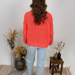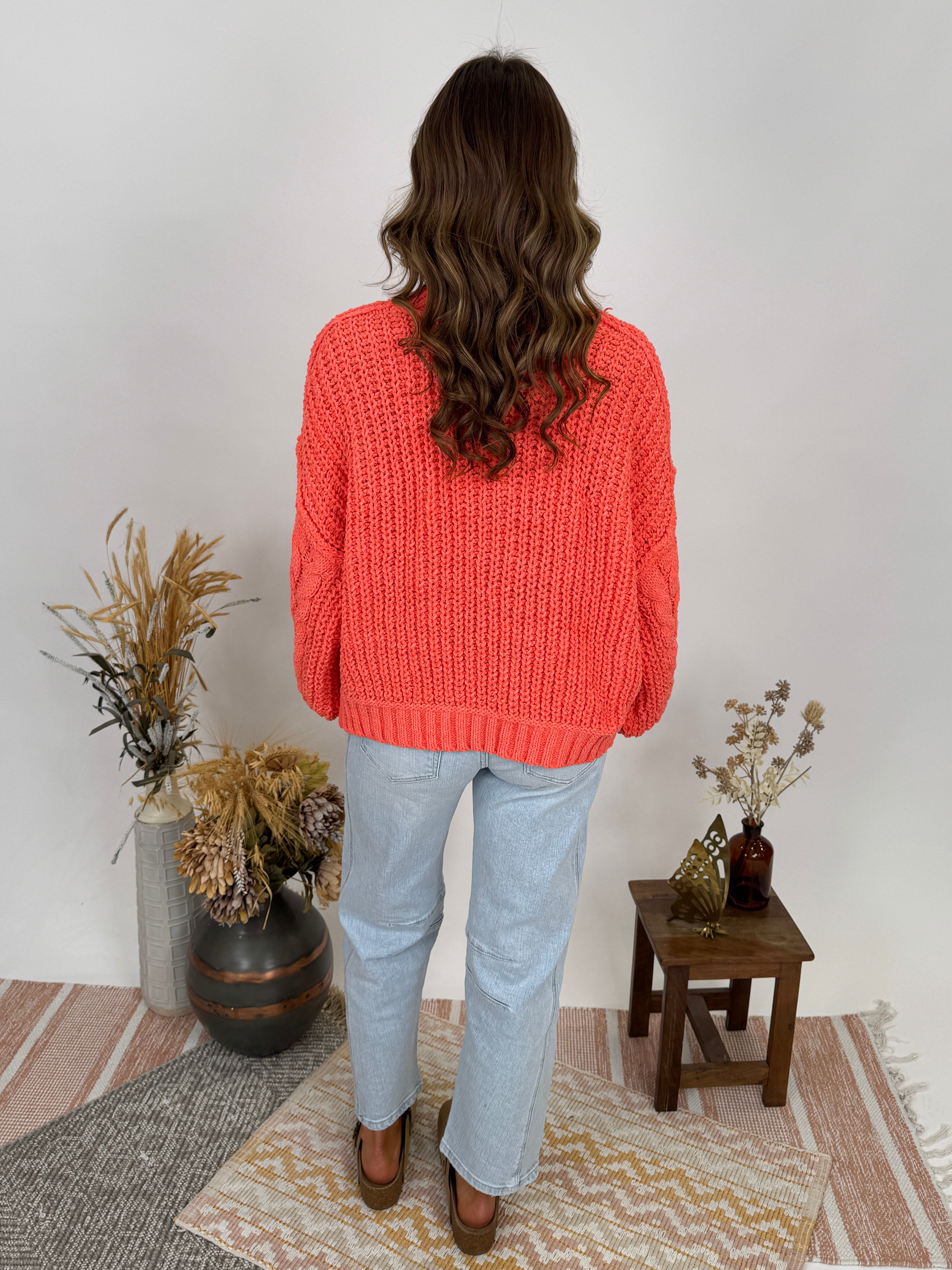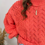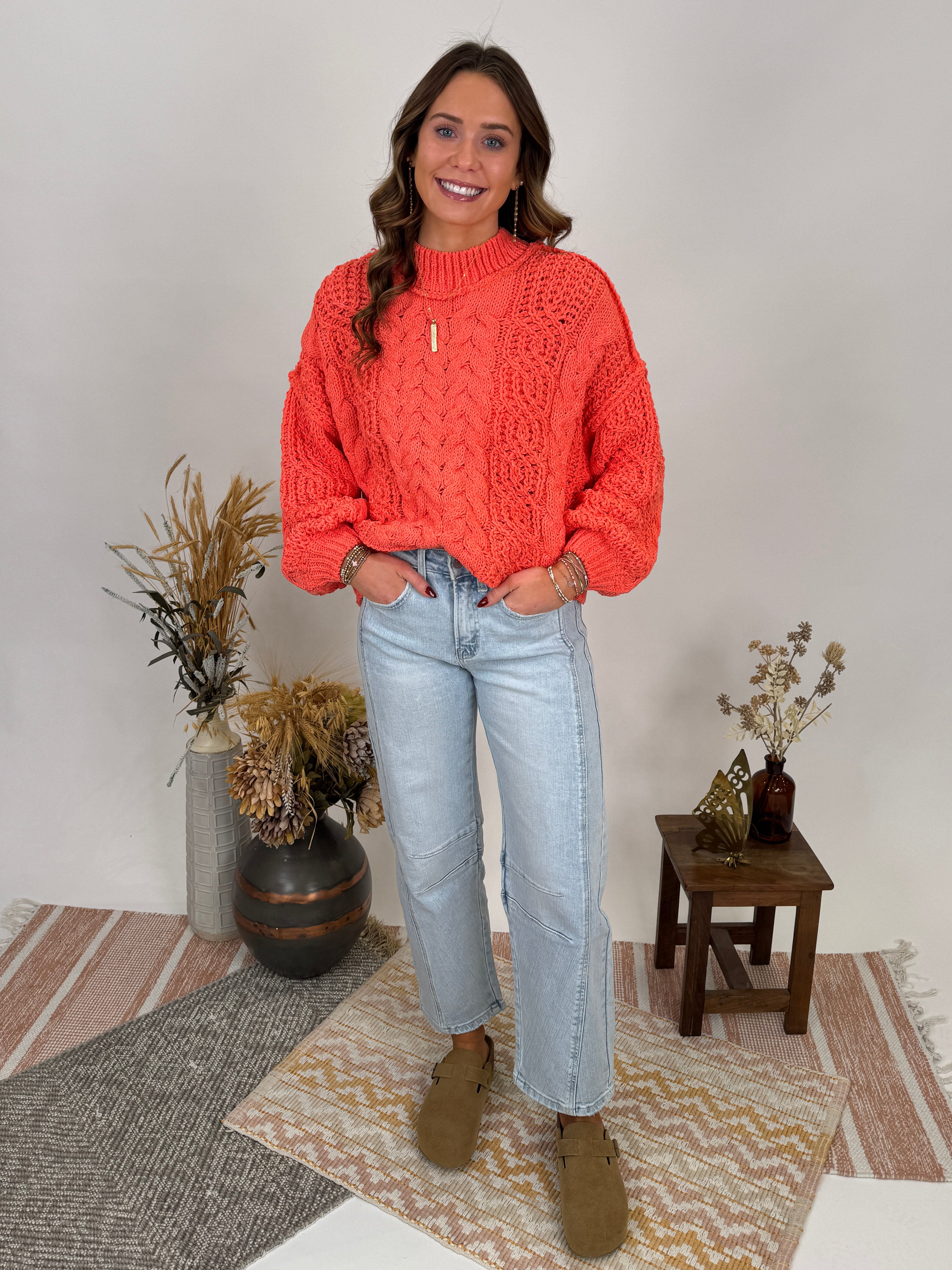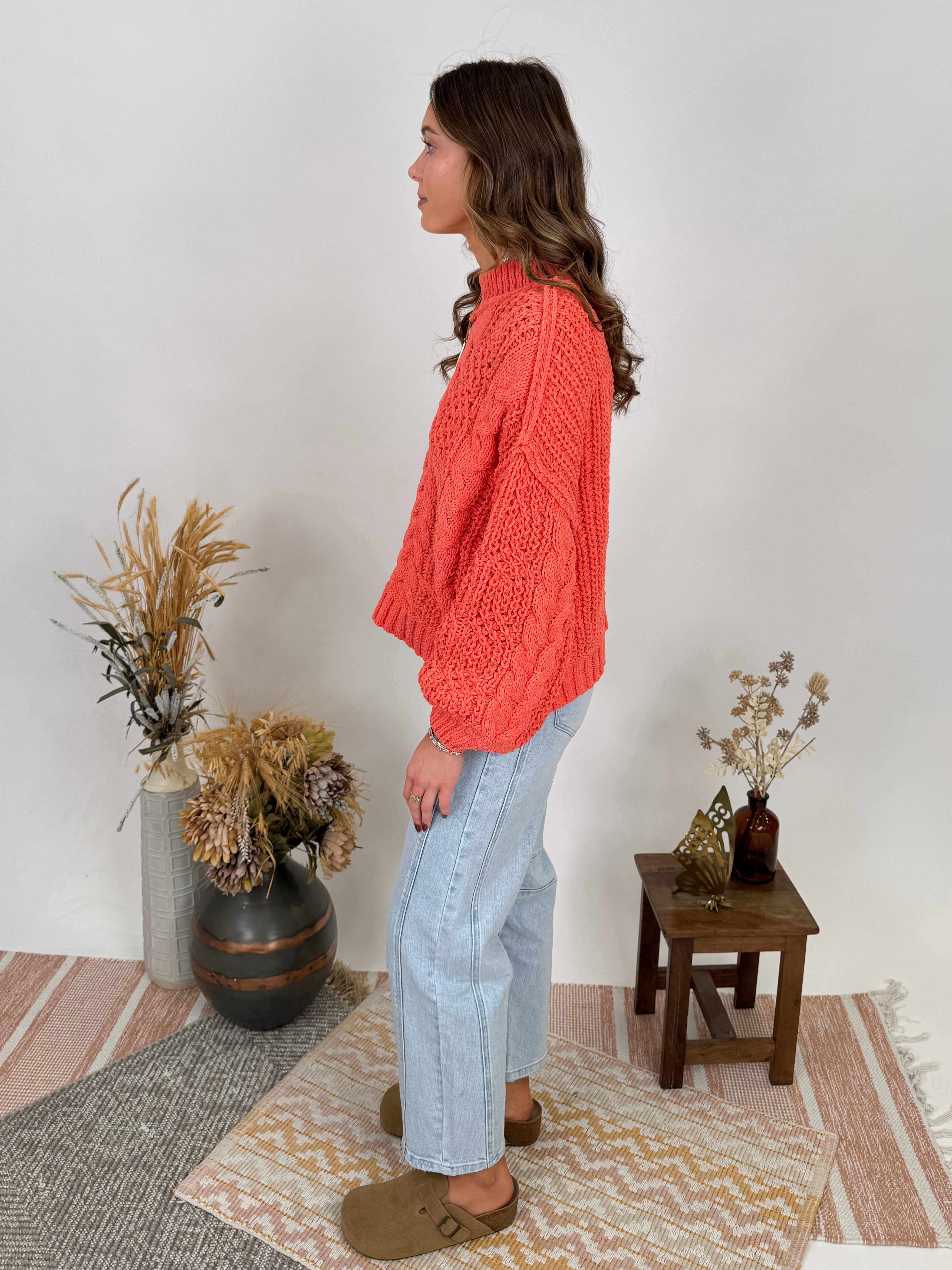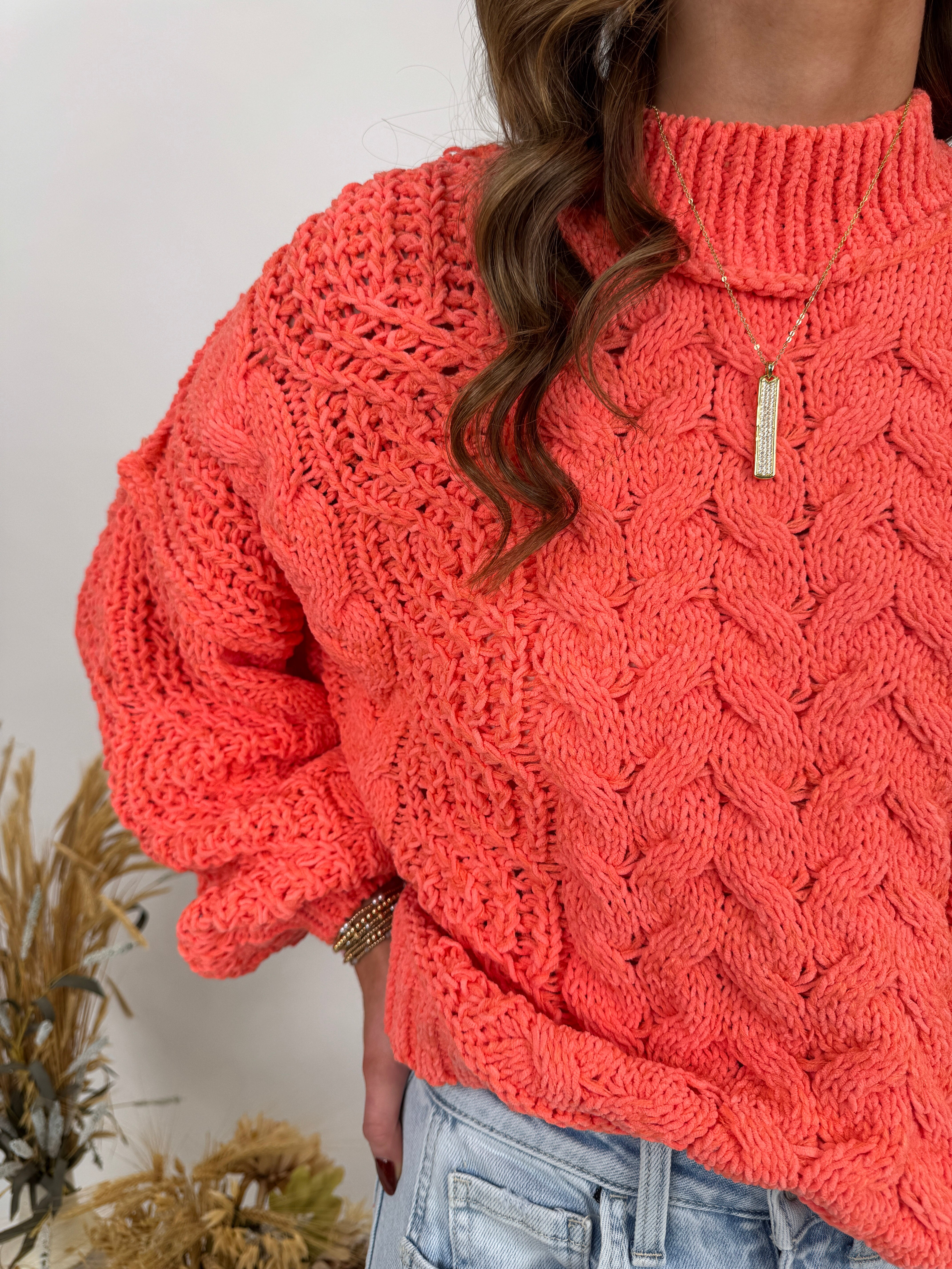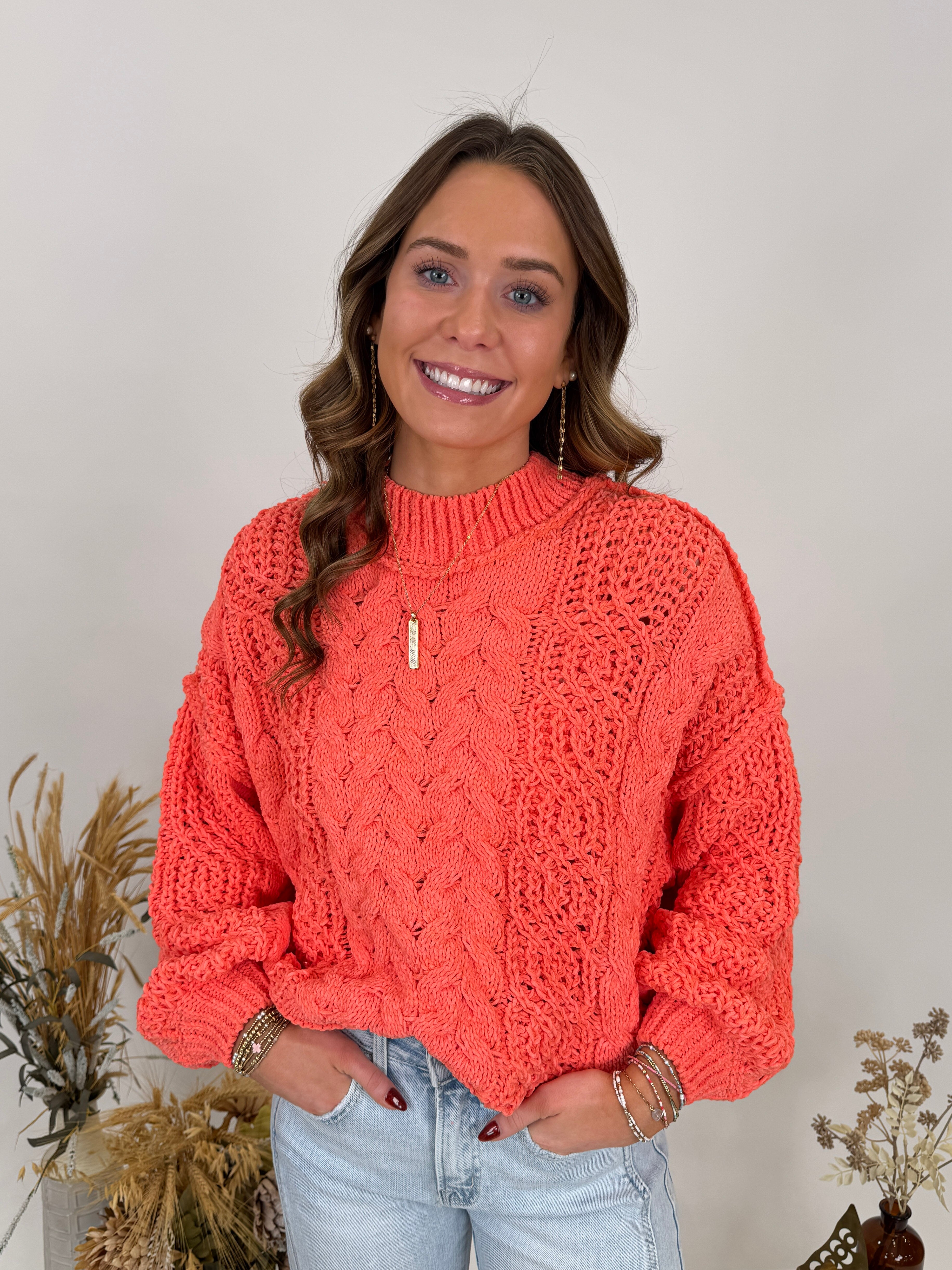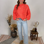 Add a vibrant pop of color to your fall and winter wardrobe with the Marmalade Cable Knit Sweater. This eye-catching coral-orange sweater features intricate cable knit and open-weave detailing that adds texture and visual interest. The cozy mock neckline and relaxed fit make it your go-to piece for effortless style and comfort.