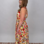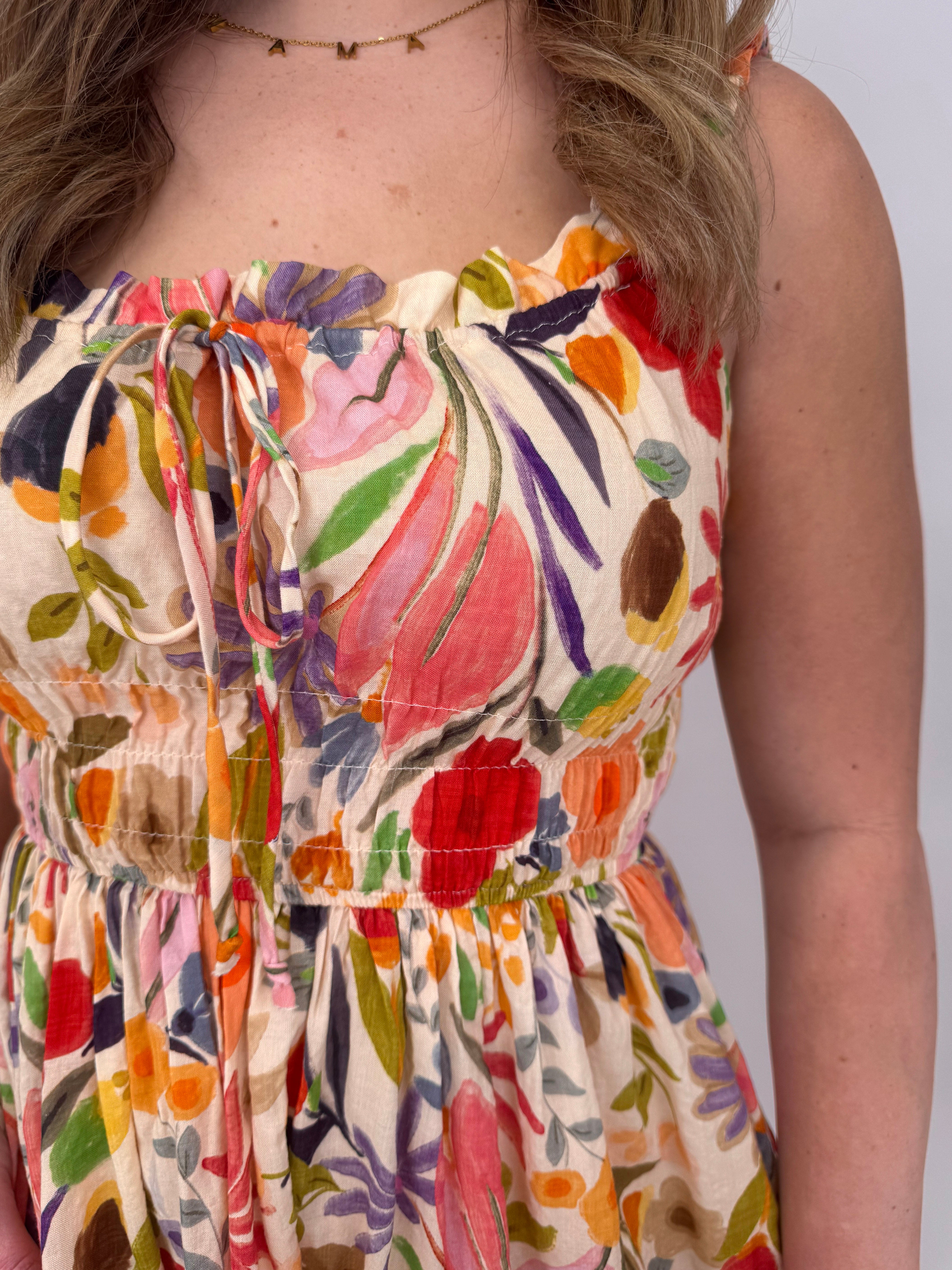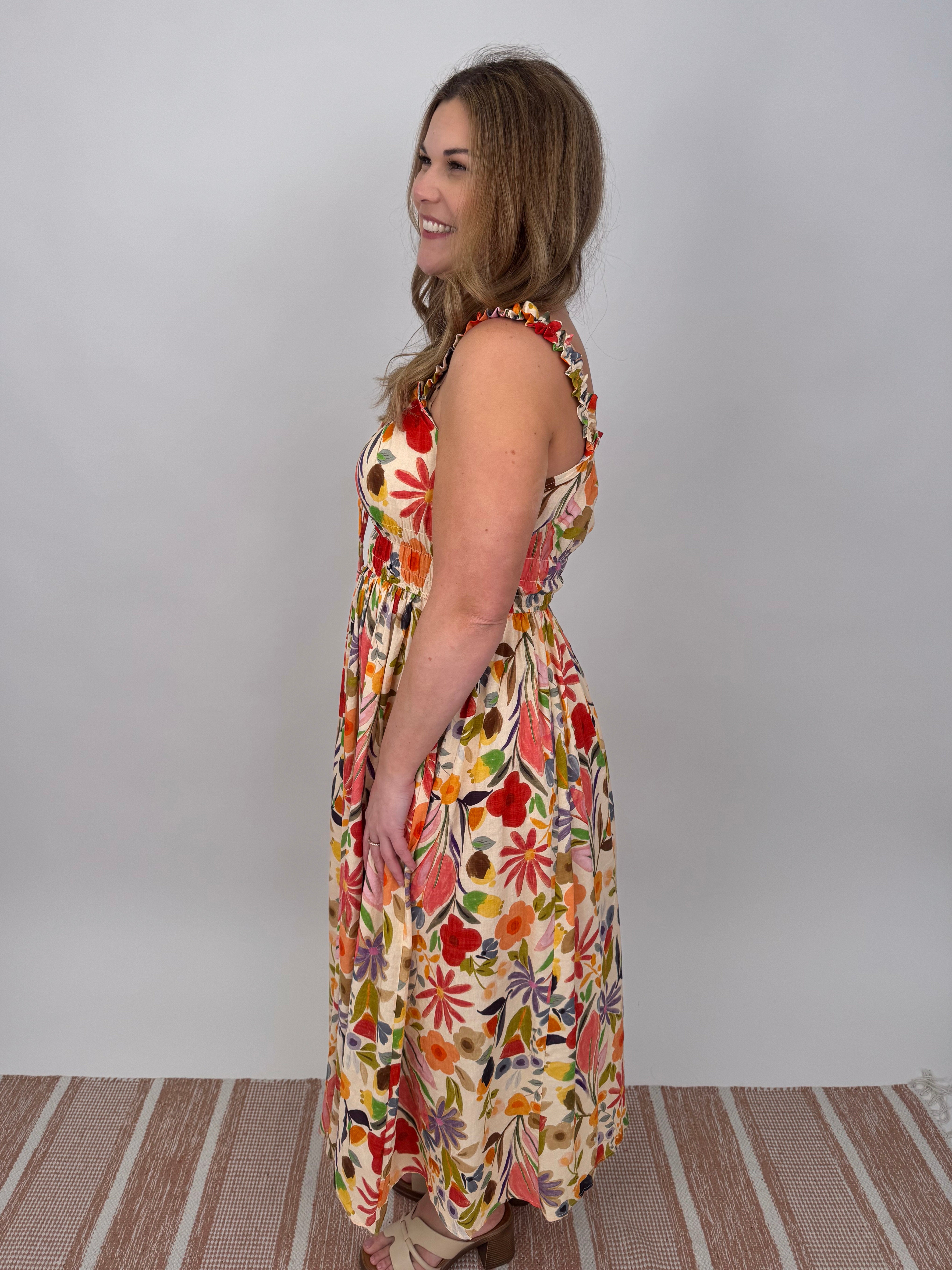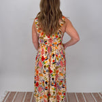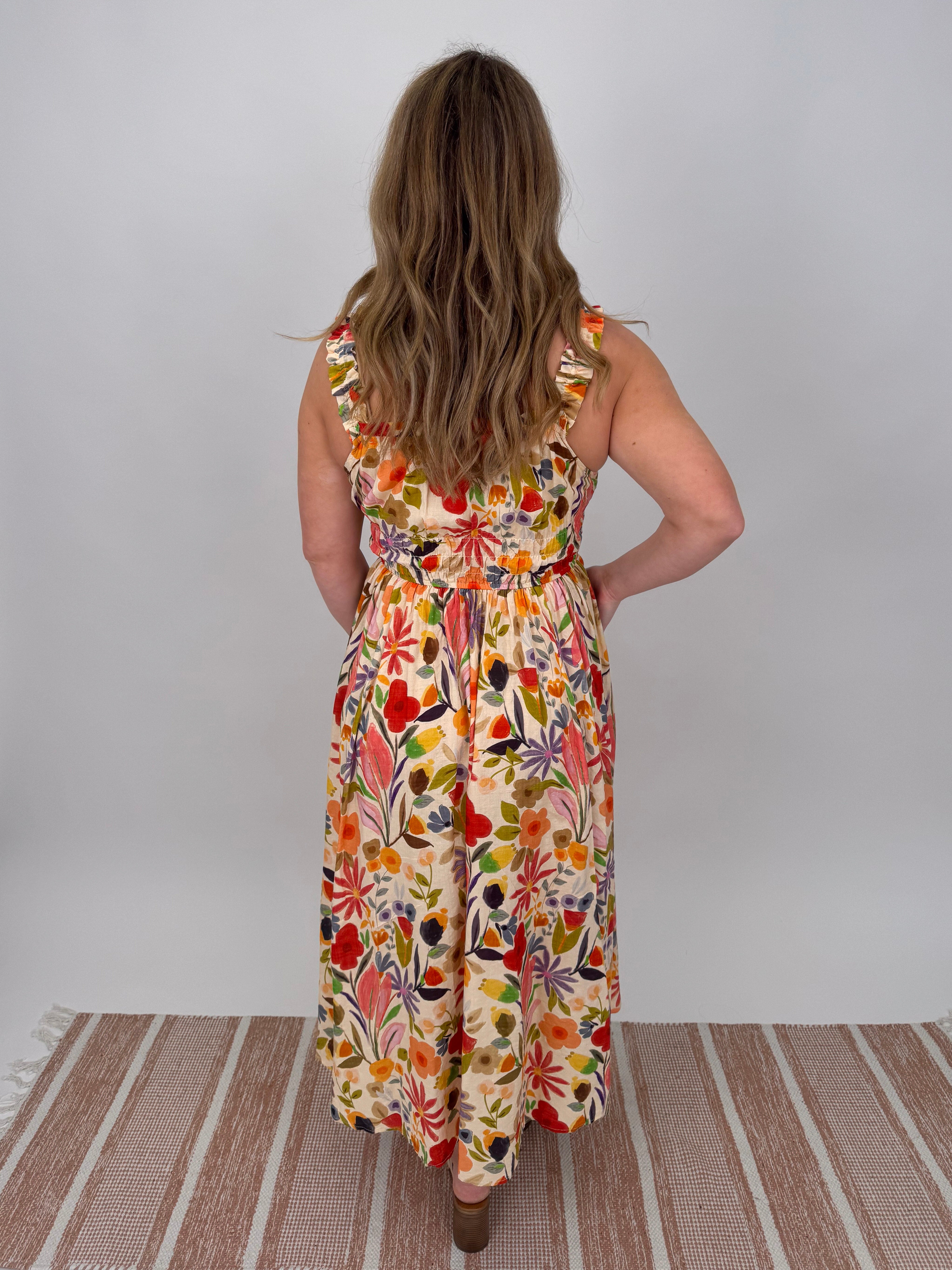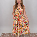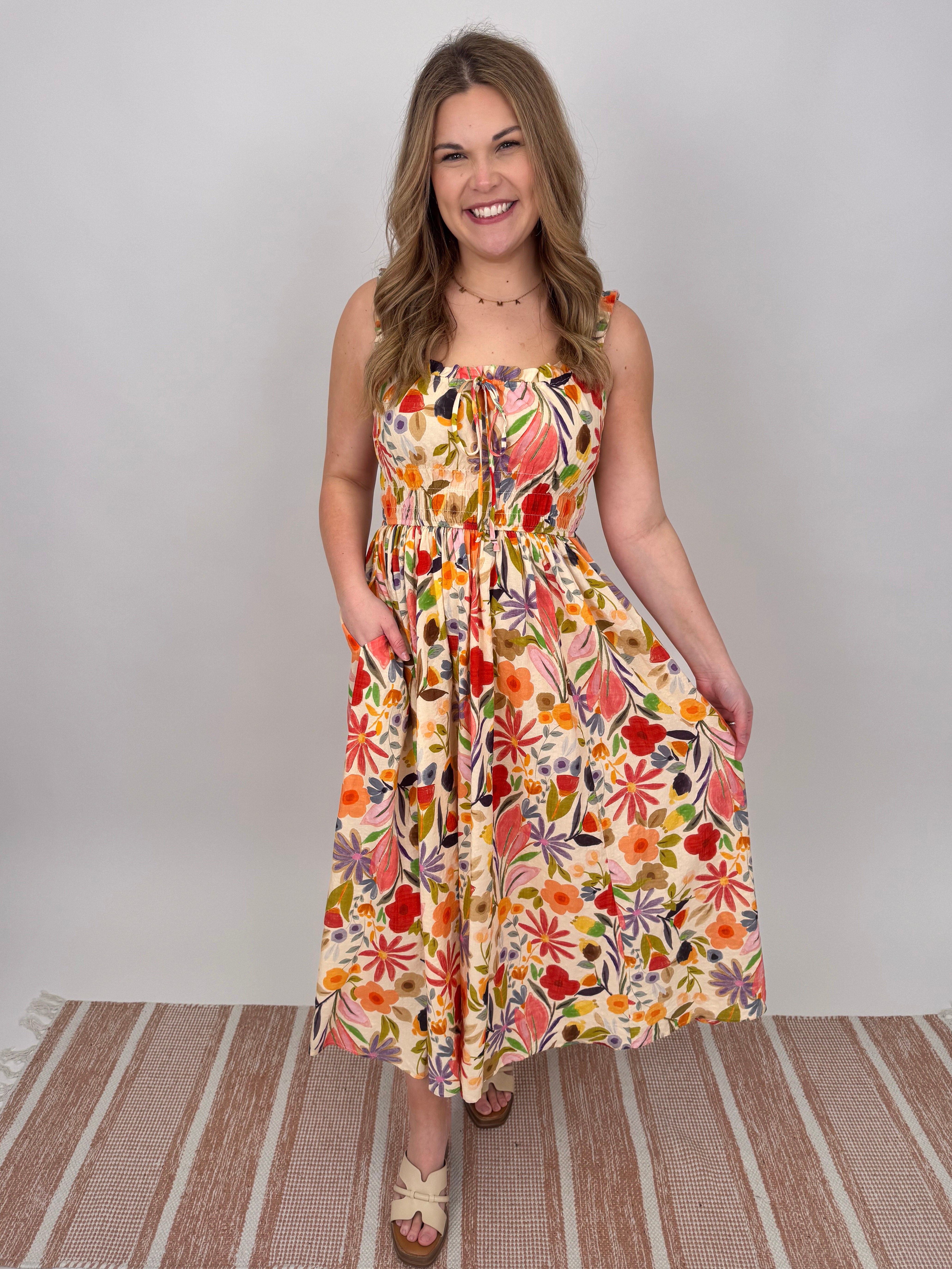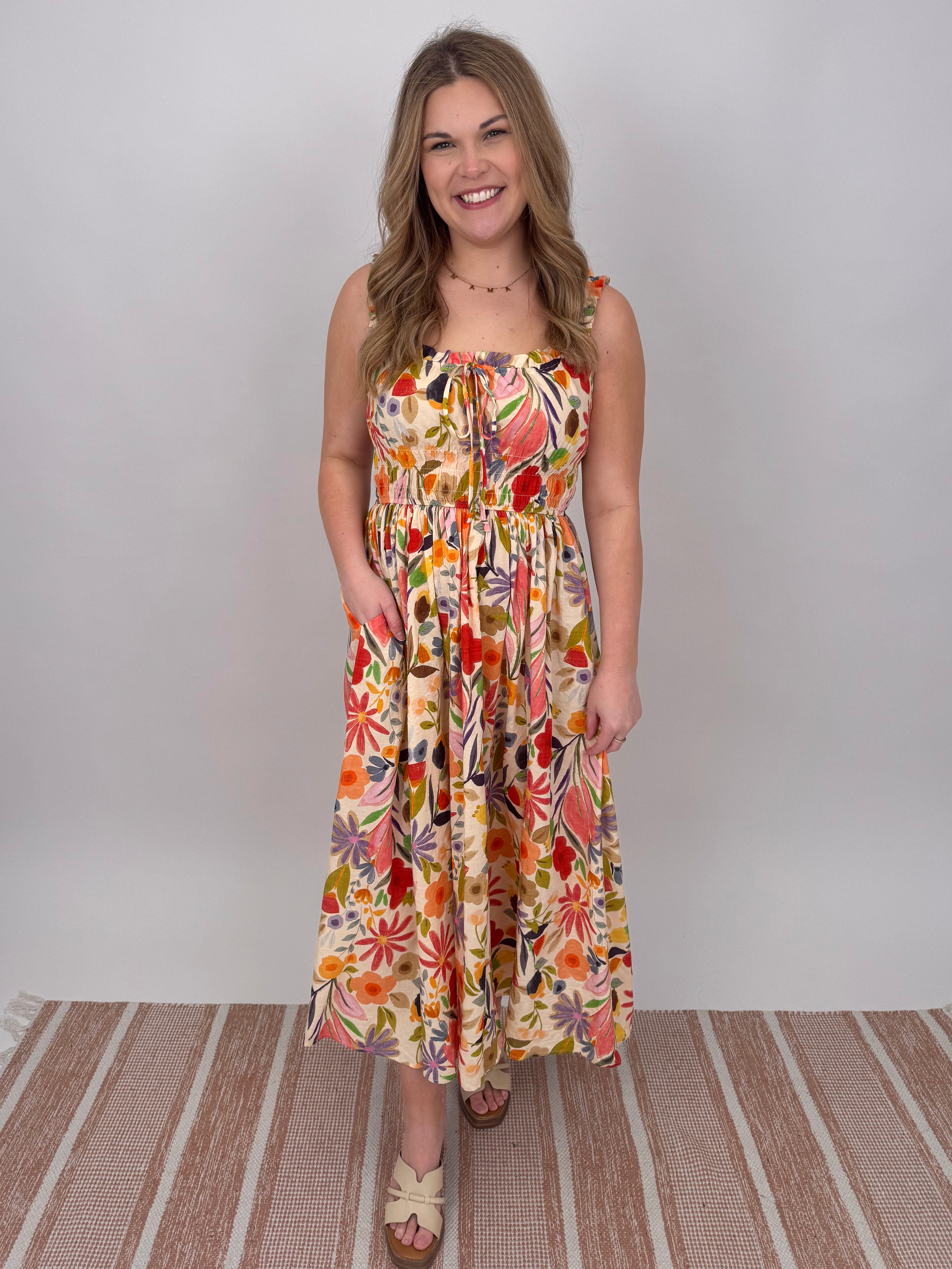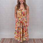 Vibrant desert tan base with a bold, artistic floral print in reds, oranges, greens, and purples