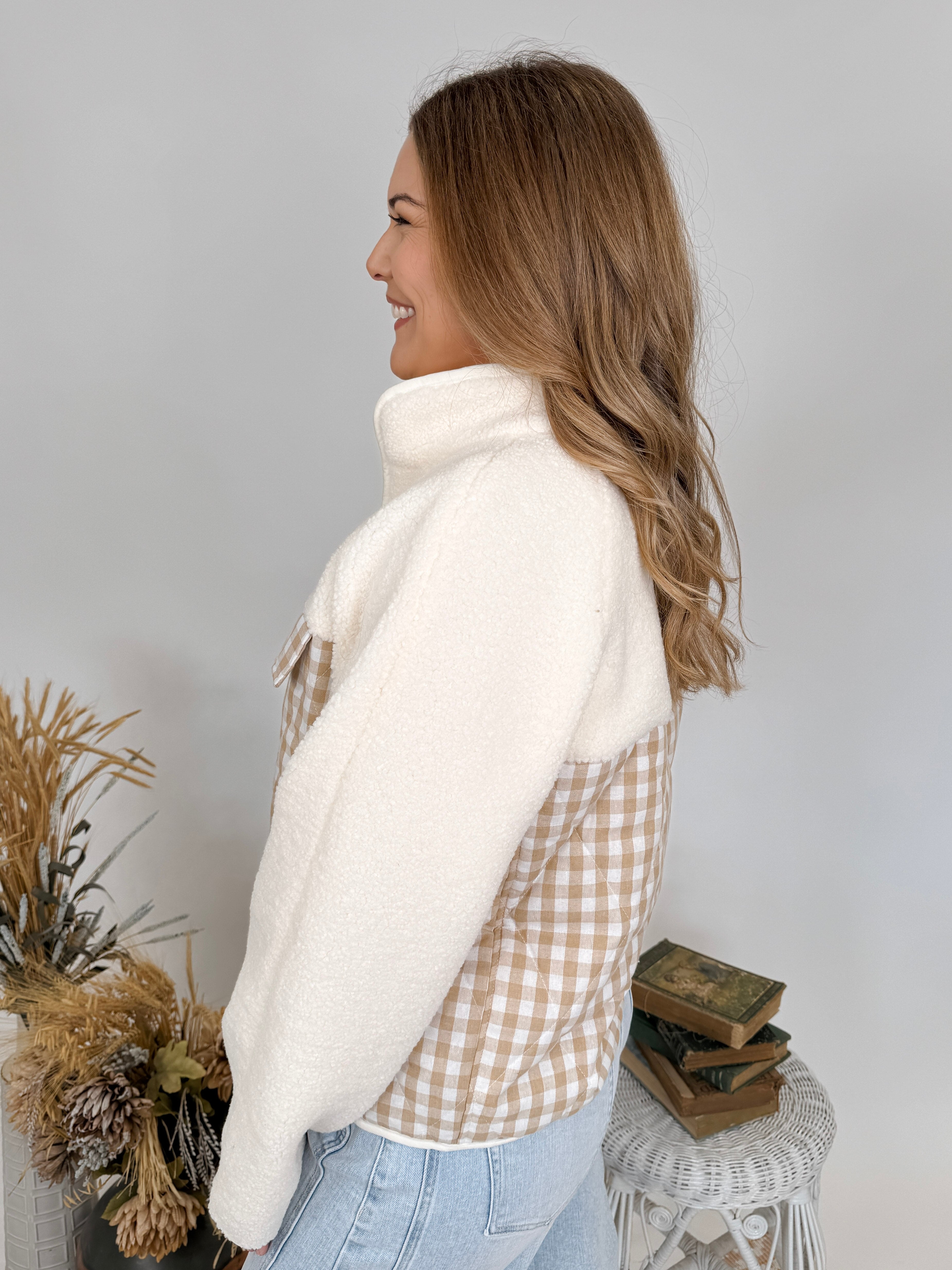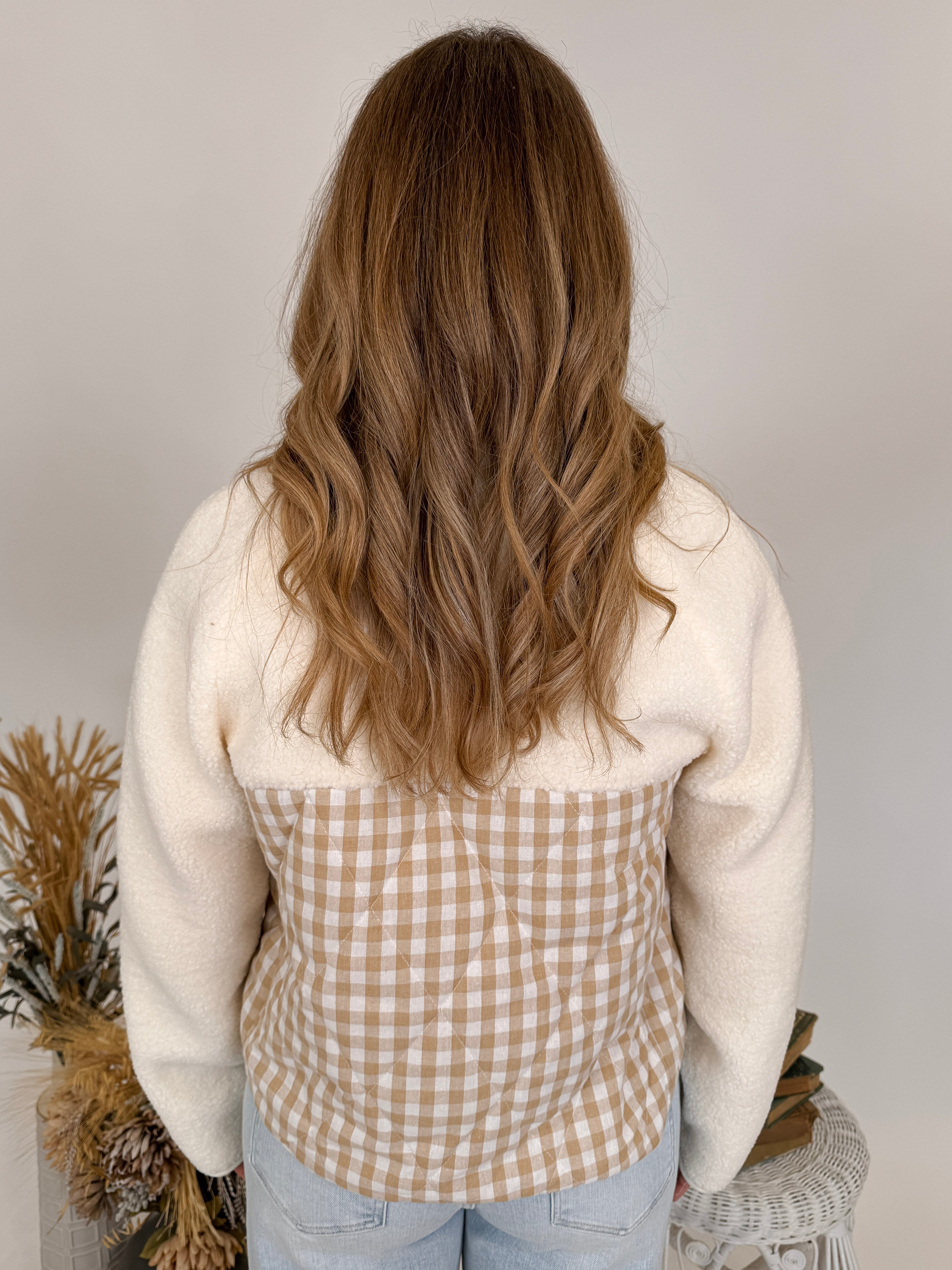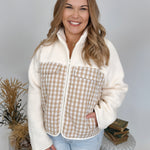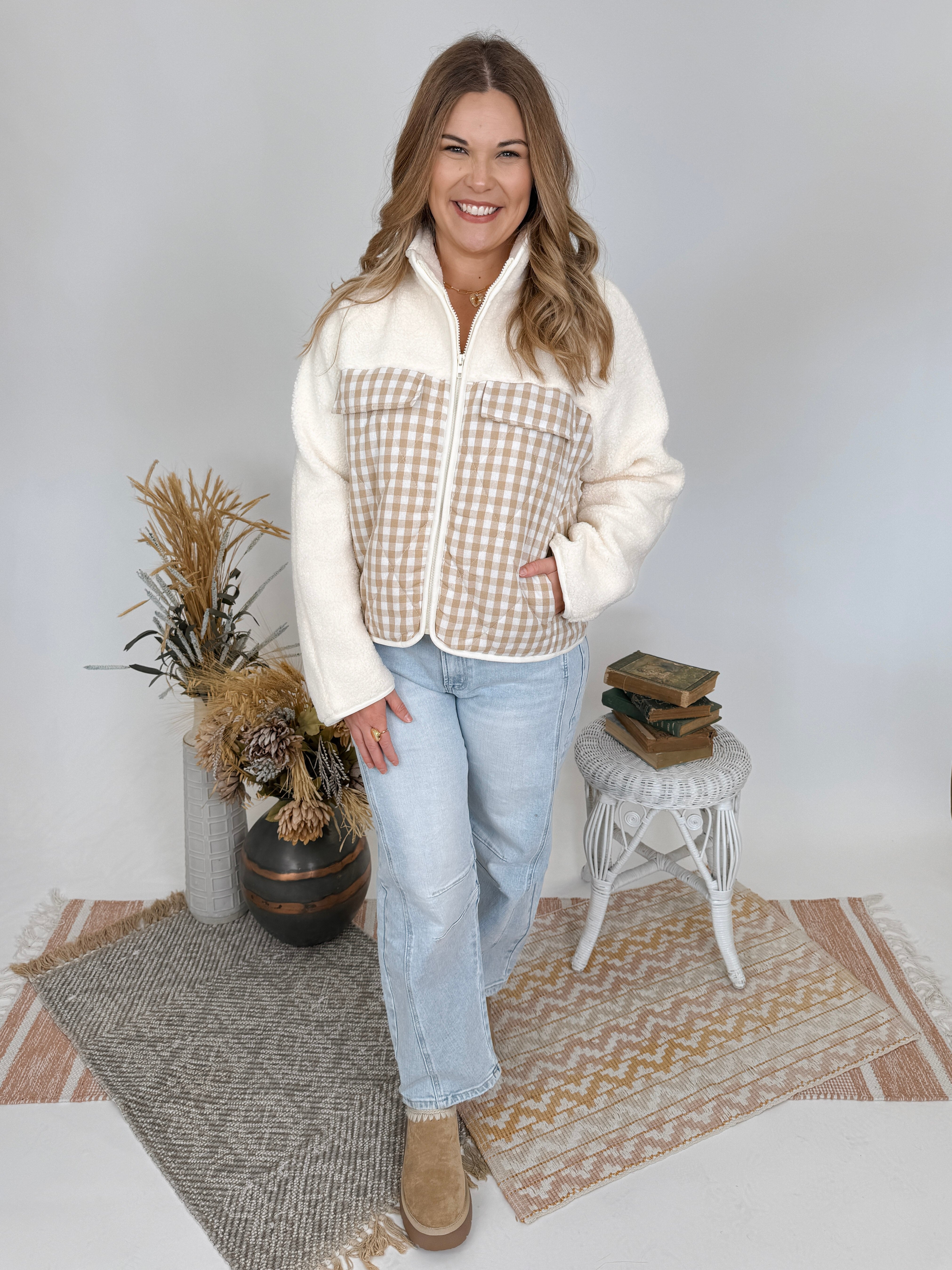 Cozy meets chic in the Parker Gingham Jacket – your new favorite layer for everything from chilly morning coffee runs to cool evening walks. This isn't just another jacket. It's that perfect combination of comfort and style that makes getting dressed feel like a treat instead of a chore. Sometimes the best pieces are the ones that make you feel wrapped in a warm hug while still looking completely put-together. The Parker Jacket does exactly that. The plush sherpa sleeves feel like heaven, while the gingham center panel adds that touch of vintage charm we all love. It's functional. It's adorable. It's the jacket you'll reach for on repeat.