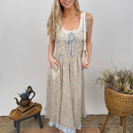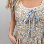 Pure cottage-core perfection. Soft floral print with blue gingham trim, pintuck details, and a flowing midi silhouette – the Patsy Dress is romantic charm embodied.
