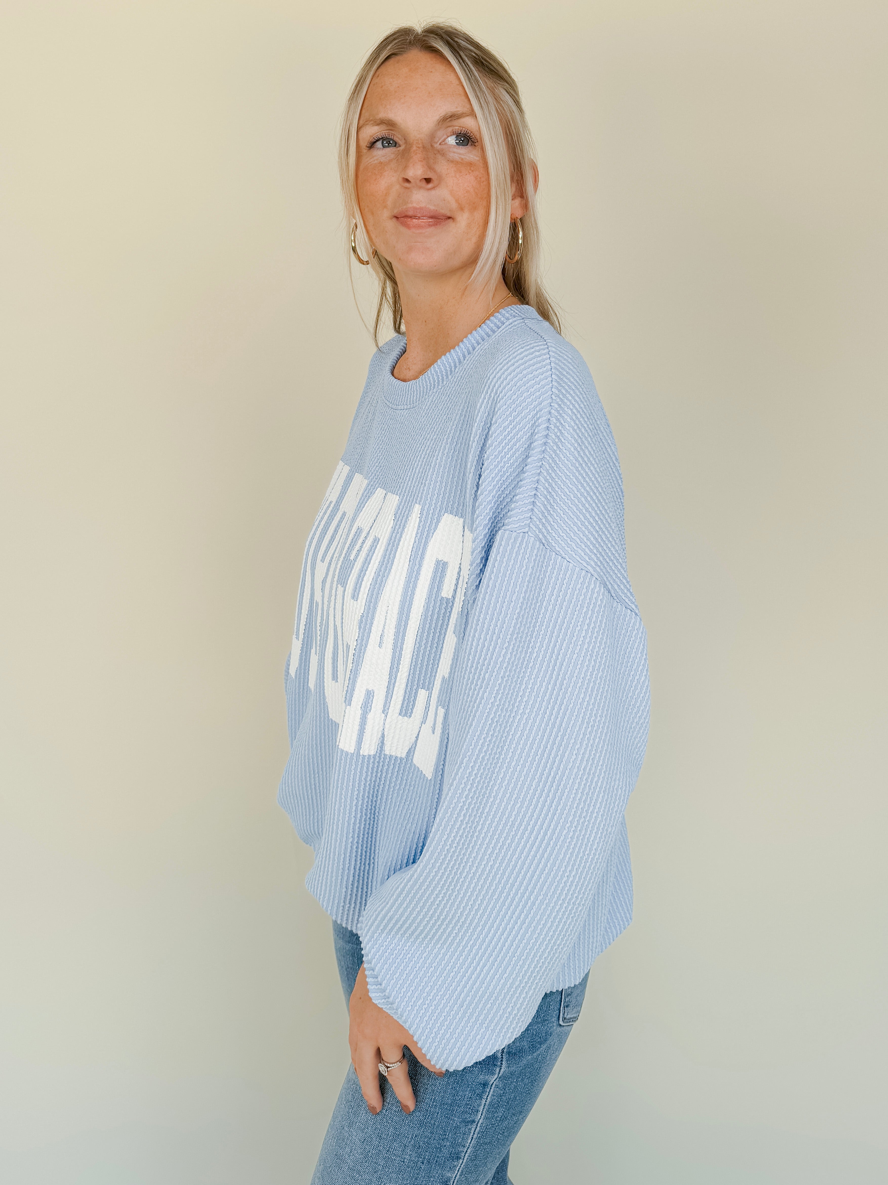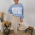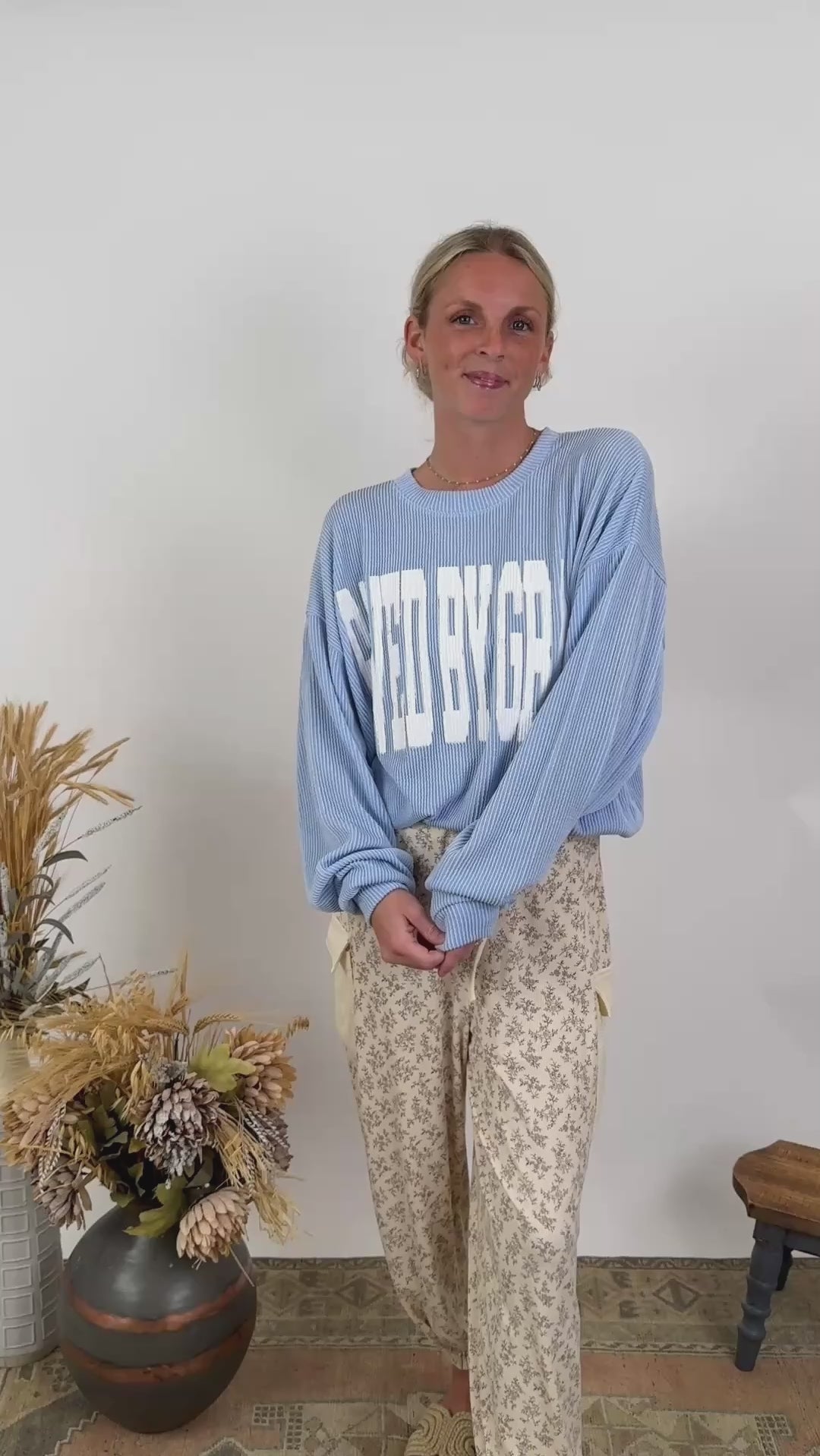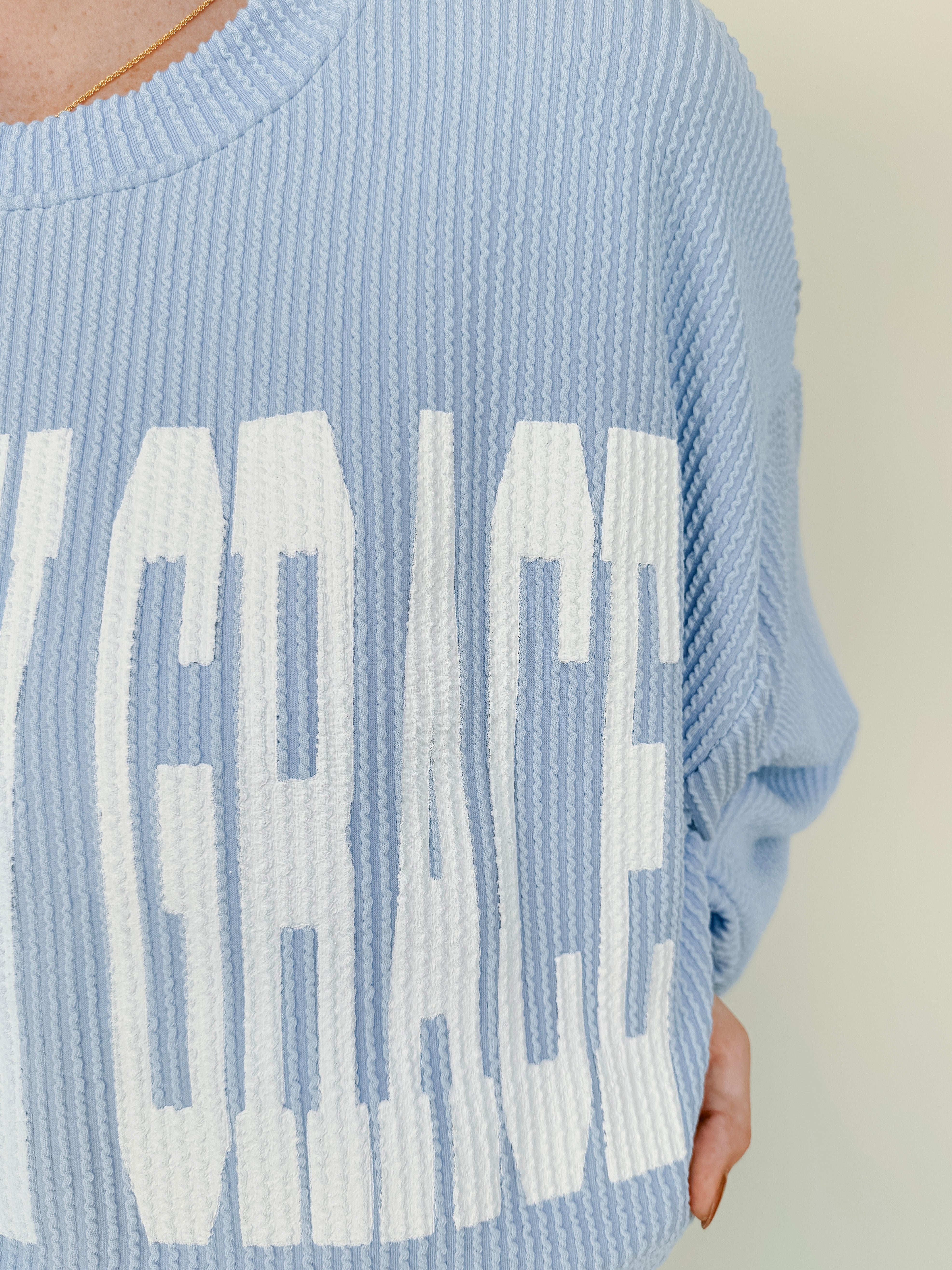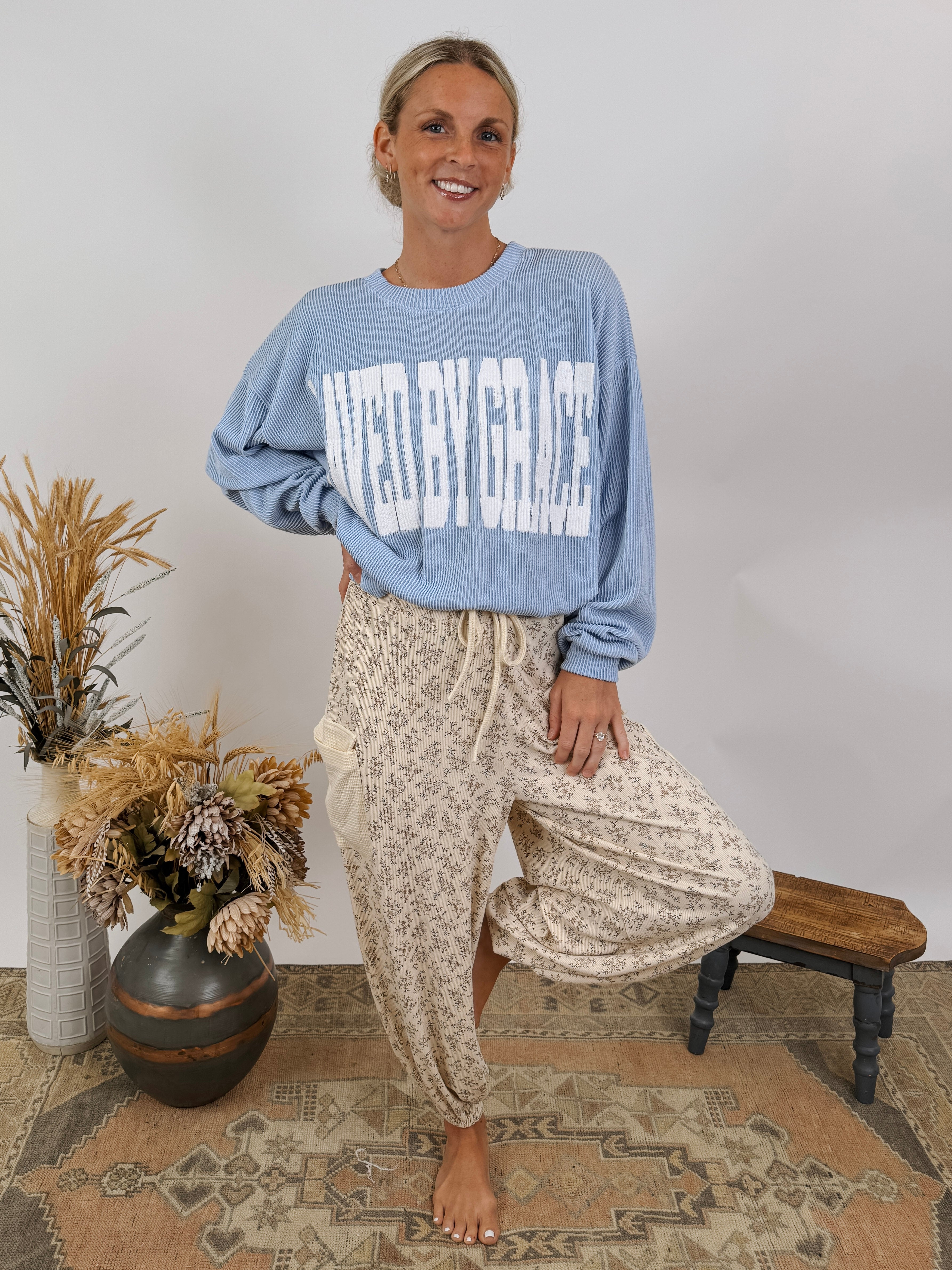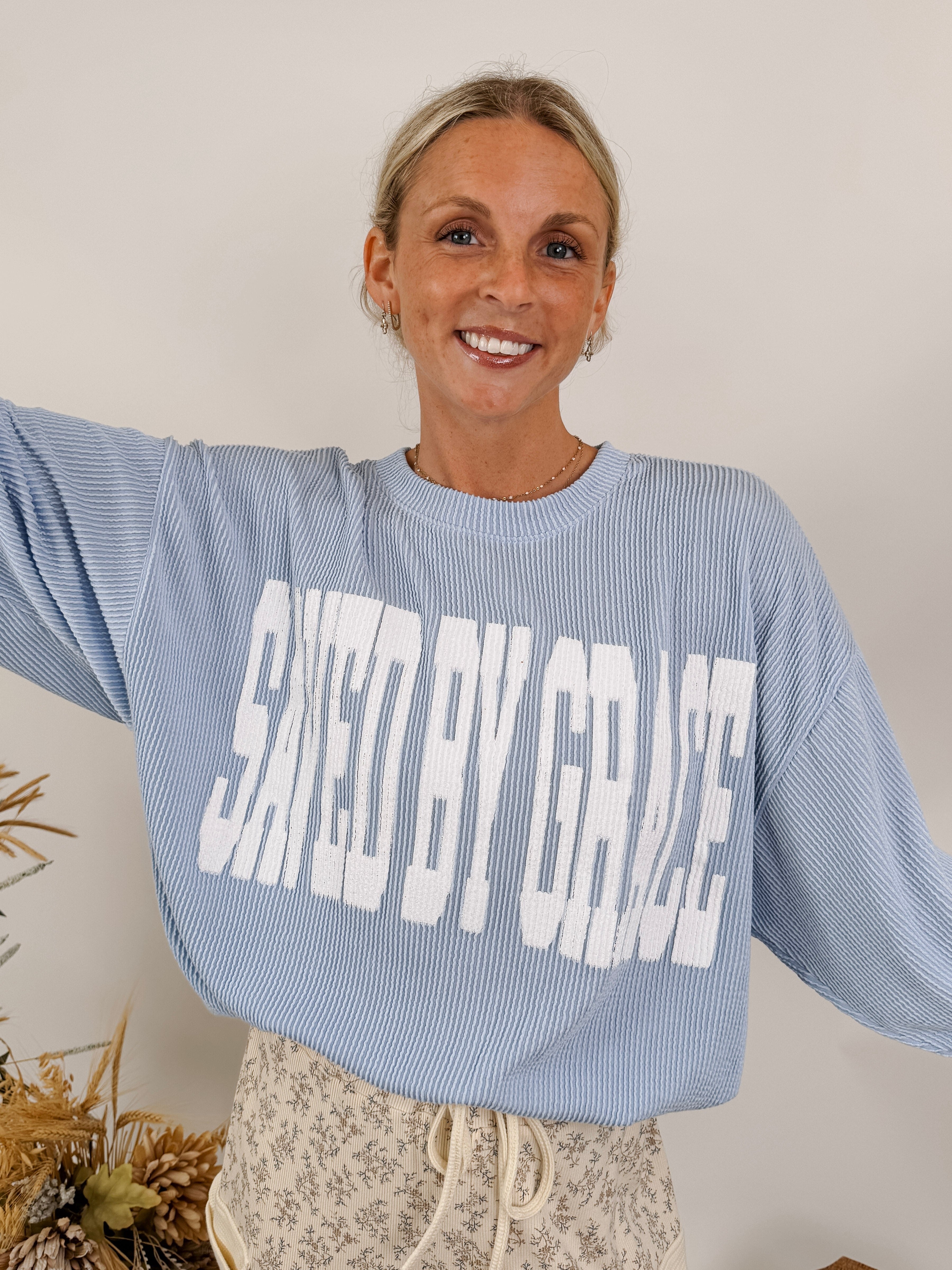 Get cozy in this bold declaration of truth while remaining chic! The Saved By Grace Sweatshirt is super soft and has a nice drape to it so that it's not too heavy - perfect for seasonal transition. It has ribbed detailing and and a band around the waist. We love to see this sweatshirt styled with leggings, jeans, or comfy pants!