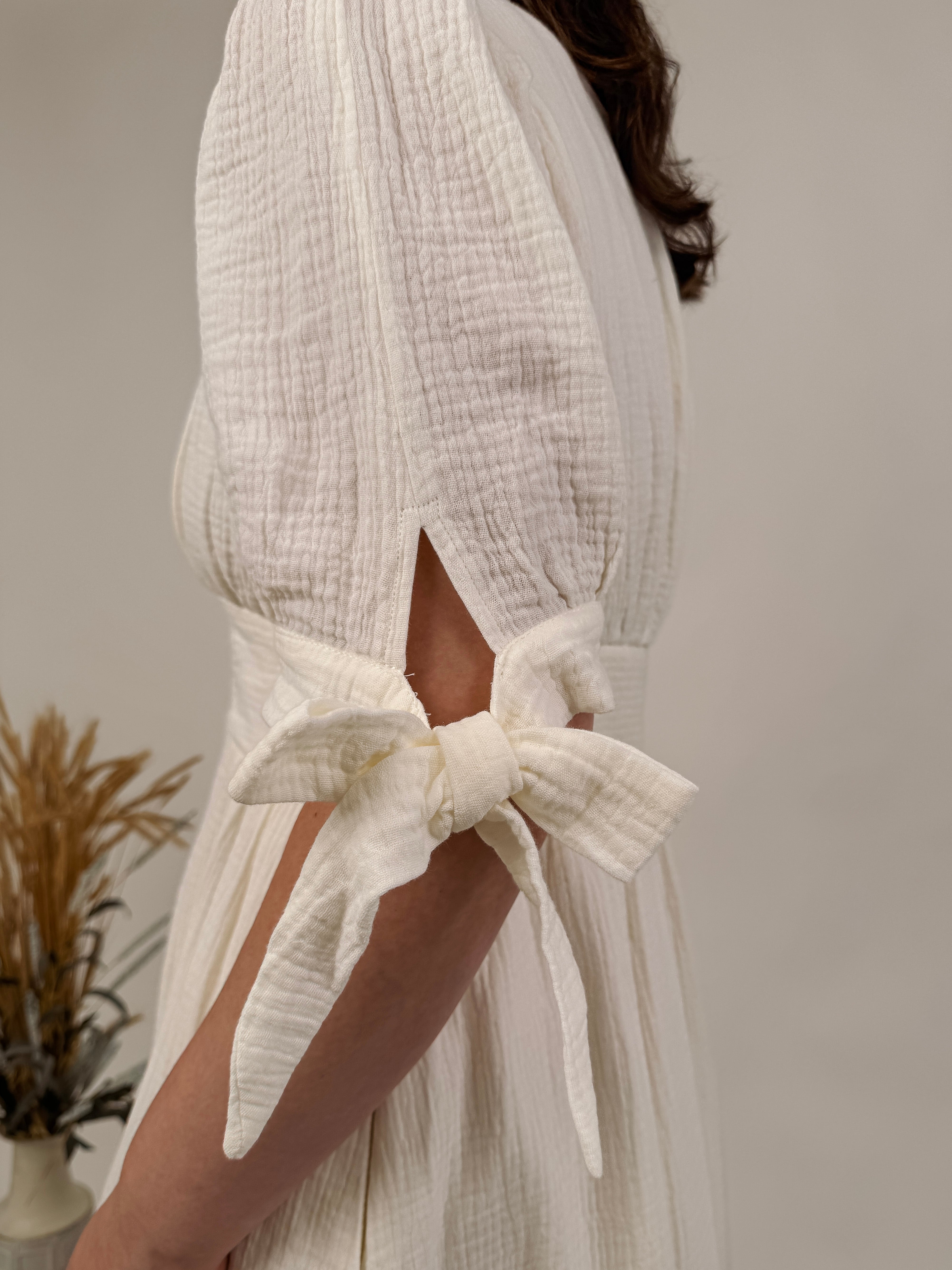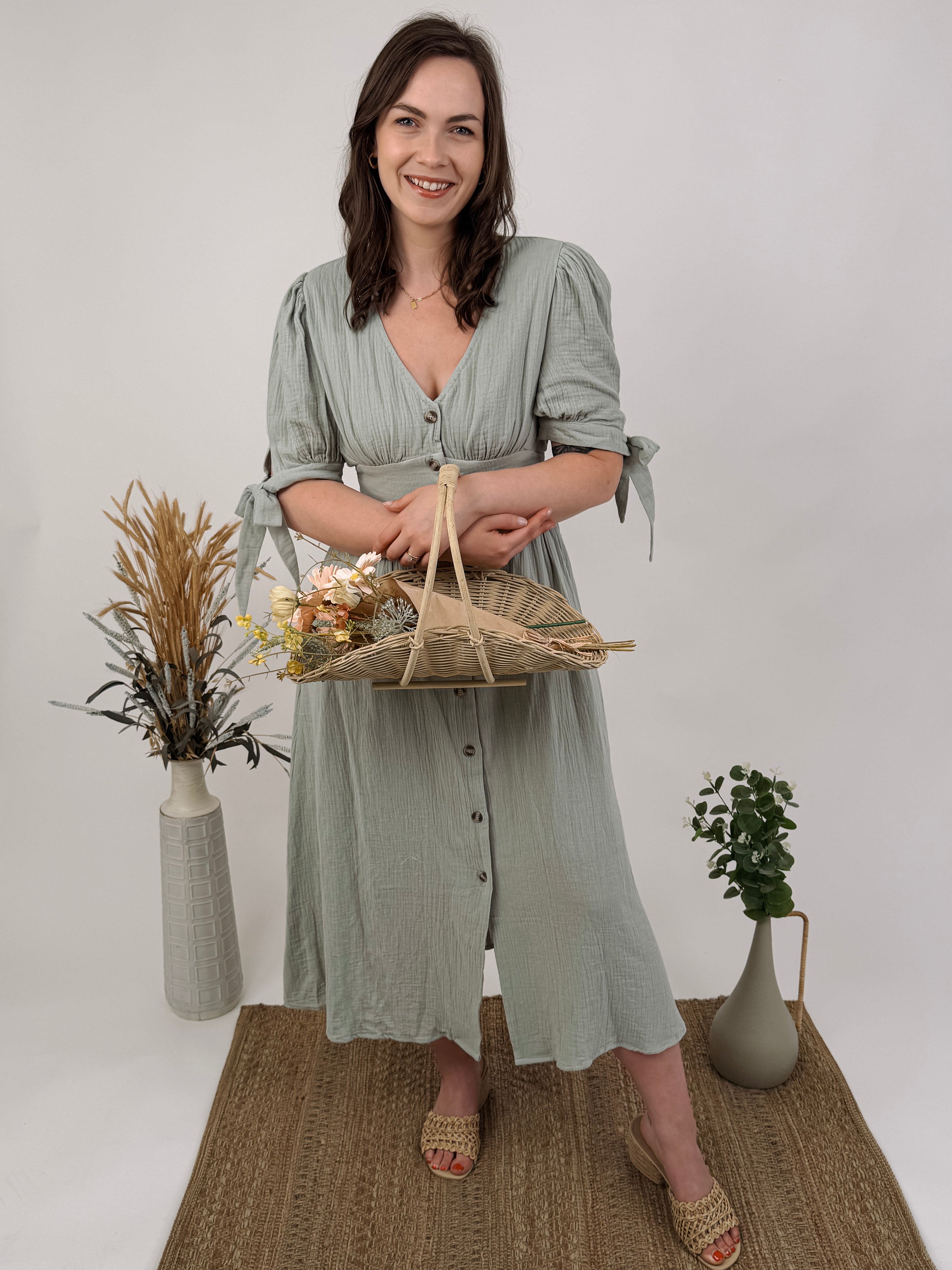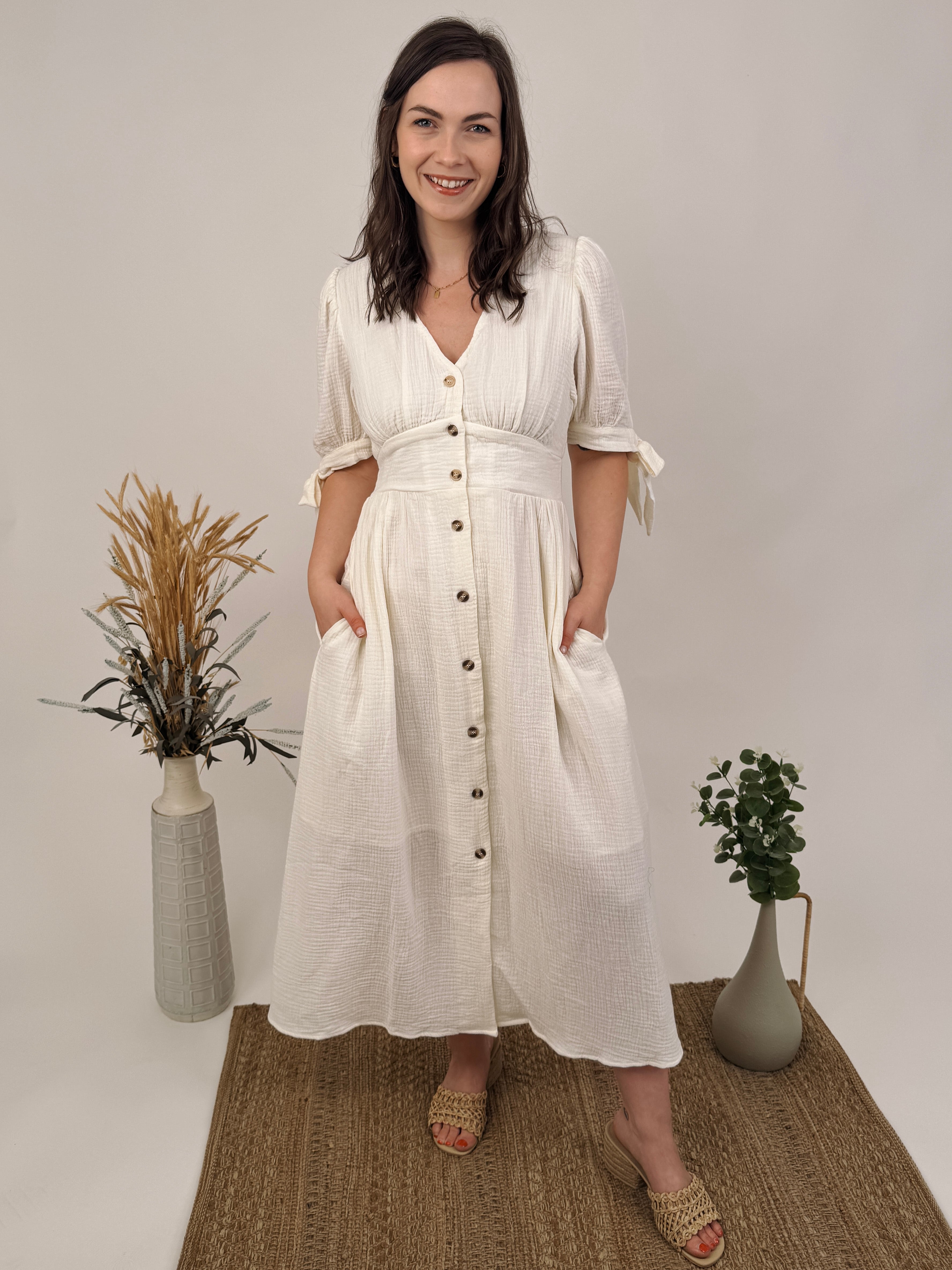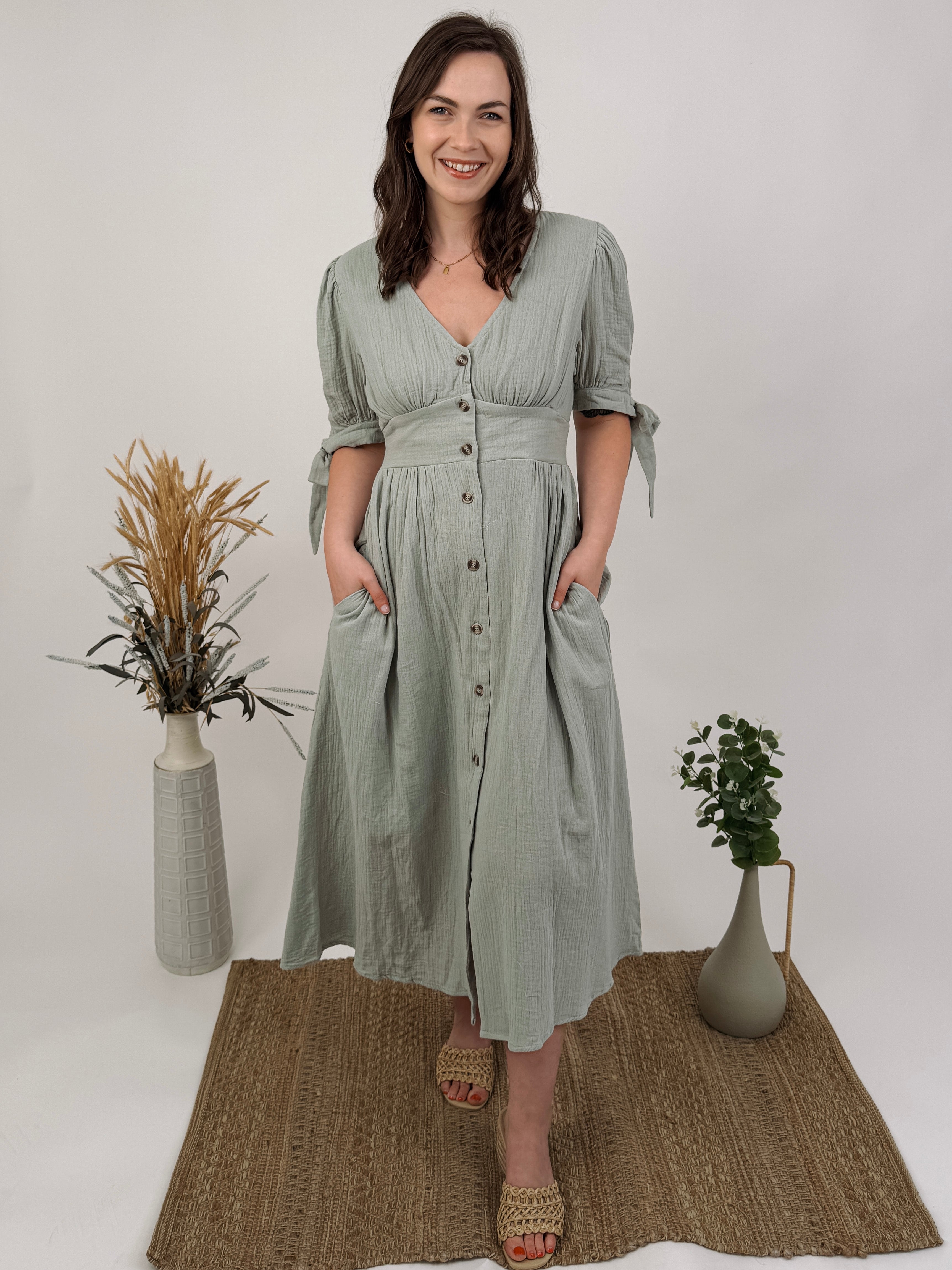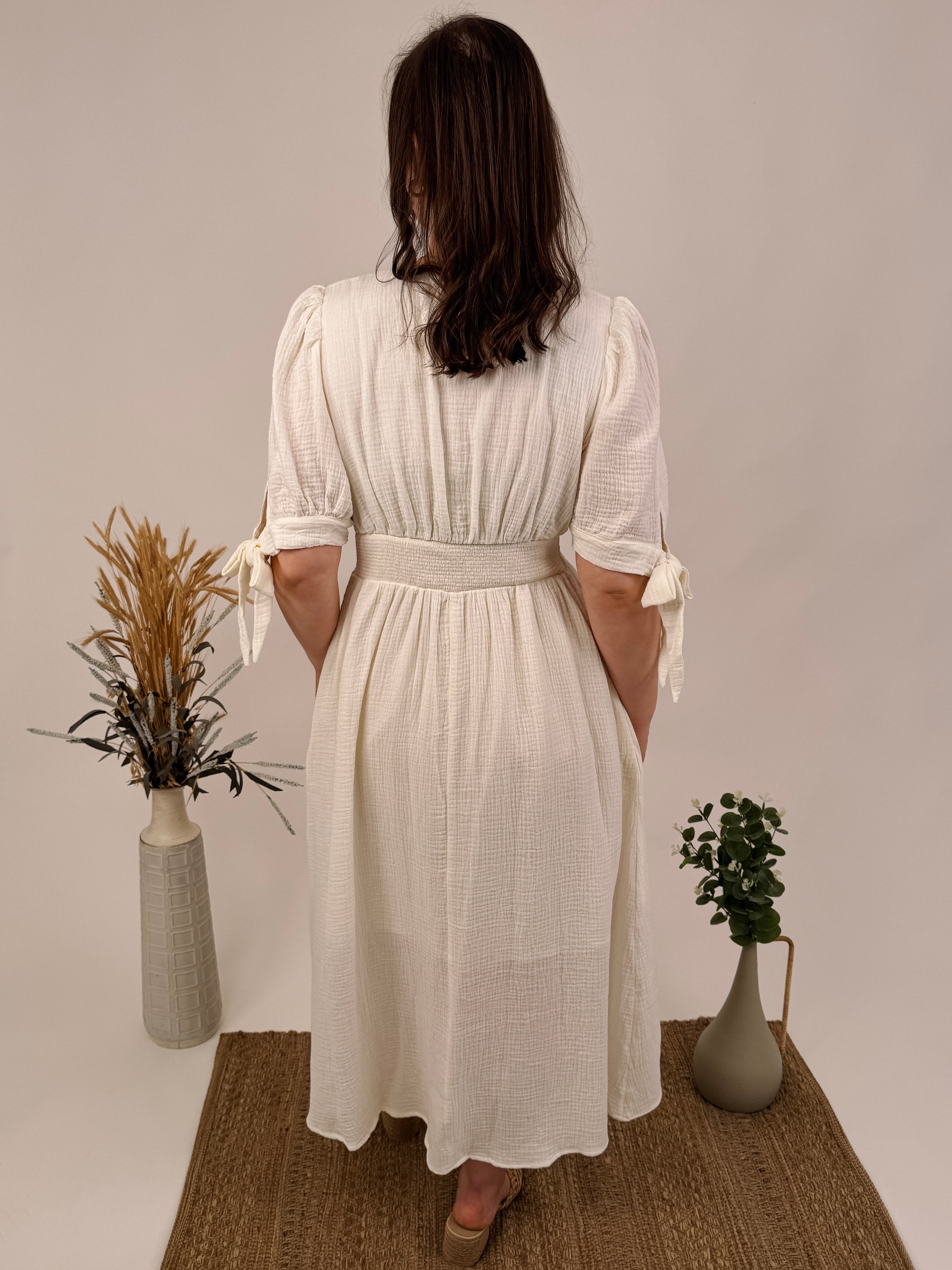 Sparks are sure to fly in this dress! It has the most soft cotton fabric, v-neckline, bow tie closures at the sleeves, and buttons down the front of the dress for design. What we love about this dress is that it has smocking around the waist in the back of the dress for a flattering and comfortable fit. We think this dress looks great styled with Idella Heel and a picnic basket. You'll be wearing this dress over & over again throughout this season and into the next.