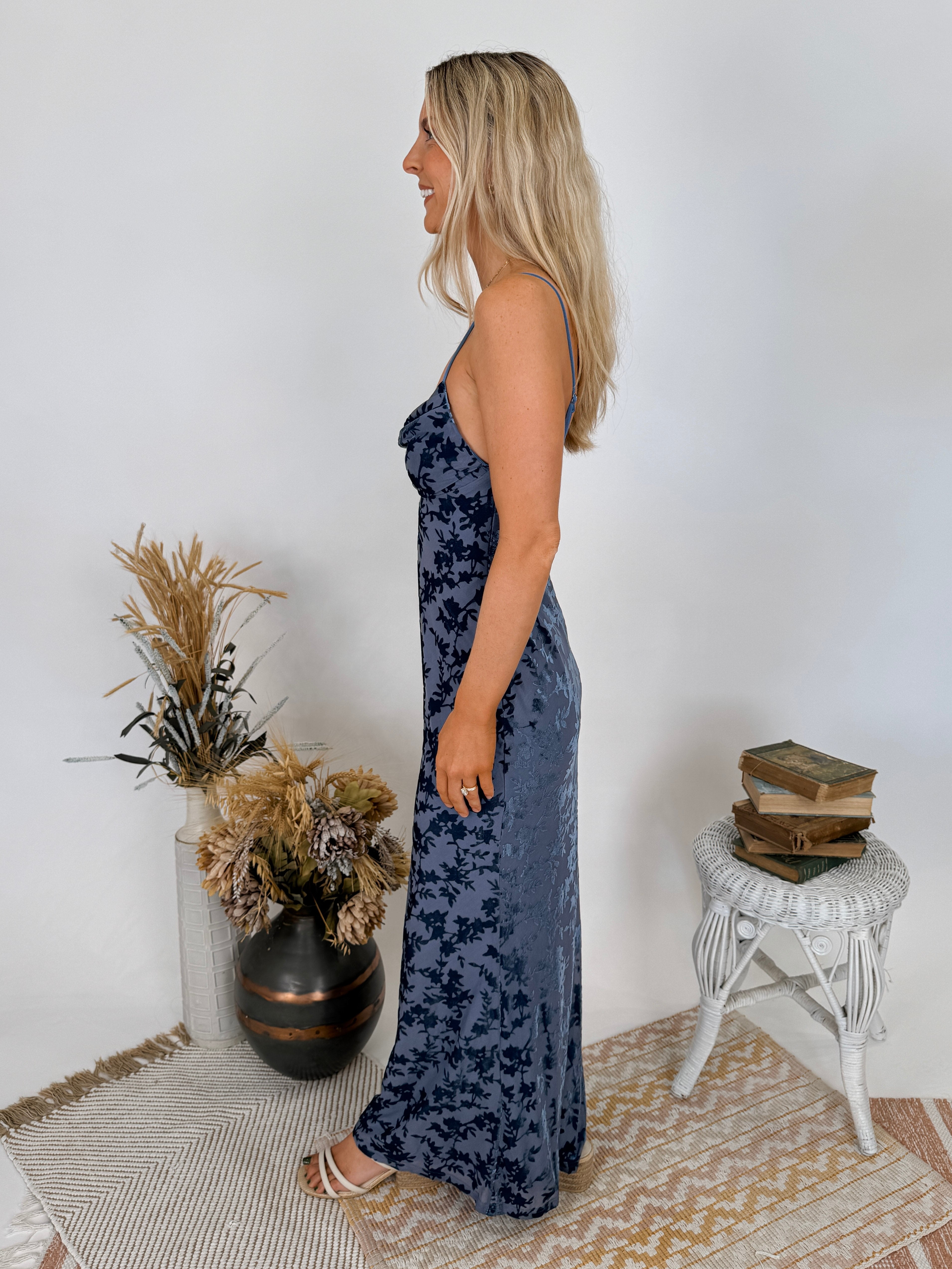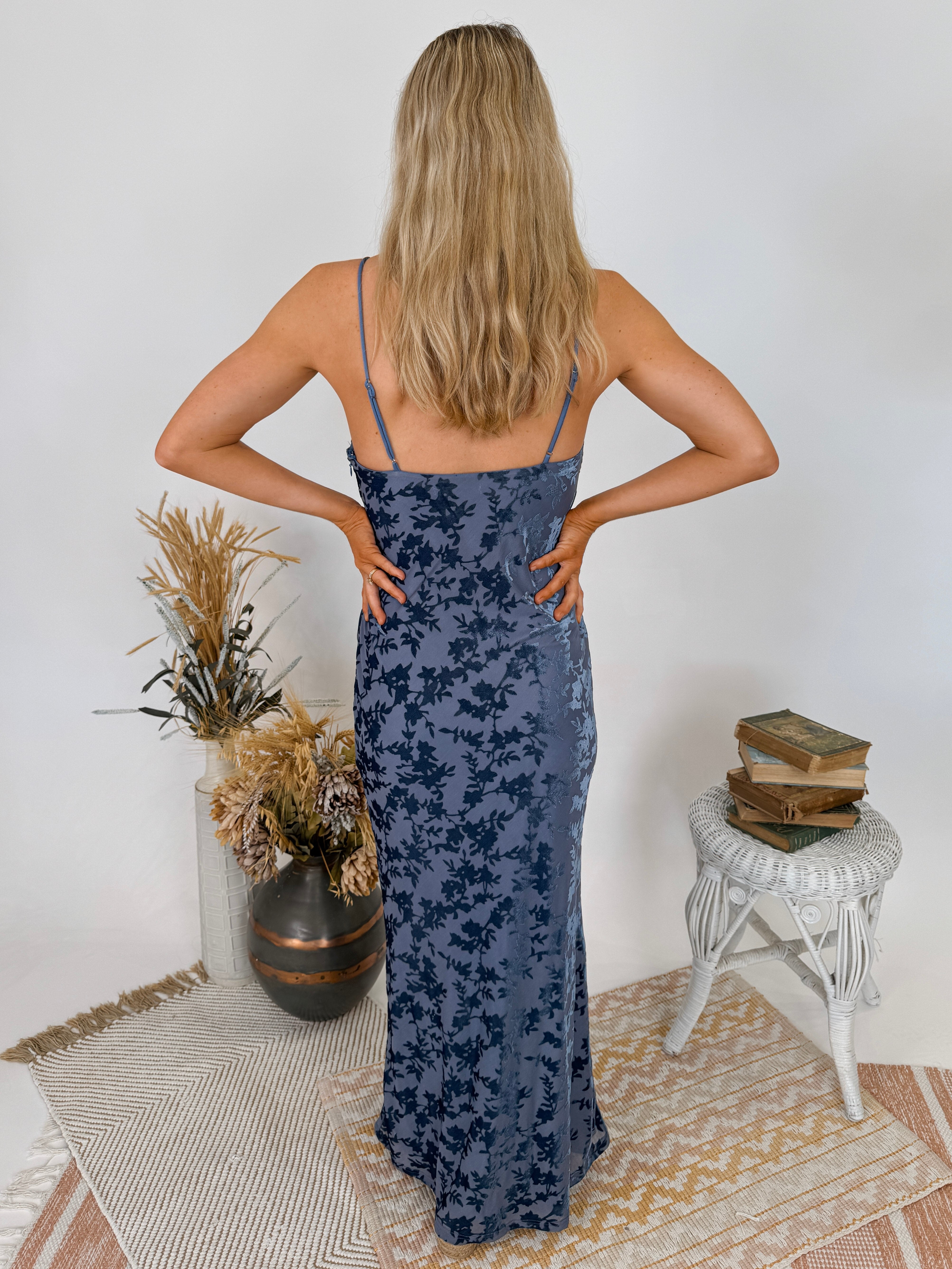 Make a statement in the Stephanie Midi Dress. This stunning navy blue velvet-burnout dress features an allover floral pattern and an elegant silhouette that's perfect for evening events and special occasions. The luxurious fabric and figure-flattering design celebrate your beautiful confidence.