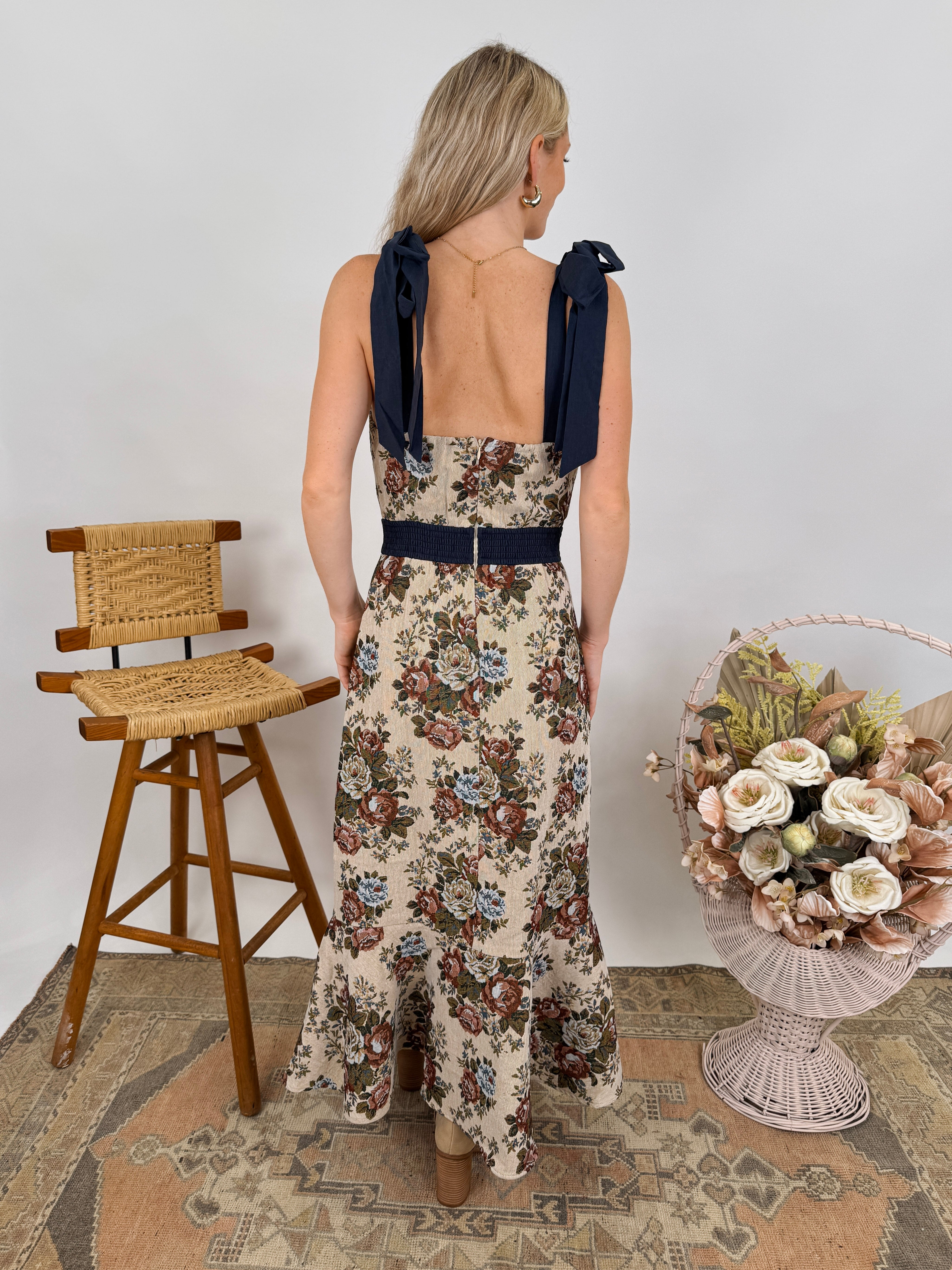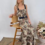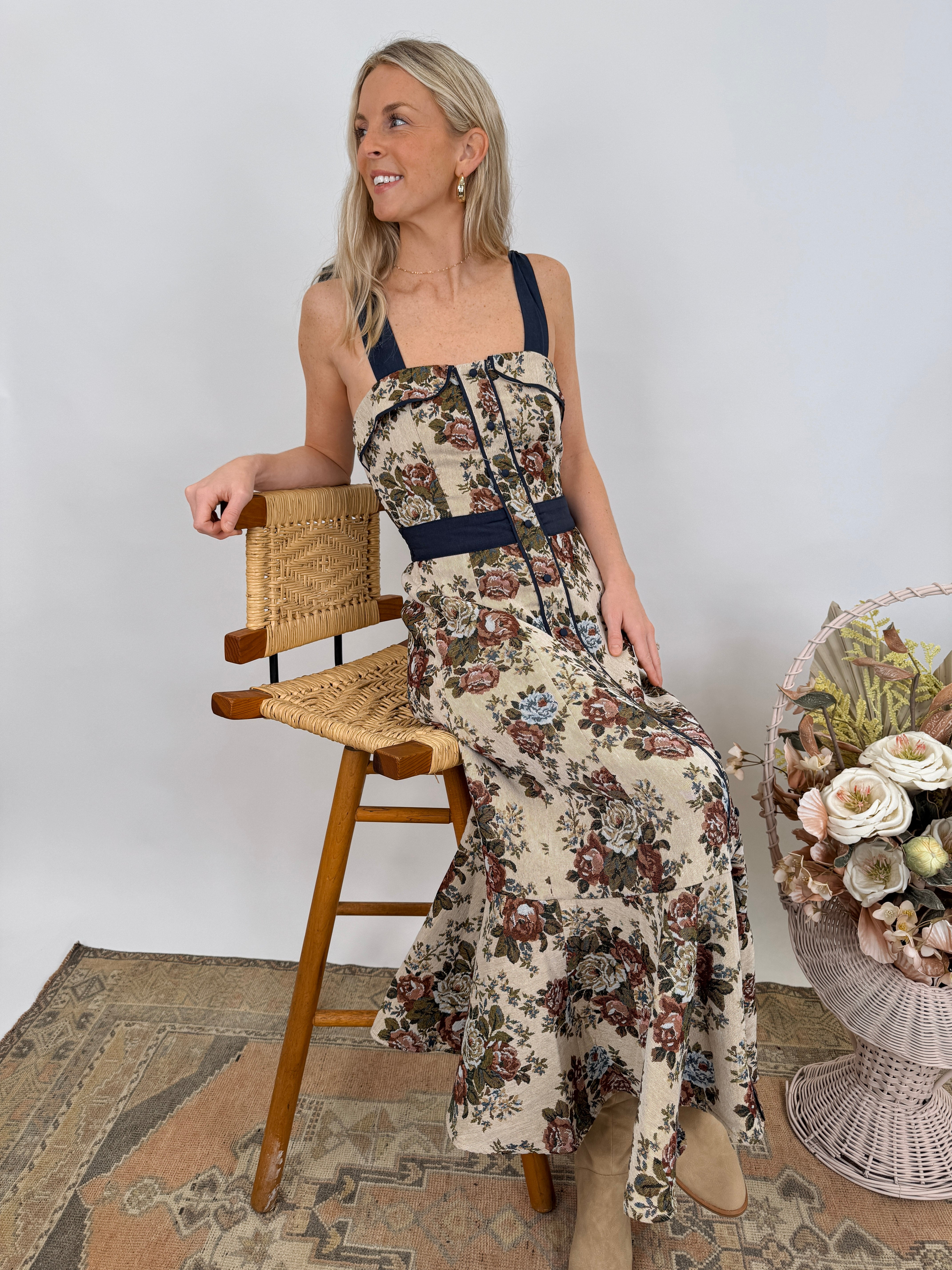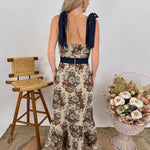 The Tiffany is oh so dreamy dolls! This tapered vintage floral print dress exudes timeless charm & feminine elegance. The fabric features a delightful floral pattern that pops on the neutral background. The fitted silhouette hugs the body in all the right places, gradually flaring out at the hem for a flattering shape. The bow tie shoulder straps add a darling touch, allowing for adjustable comfort & a sweet, romantic detail. Running down the front, a row of buttons enhancing the vintage aesthetic. The overall design combines classic elements with a modern twist, making it perfect for various occasions!