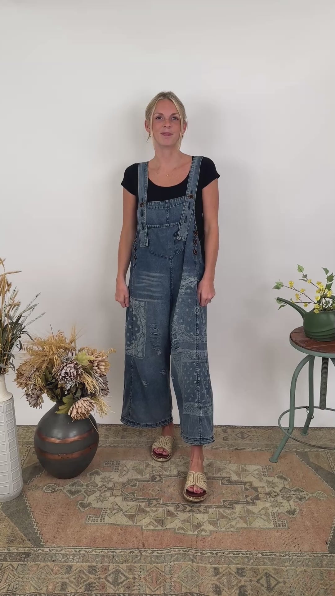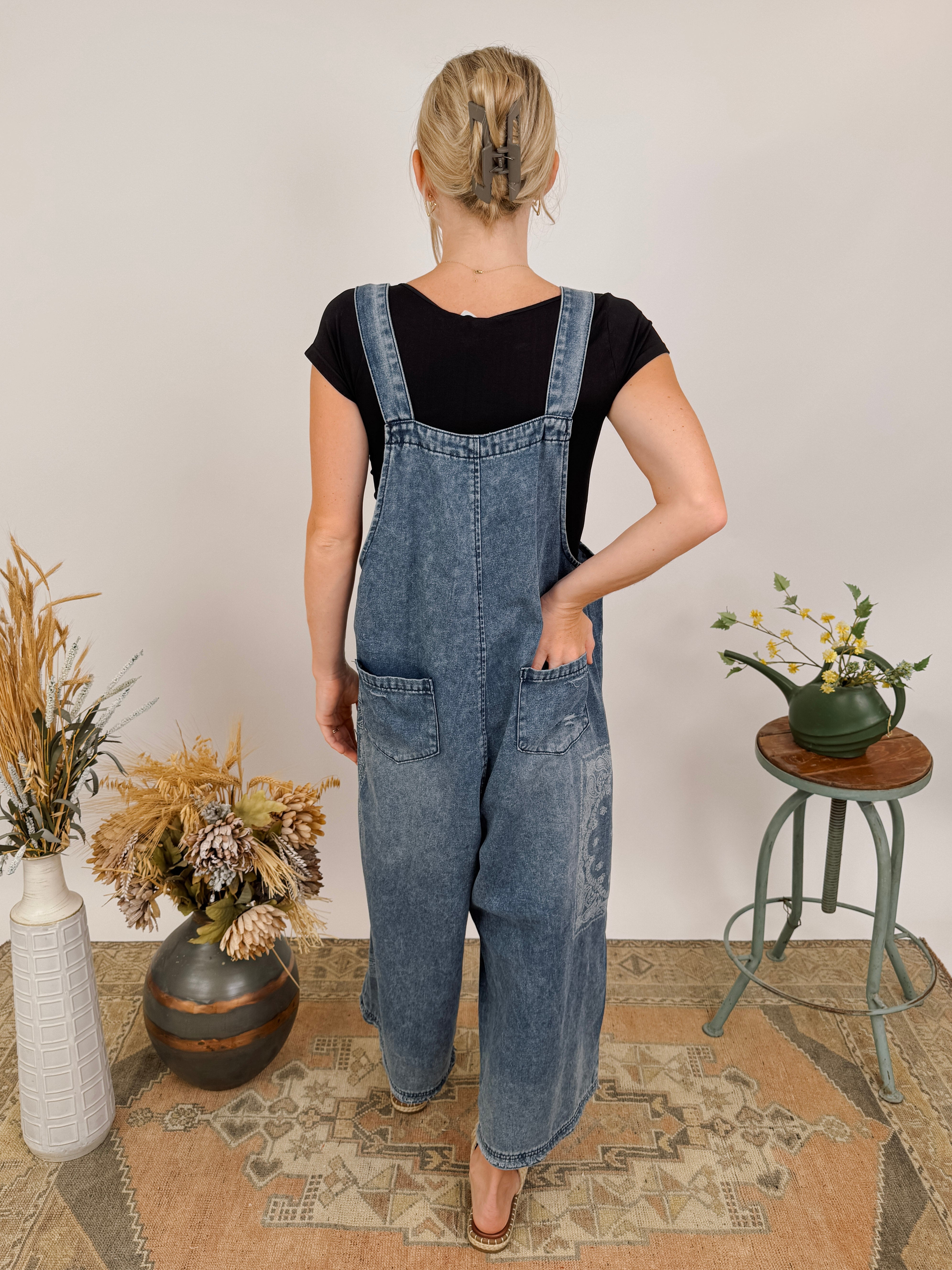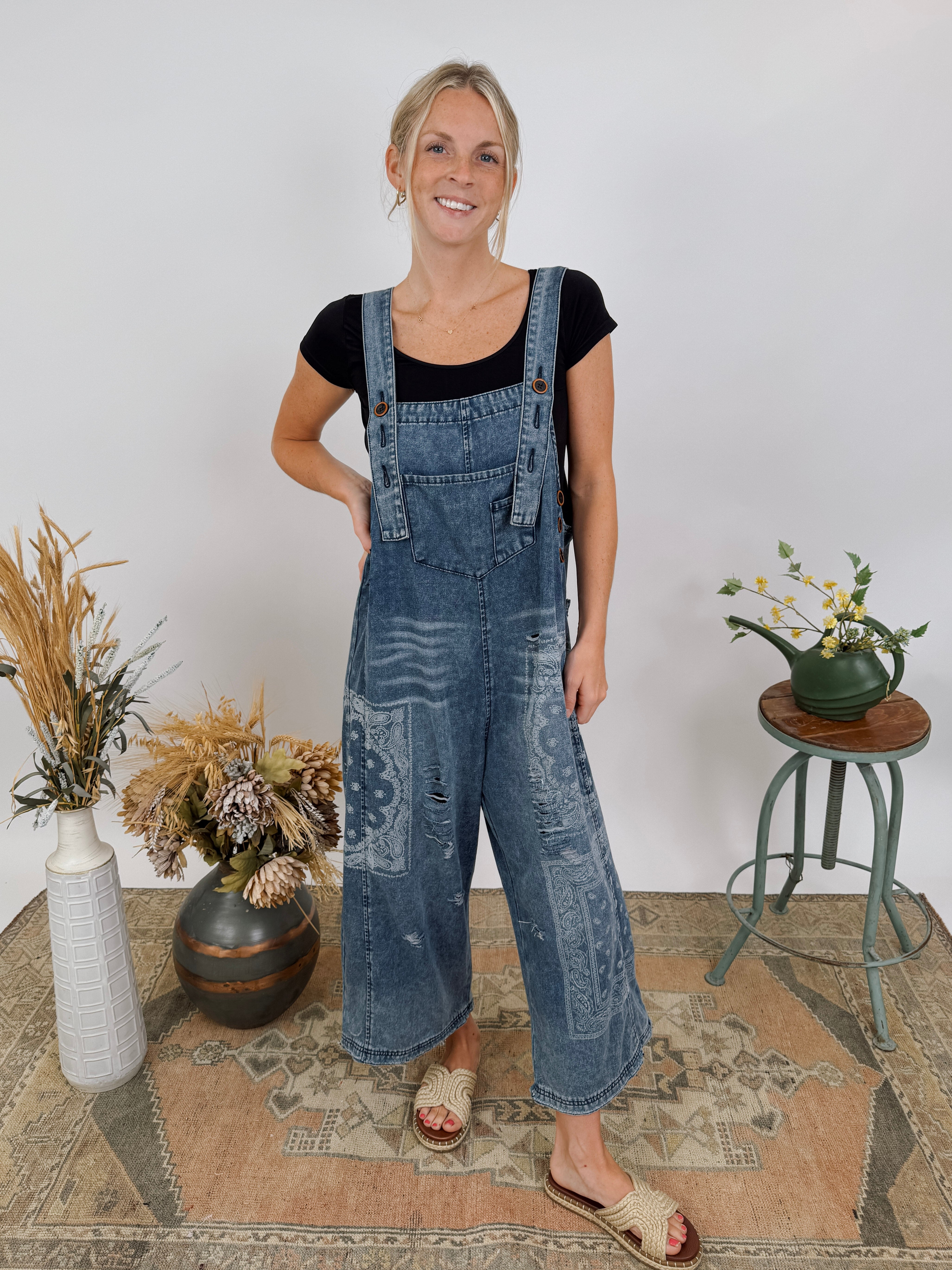 Okay cool mom, this one's for you! The Torn Between Overalls have a vintage washed look, floral pattern, adjustable button closure for the sleeves, and a roomy fit. Lindsay has styled a fitted tee underneath, but we could also see a graphic tee or tank styling very well with it. We recommend sizing down in this piece.