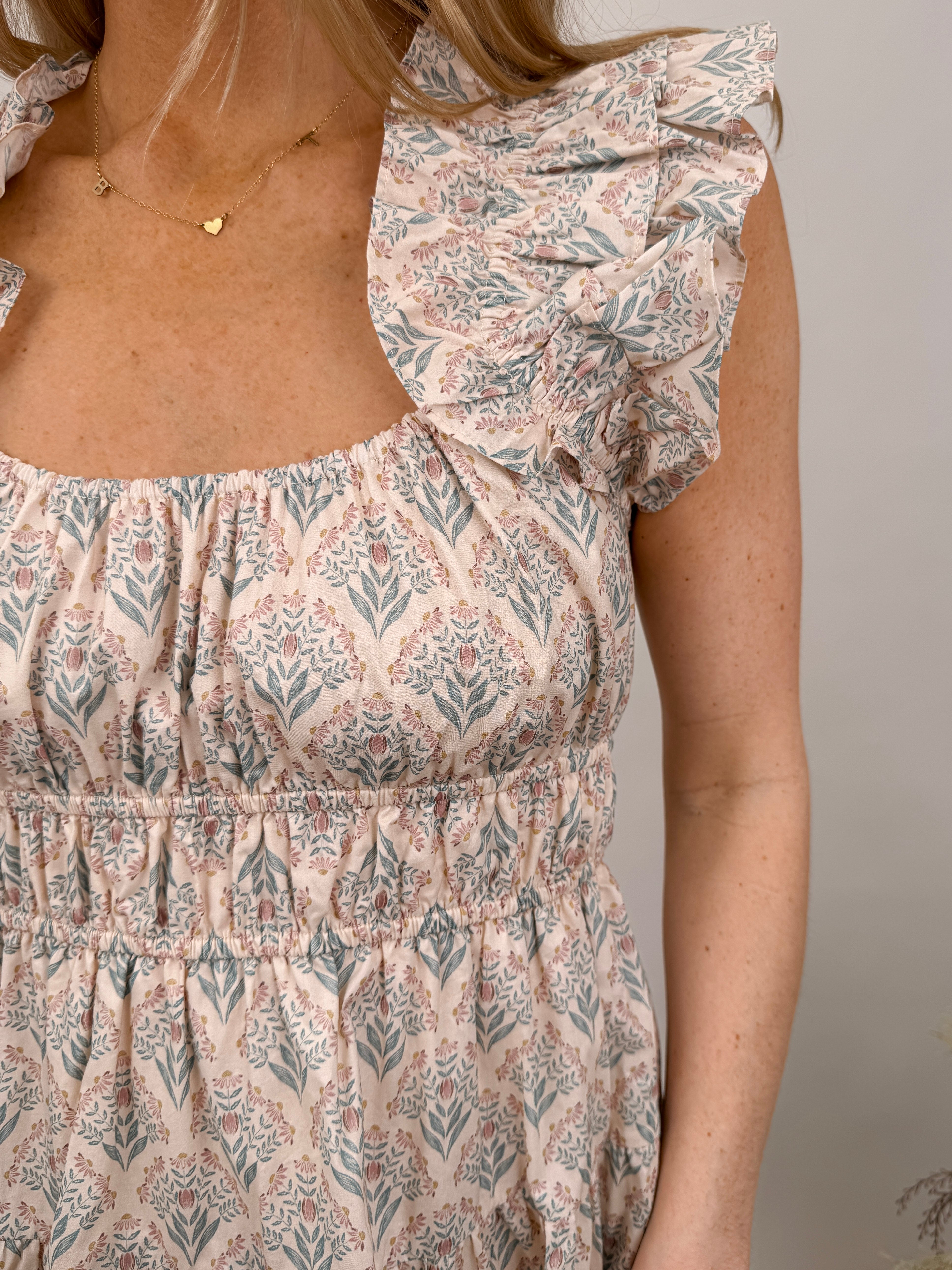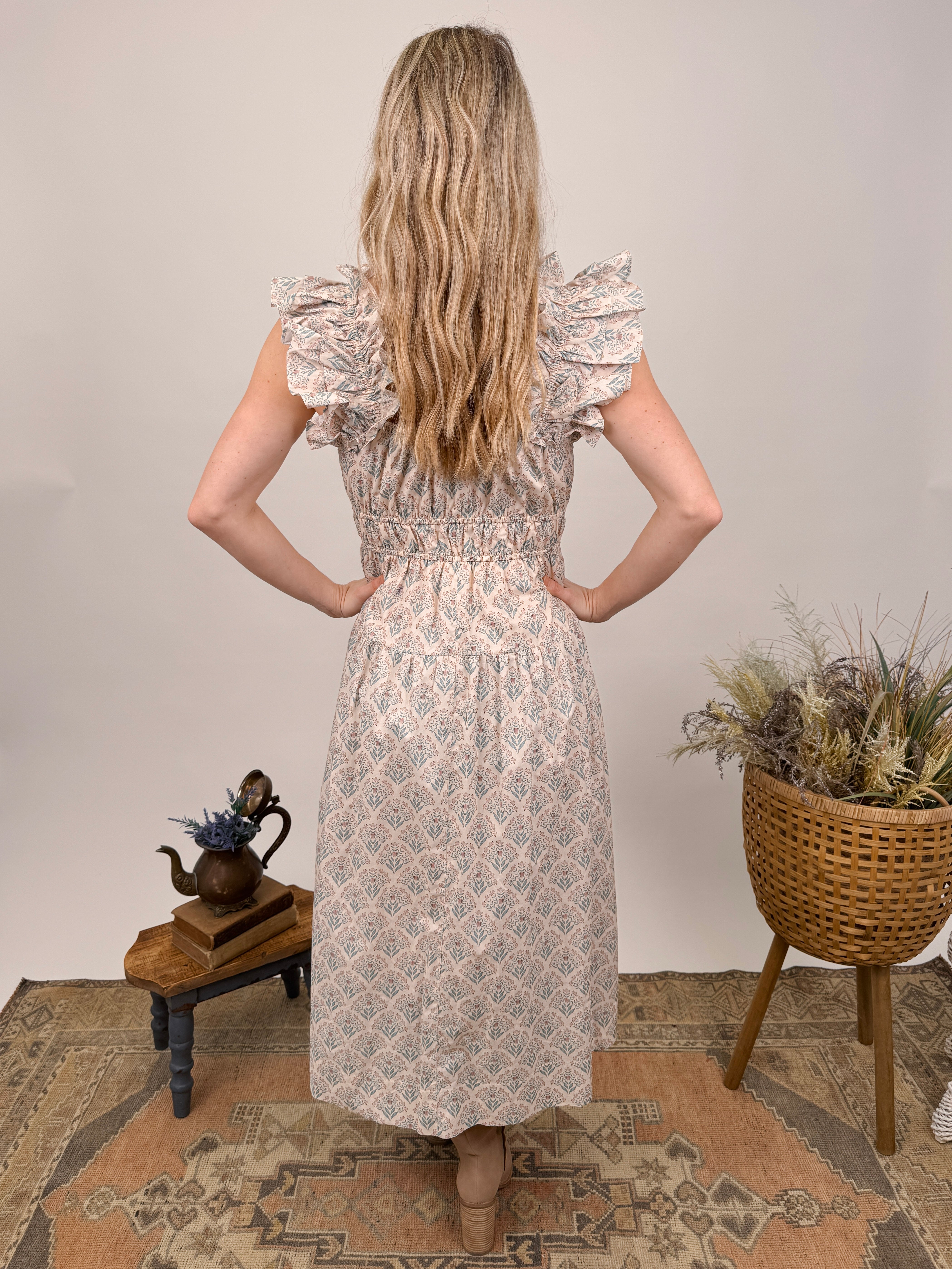 Romance meets ease. Soft geometric print with dramatic ruffle sleeves and smocked waist—the Tracy Dress is cottage-core charm perfected.
